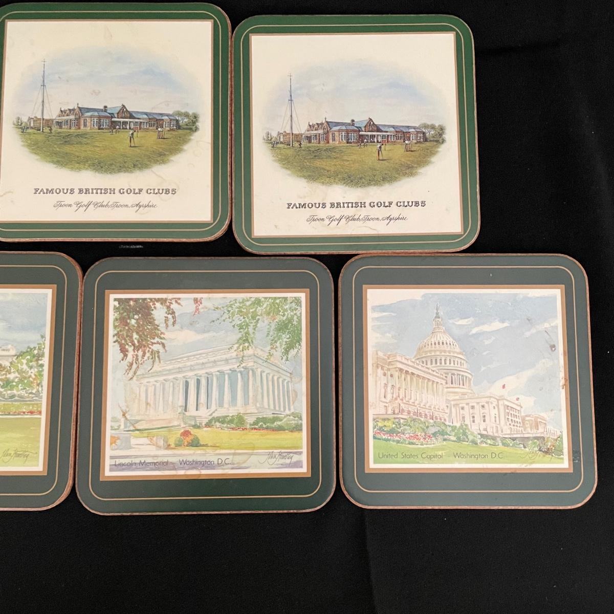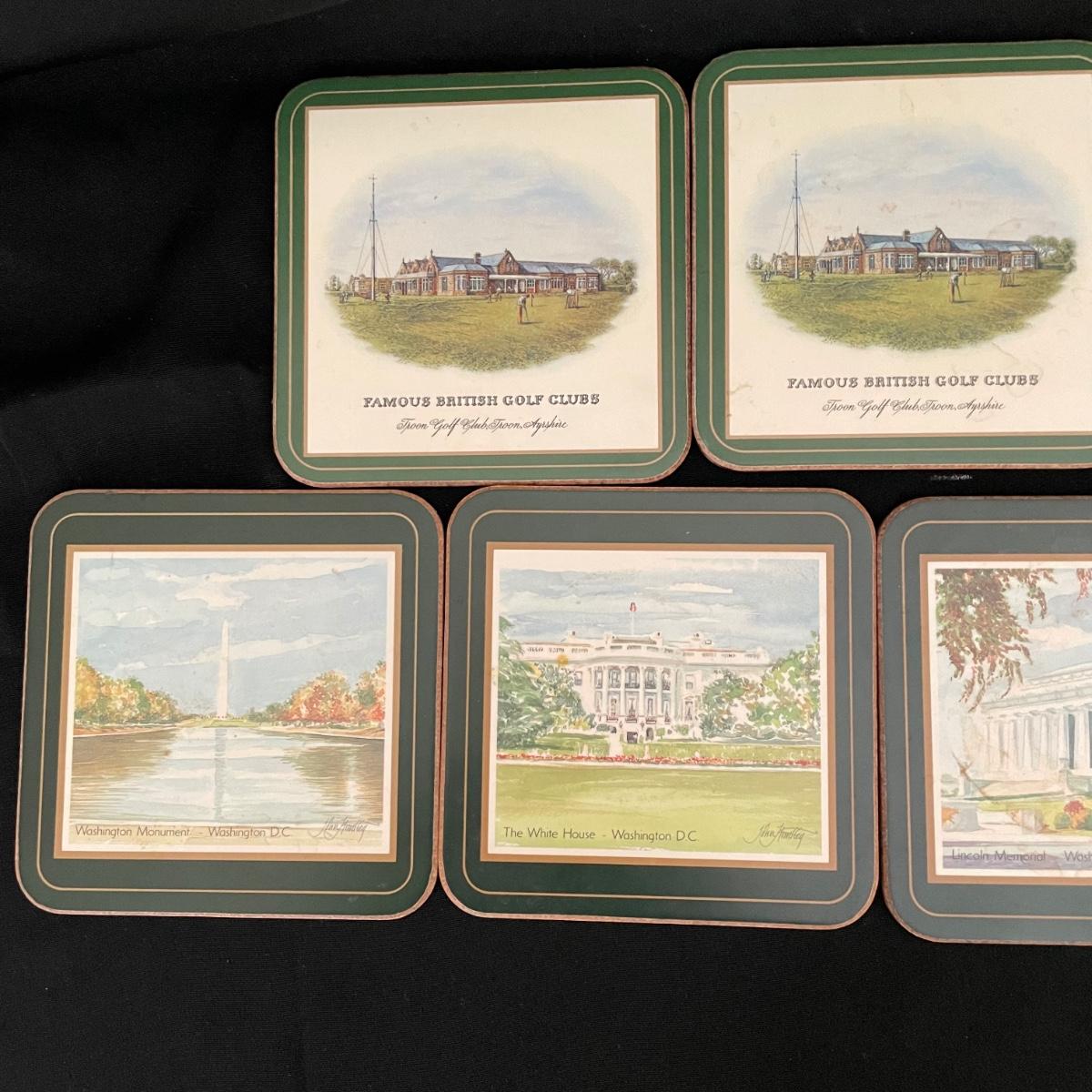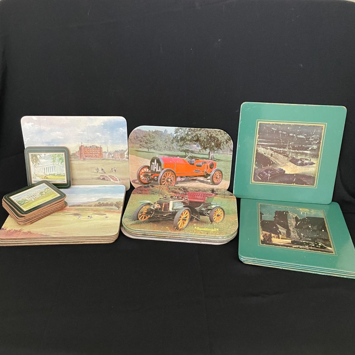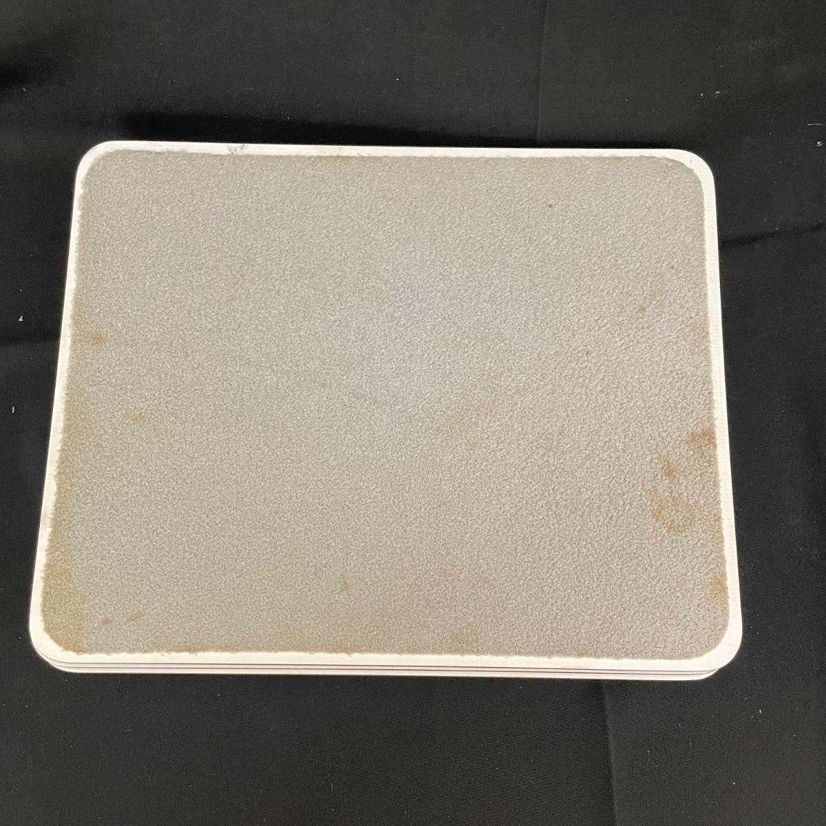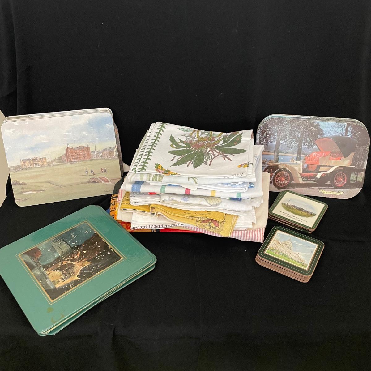 Three sets of vintage hard placemats and seven coasters with either cloth or cork bottoms. They range in size from 10” x 7.75” to the coasters at just over 4” square. Lot includes a fun variety of tea towels plus three vinyl vintage aprons and two cloth aprons. The hangers are not included, but can be found in the household lot. See images. Shipping available.