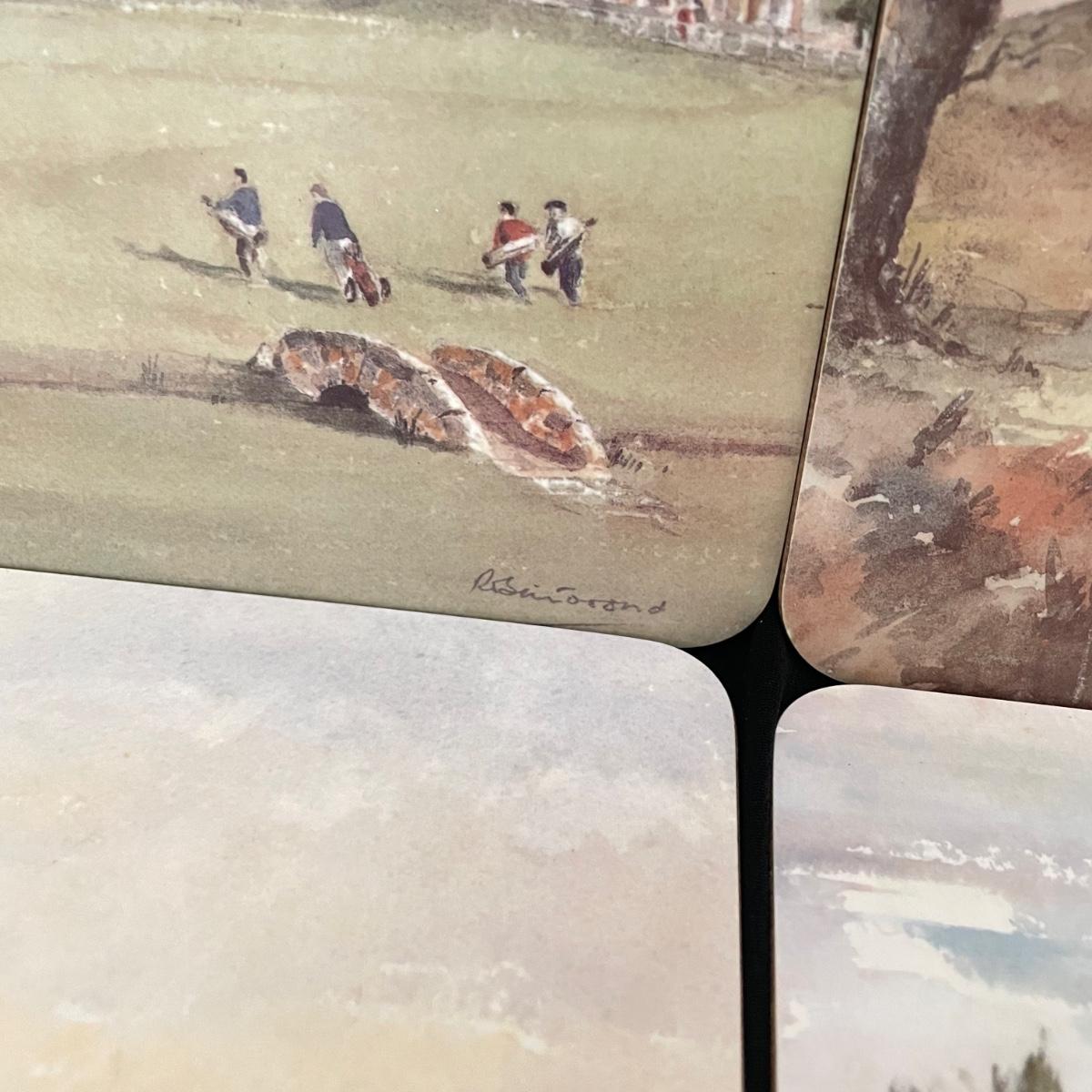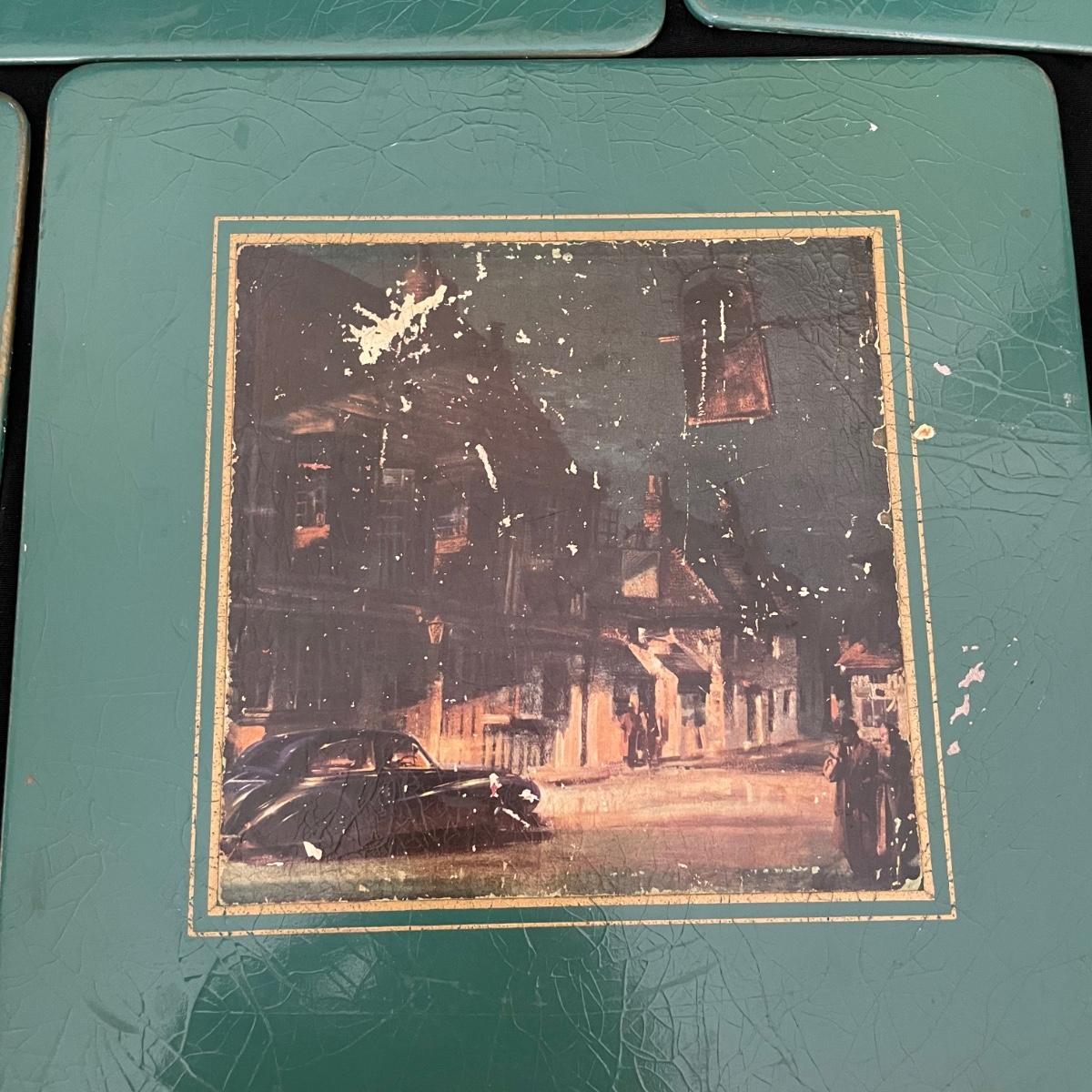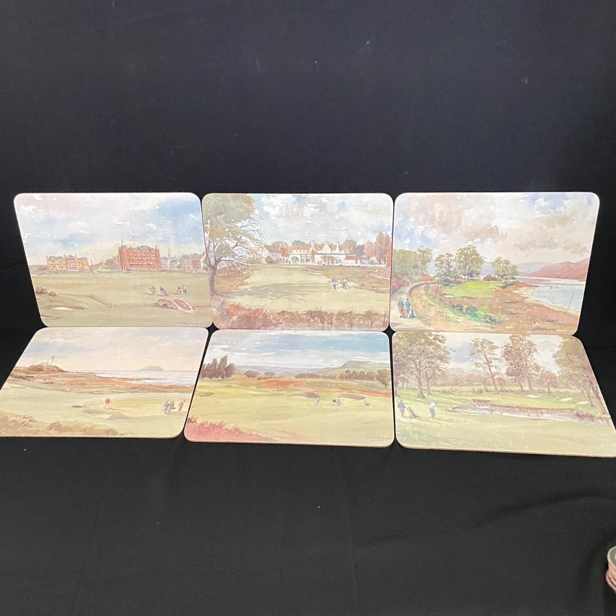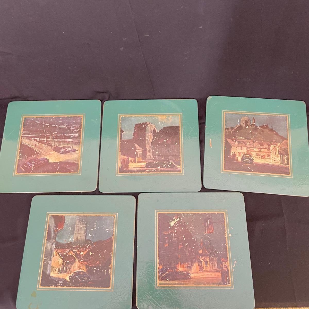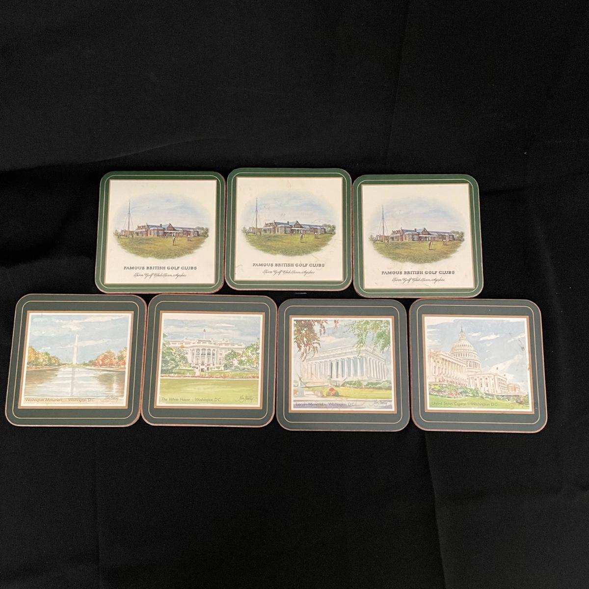 Three sets of vintage hard placemats and seven coasters with either cloth or cork bottoms. They range in size from 10” x 7.75” to the coasters at just over 4” square. Lot includes a fun variety of tea towels plus three vinyl vintage aprons and two cloth aprons. The hangers are not included, but can be found in the household lot. See images. Shipping available.