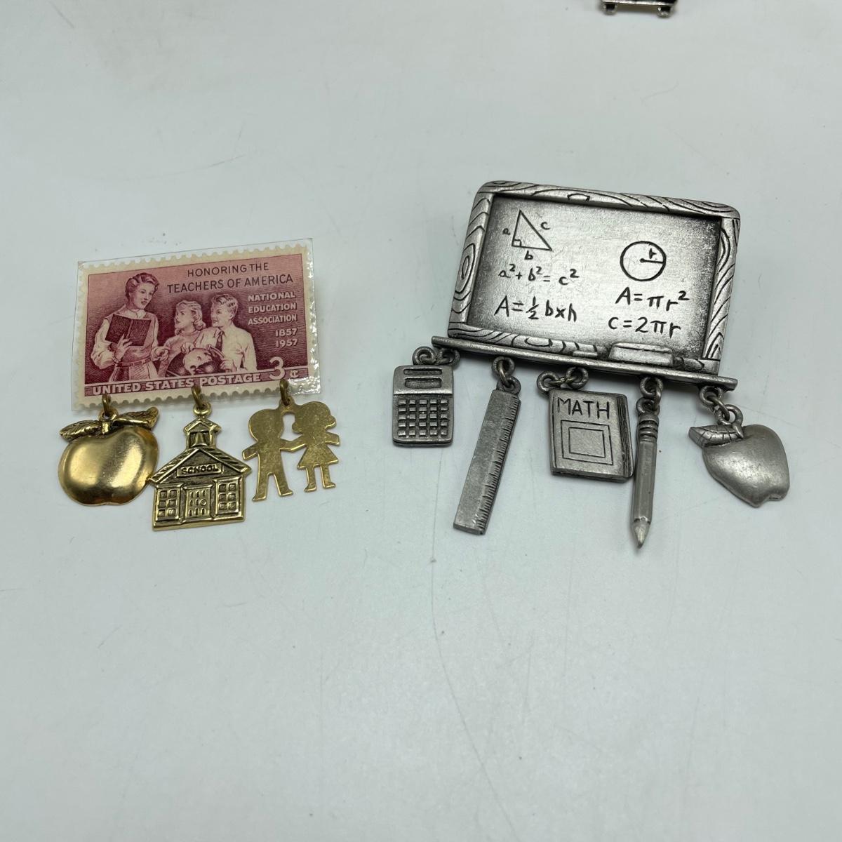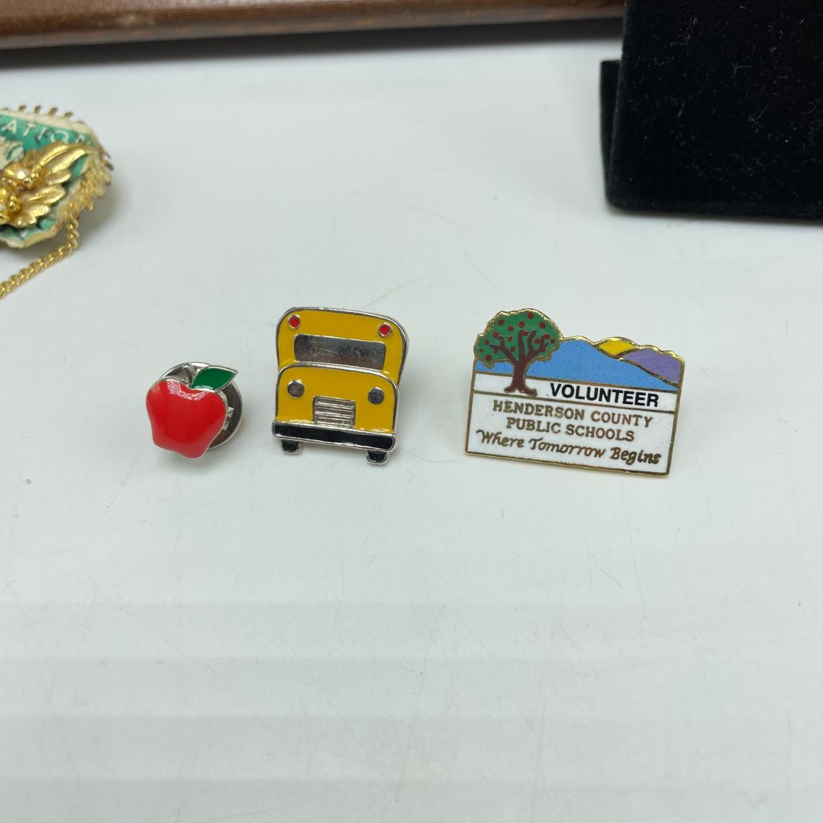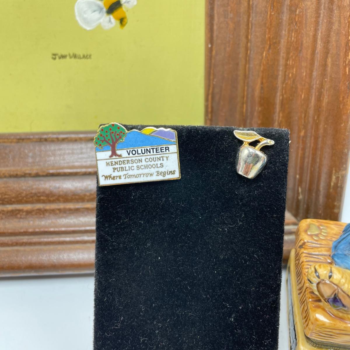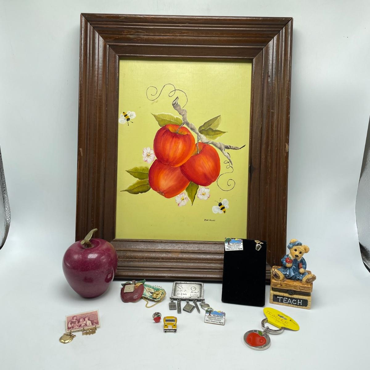 Great gifts for teachers! Three brooches, five pins, a granite-like paperweight, a key chain with original packaging plus a ceramic bear hidden in a teacher box. Lot also features a signed, hand painted bee-apple art in a wooden frame measuring 15.5” x 12.5”. See images. Shipping available.