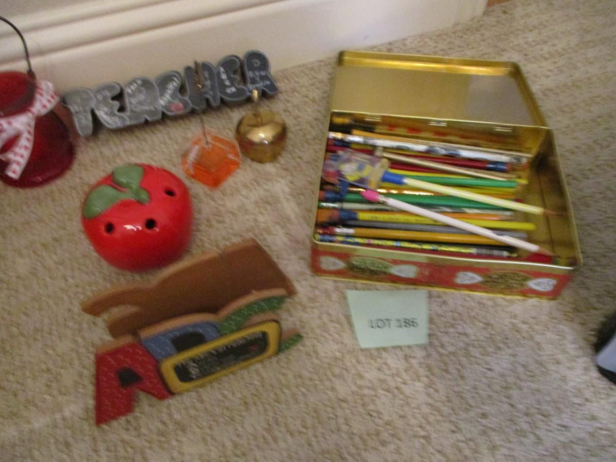 Brass Apple, box of pencils, Teacher wood plack. Small stackables. Apple basket
