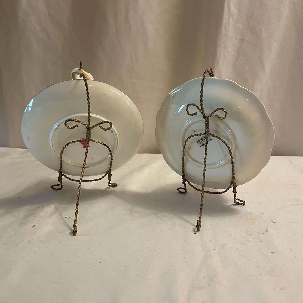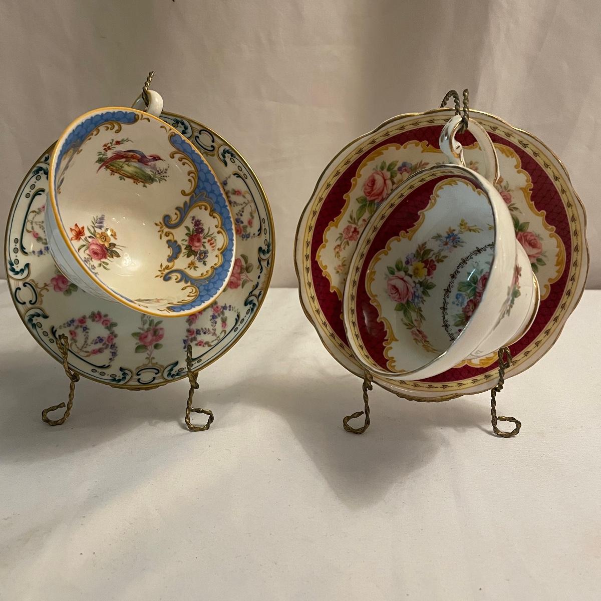 A total of fourteen cups and saucers along with two metal wire display stands is included in this lot. Some great collector items by Limoges, Royal Albert and even a hand signed cup and saucer. Just one of the 14 sets appears not to be a matching cup and saucer (rose teacup with bright blue rim).