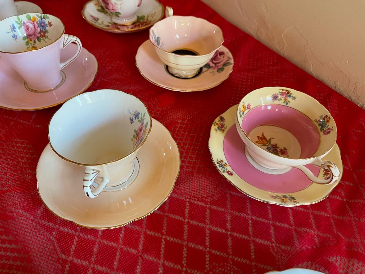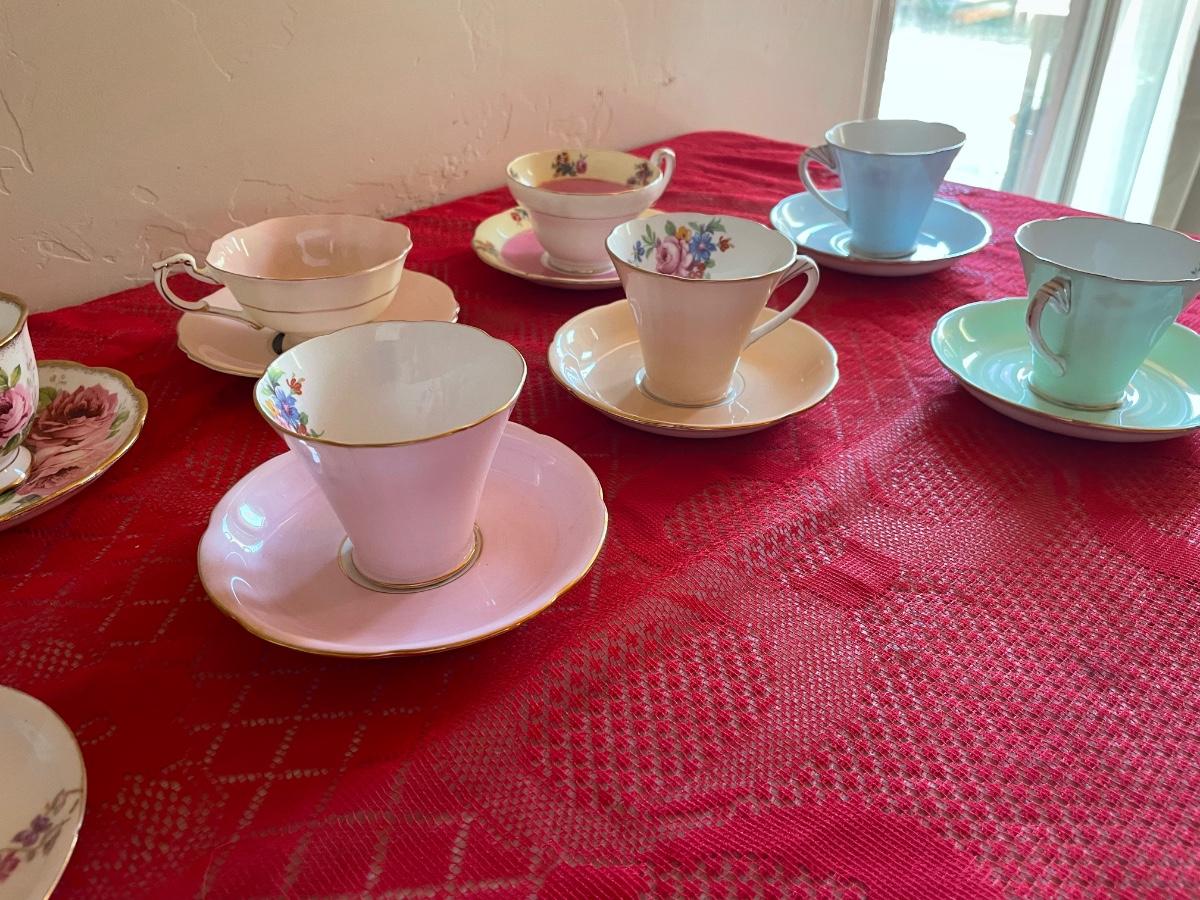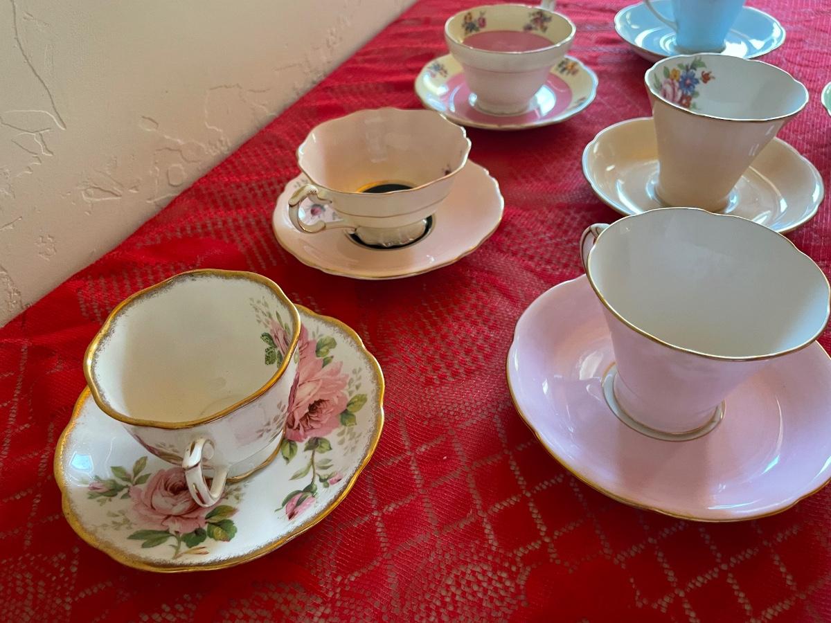 An assortment of 10 teacups including brands like Royal Grafton, Foley Bone China, Paragon, Royal Albert, Limoges and Alfred Meakin. All in great condition