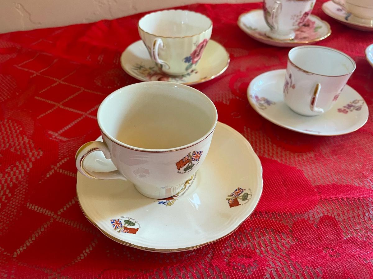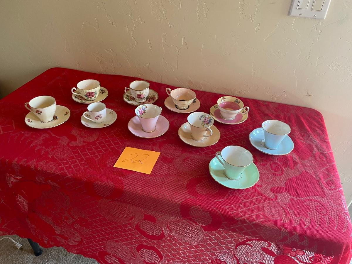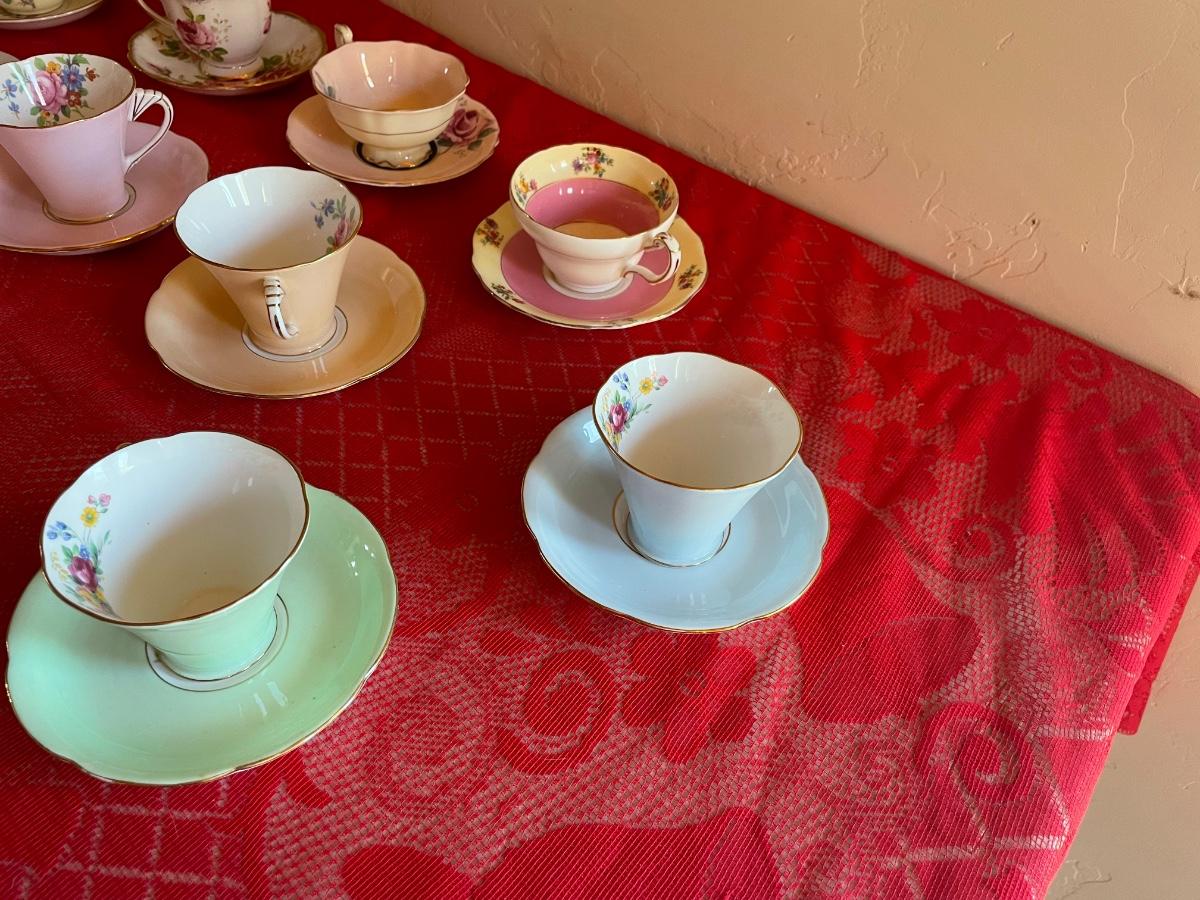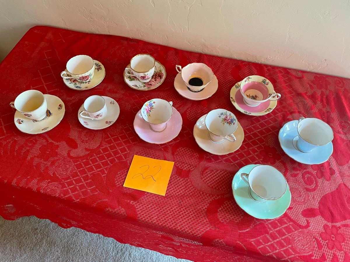 An assortment of 10 teacups including brands like Royal Grafton, Foley Bone China, Paragon, Royal Albert, Limoges and Alfred Meakin. All in great condition