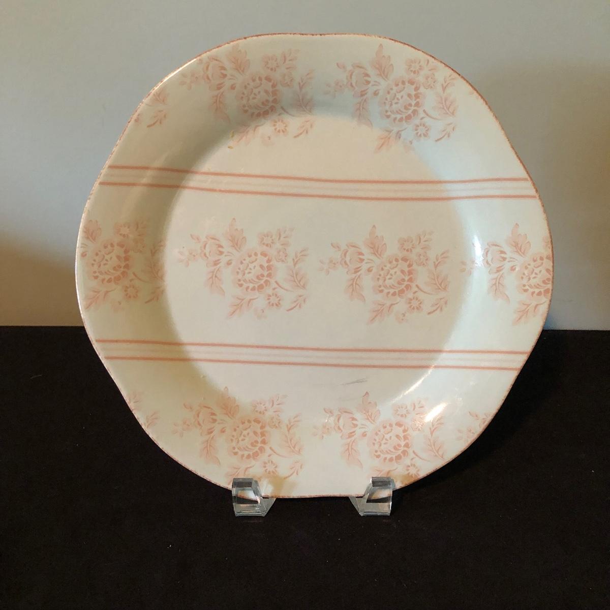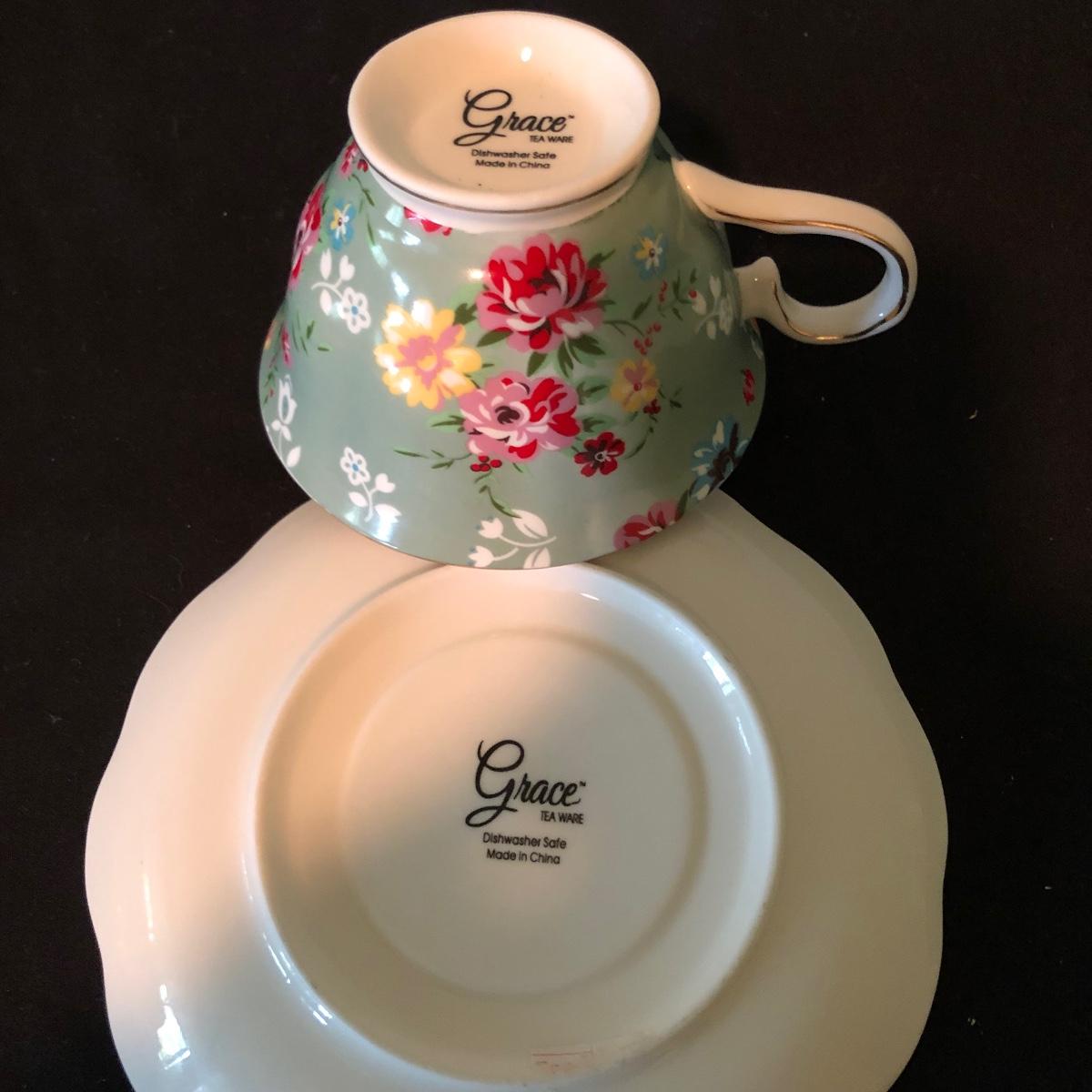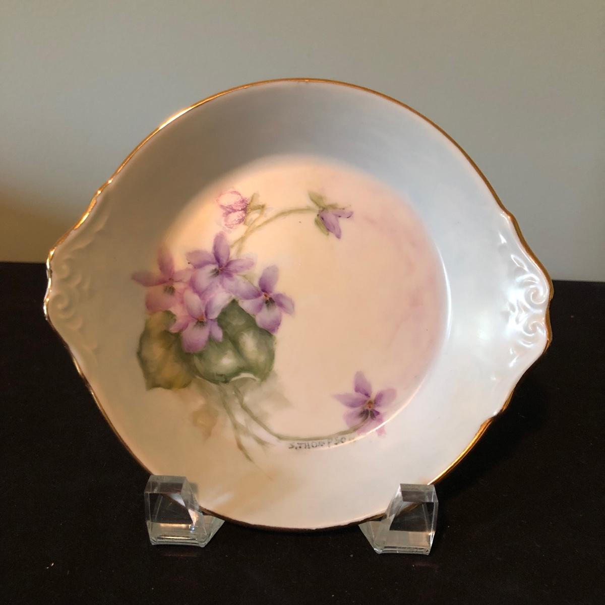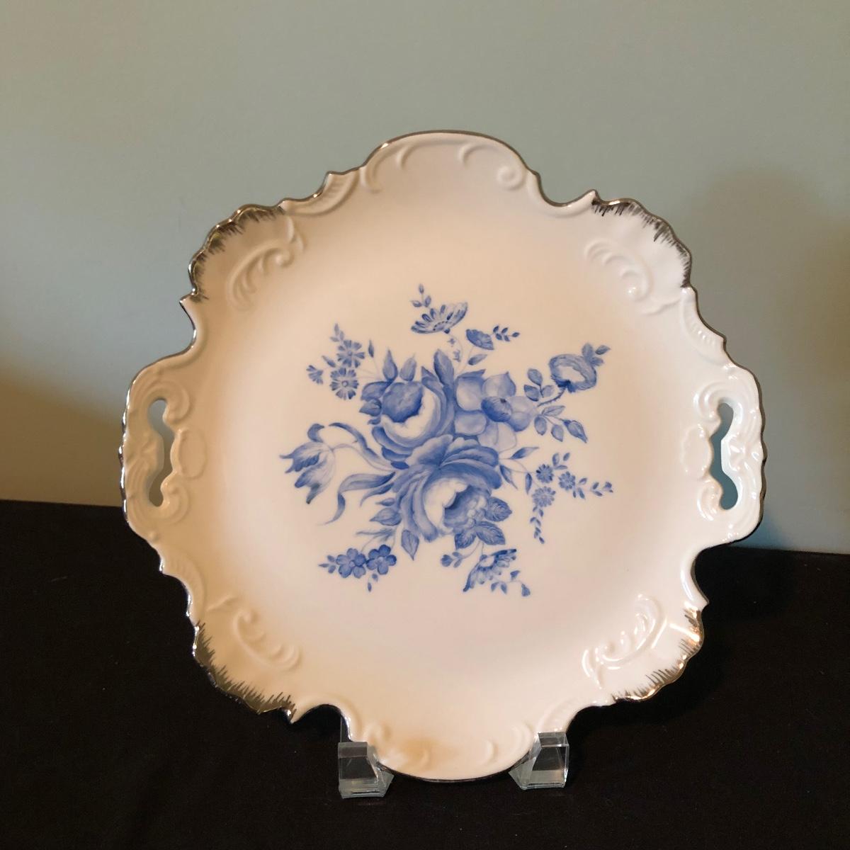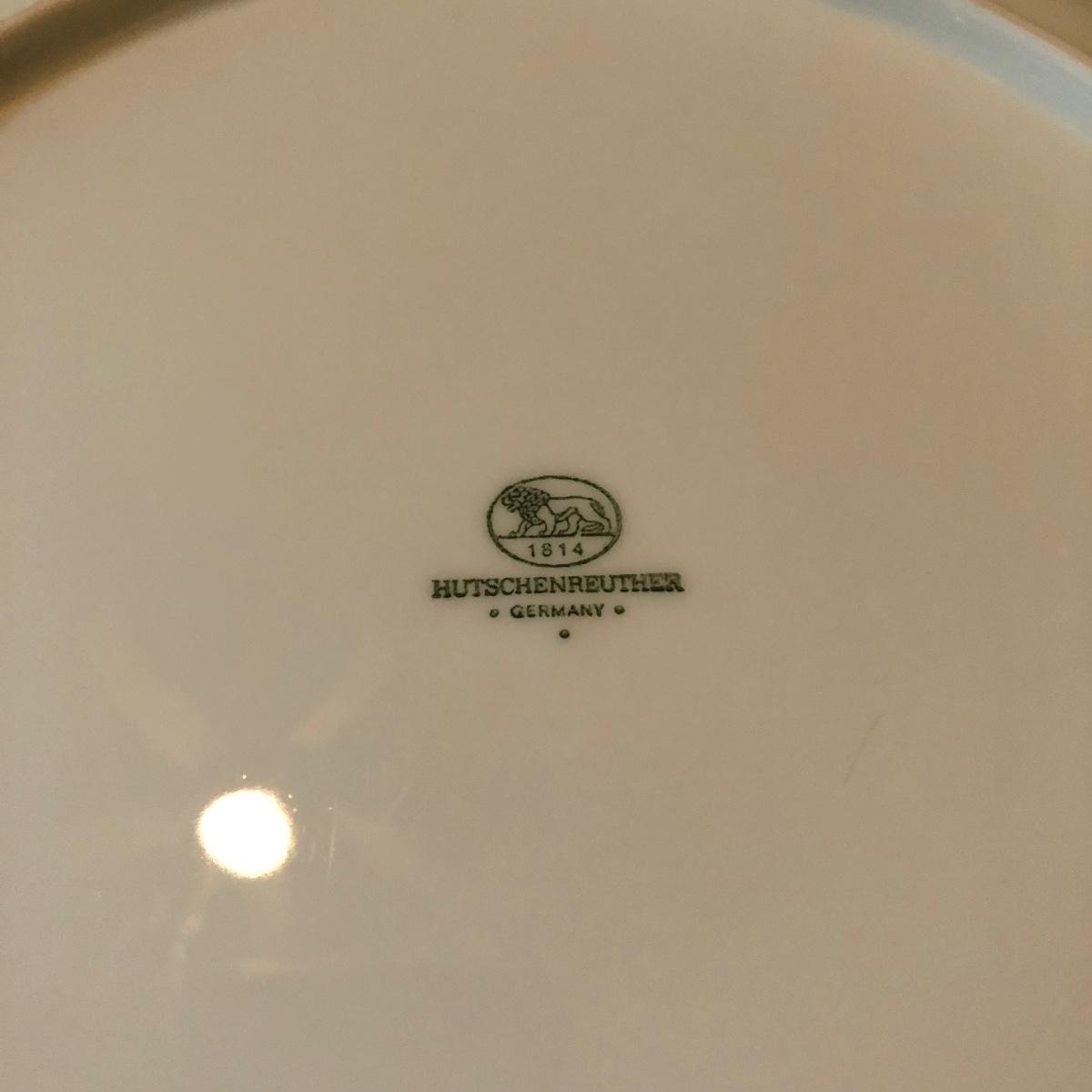 Lot includes Hutchenreuther plate, stoneware plate, floral design plate, floral design dish, Taupe dish, Grace teacup and saucer, Royal Albert teacup and saucer, miniature basket and pitcher. Largest plate measures 10.5” x 11.5”