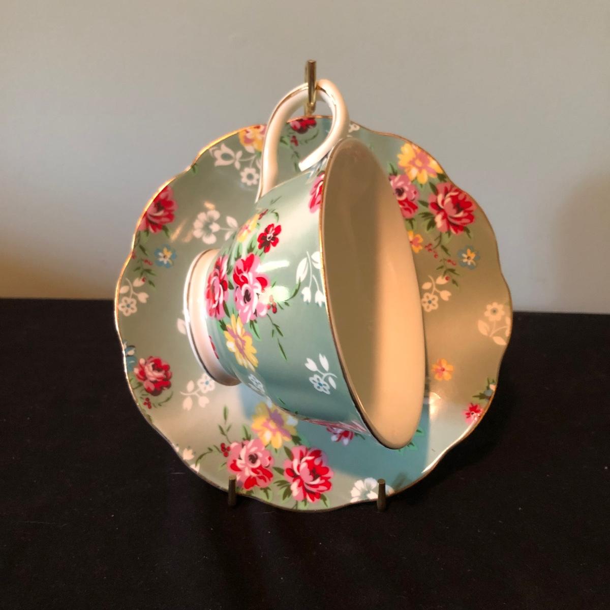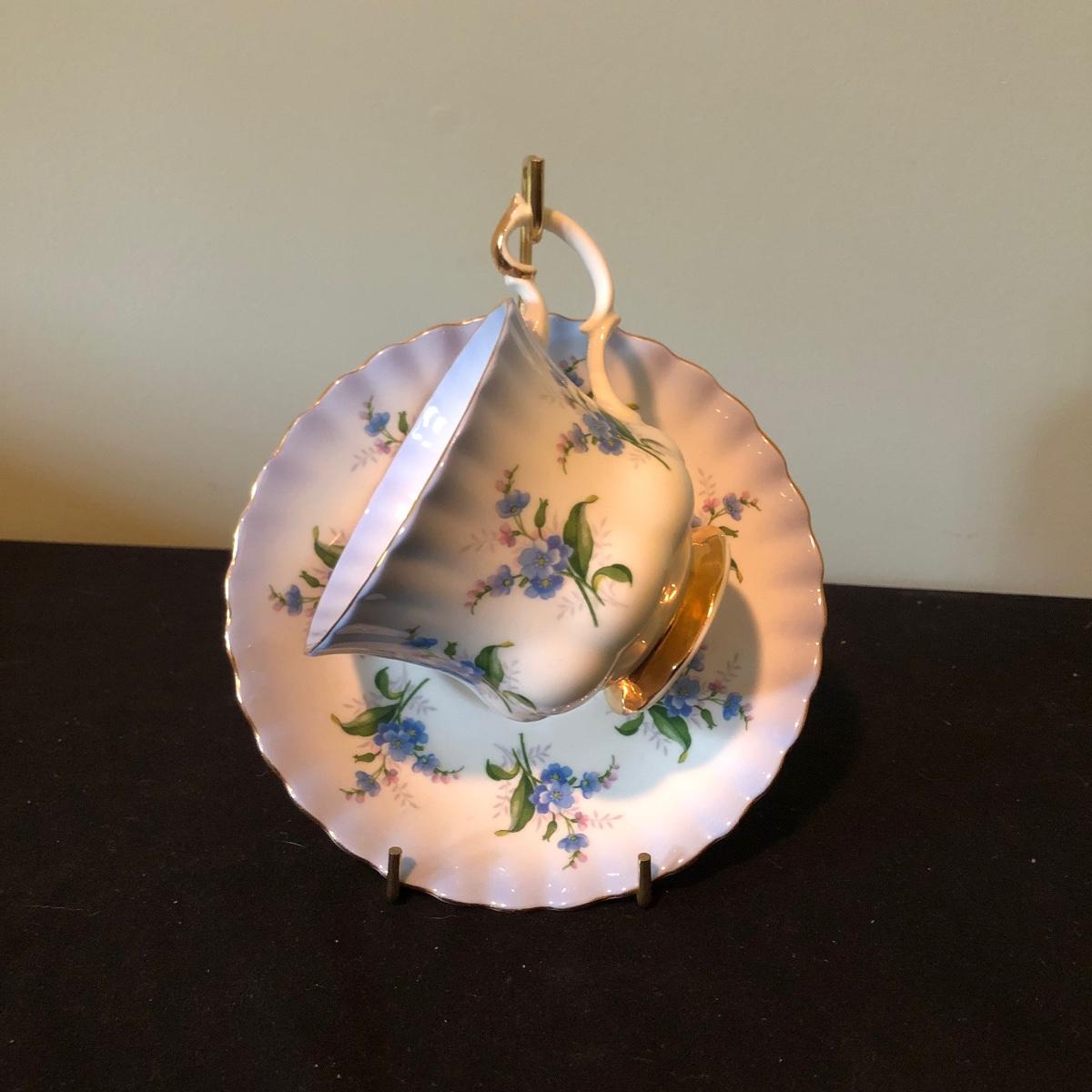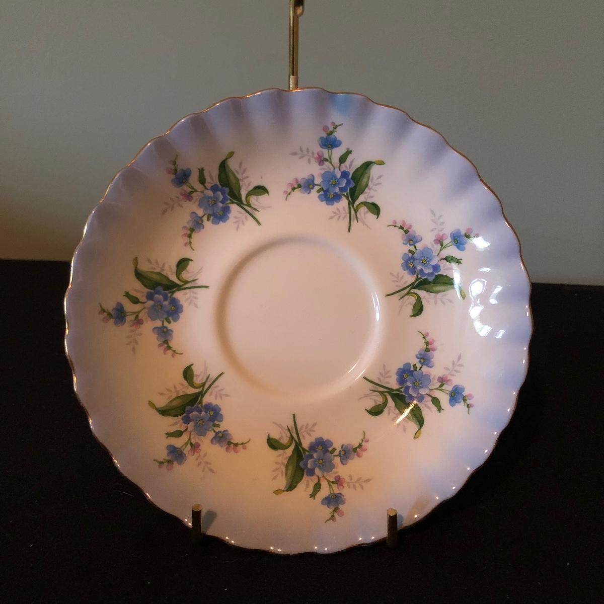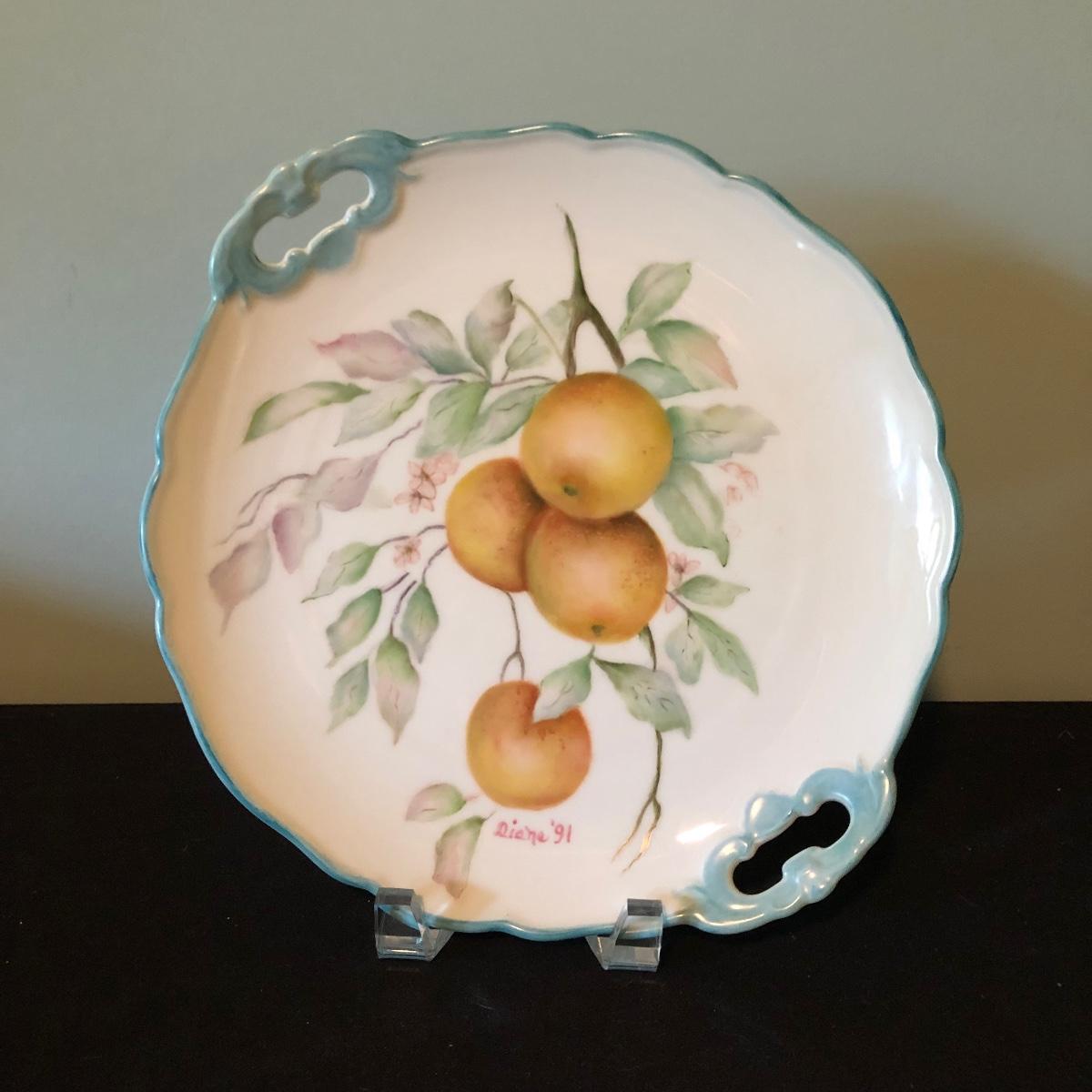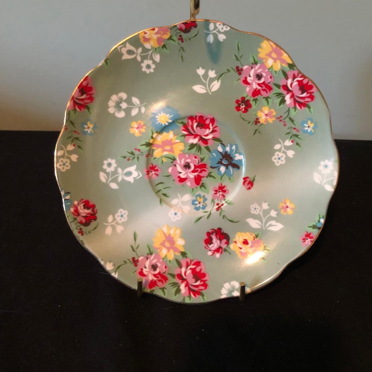 Lot includes Hutchenreuther plate, stoneware plate, floral design plate, floral design dish, Taupe dish, Grace teacup and saucer, Royal Albert teacup and saucer, miniature basket and pitcher. Largest plate measures 10.5” x 11.5”