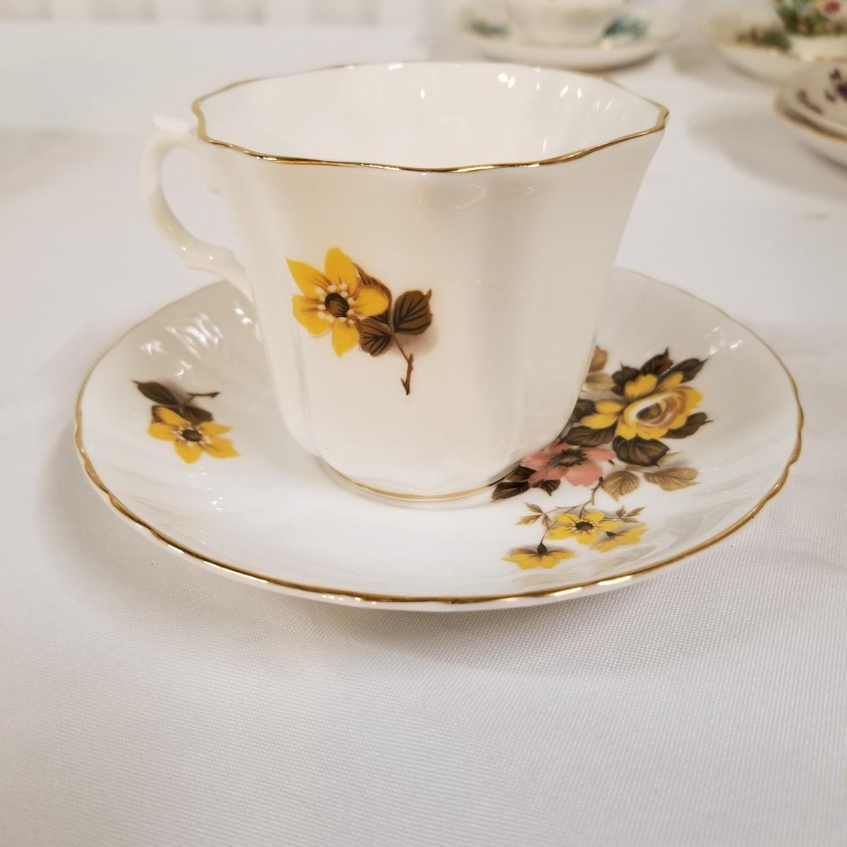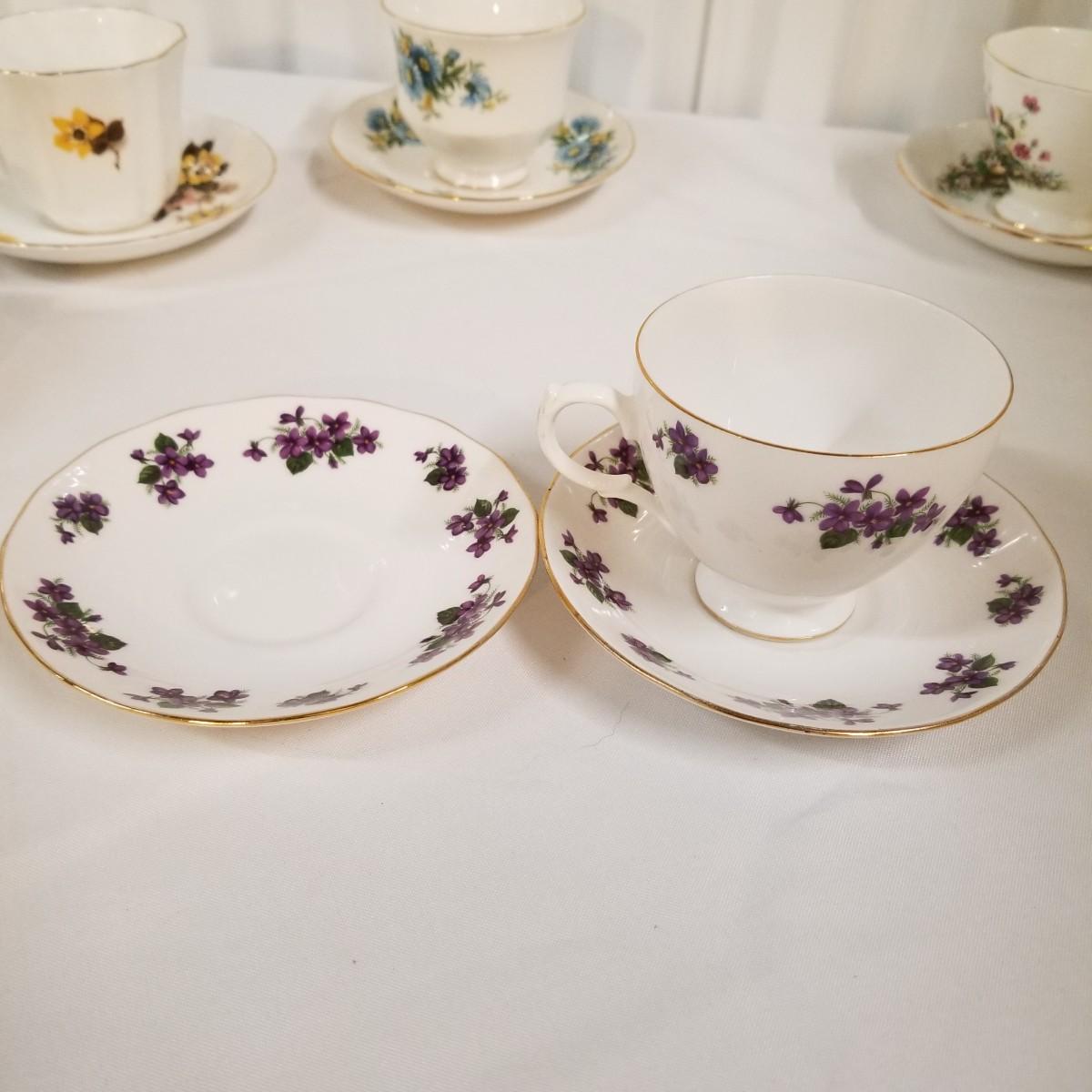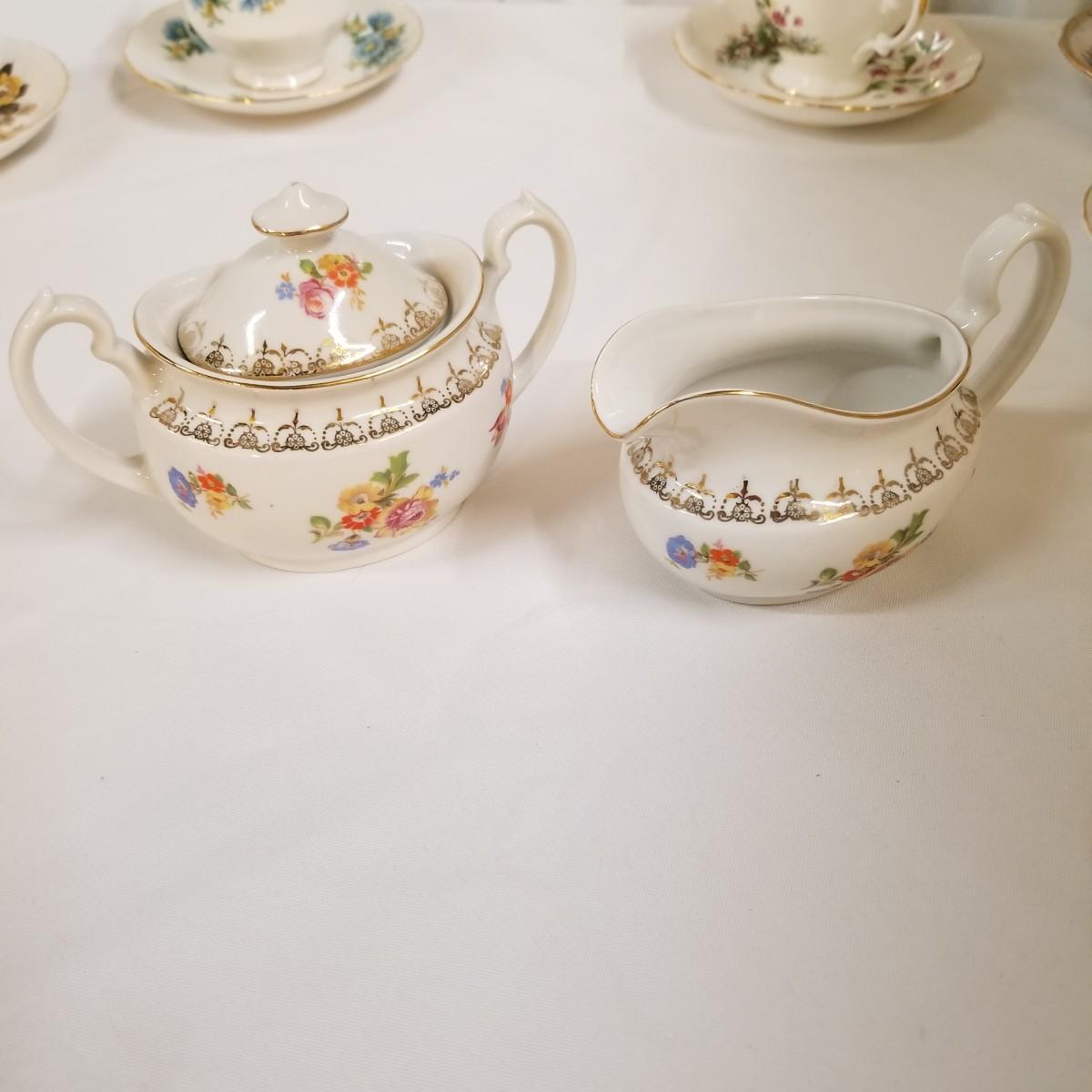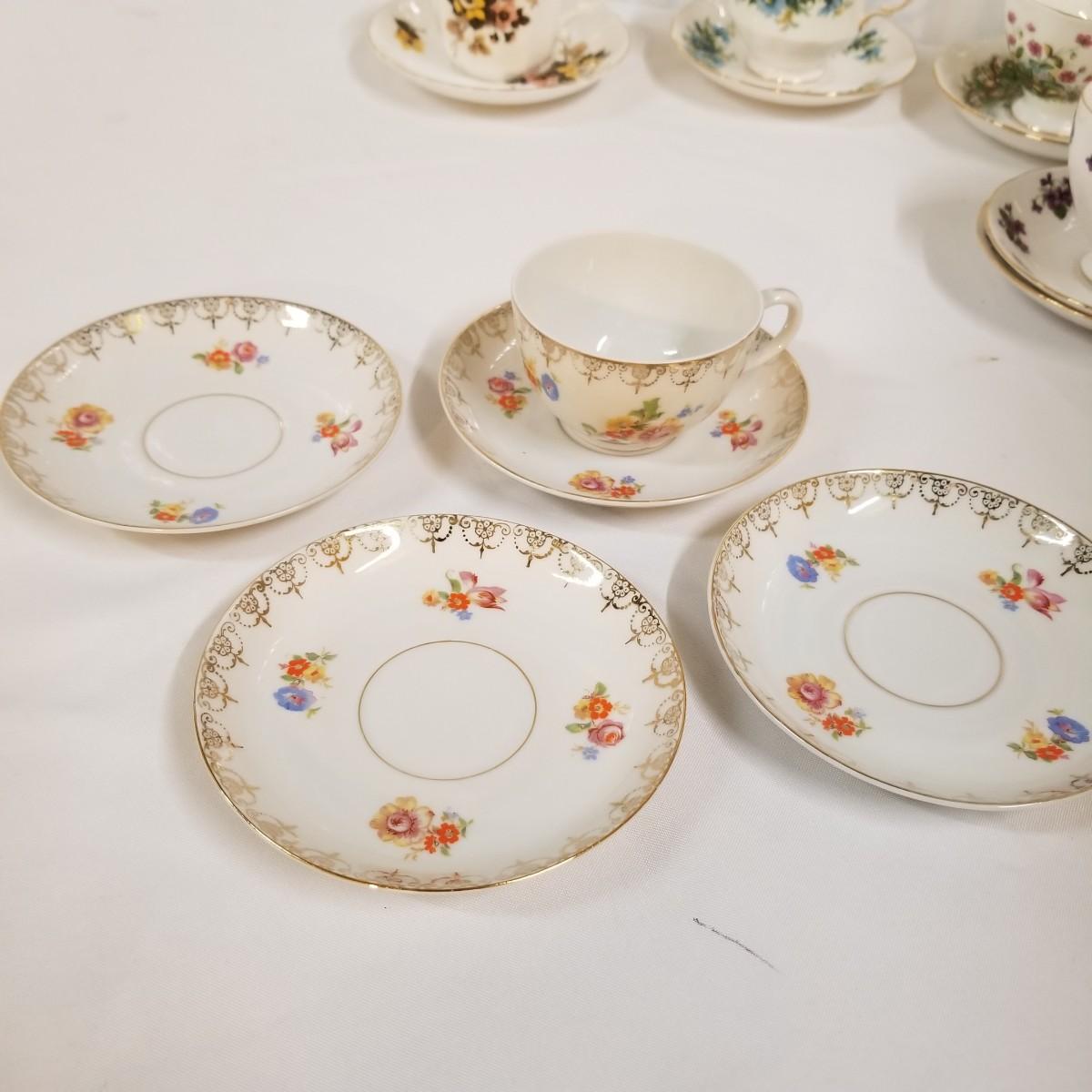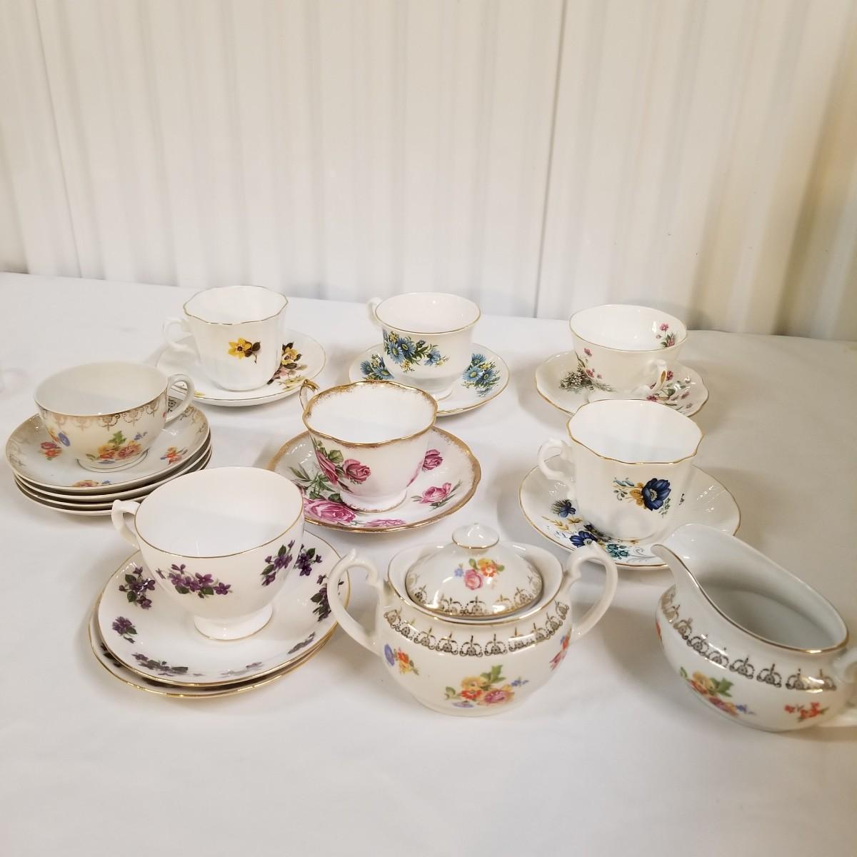 Seven different teacups with matching saucers.  Two sets have more than one saucer.  Also a creamer and sugar bowl set. Most all of the cup sets are bone china, see photos for detail.  Shipping available.