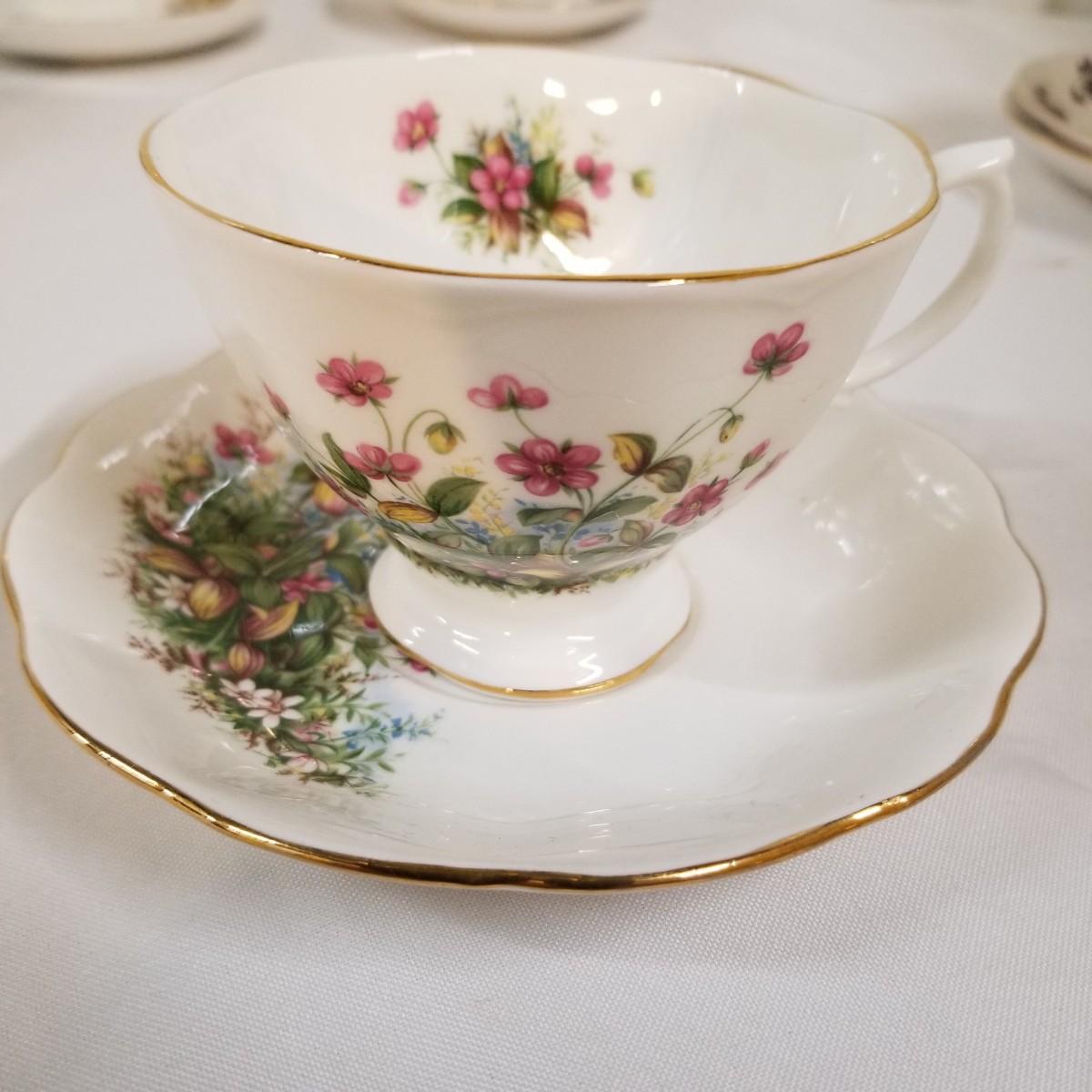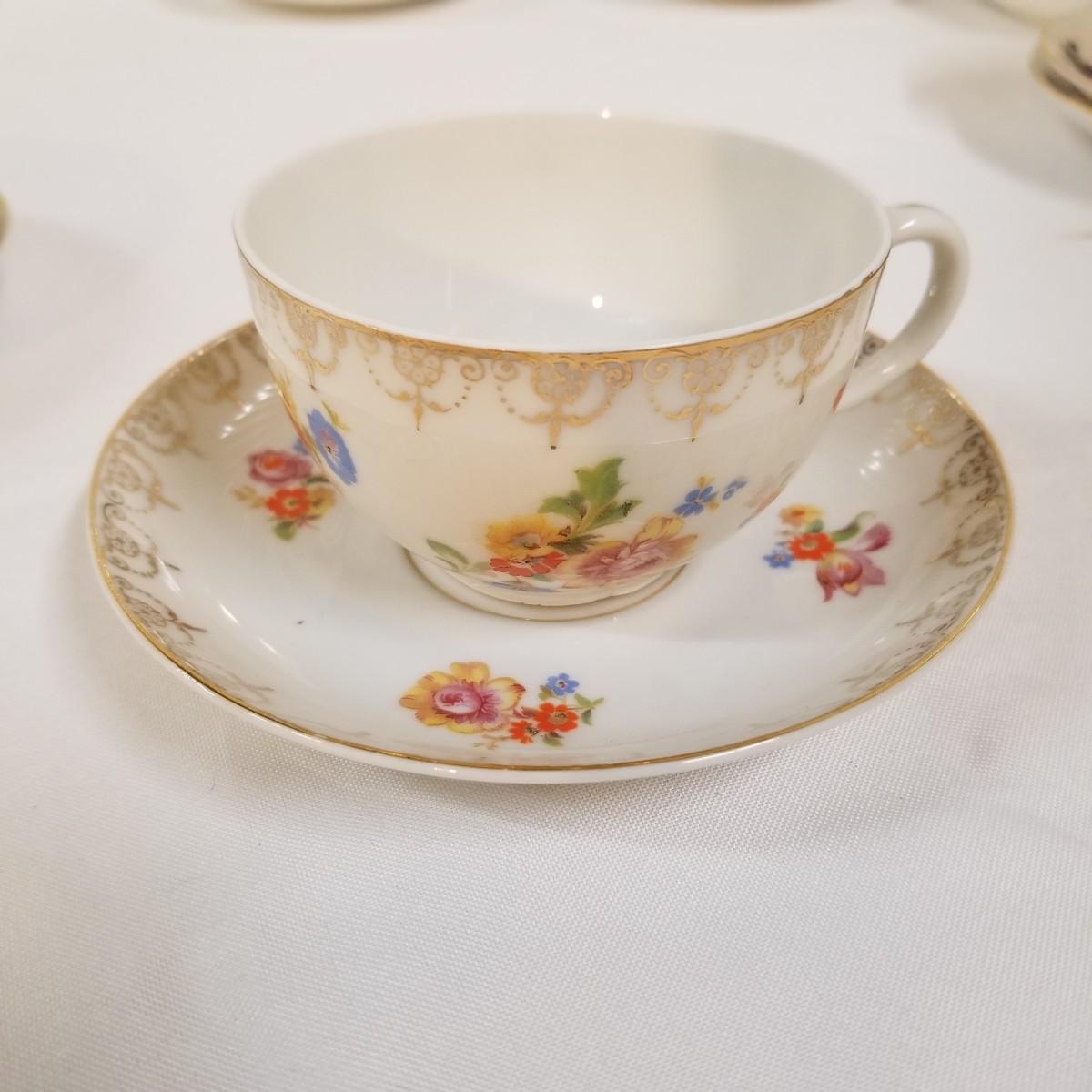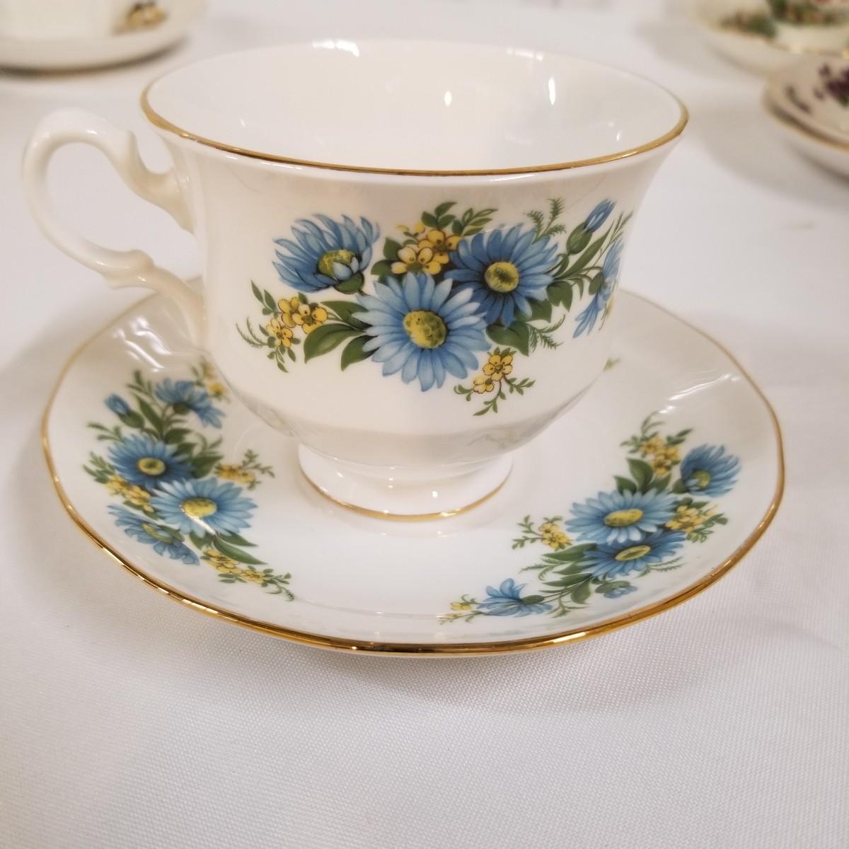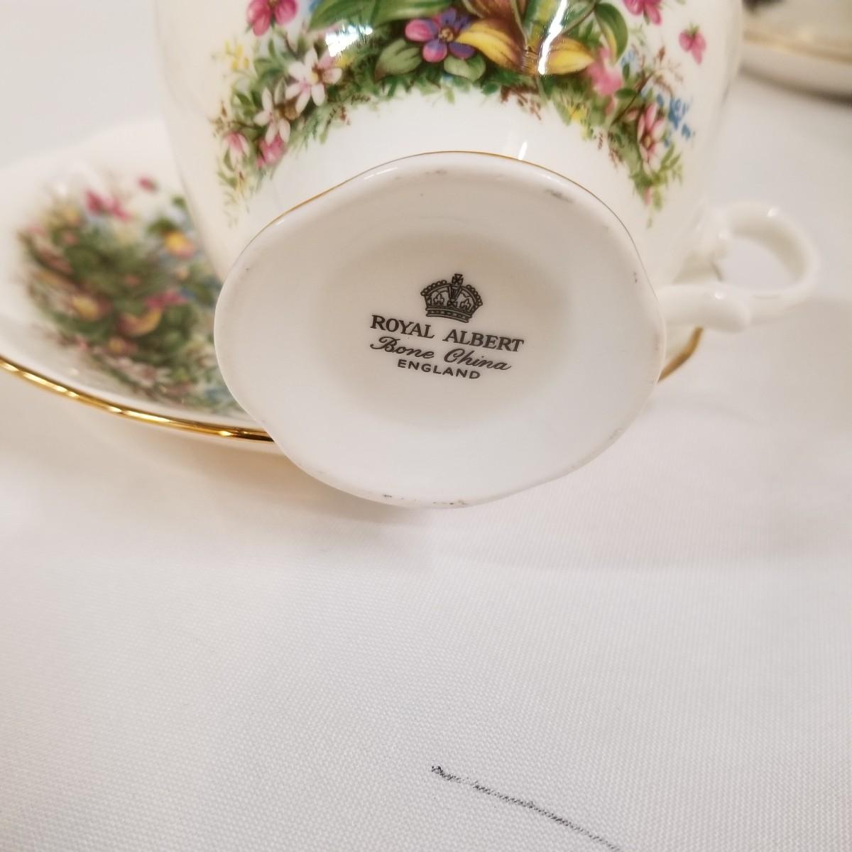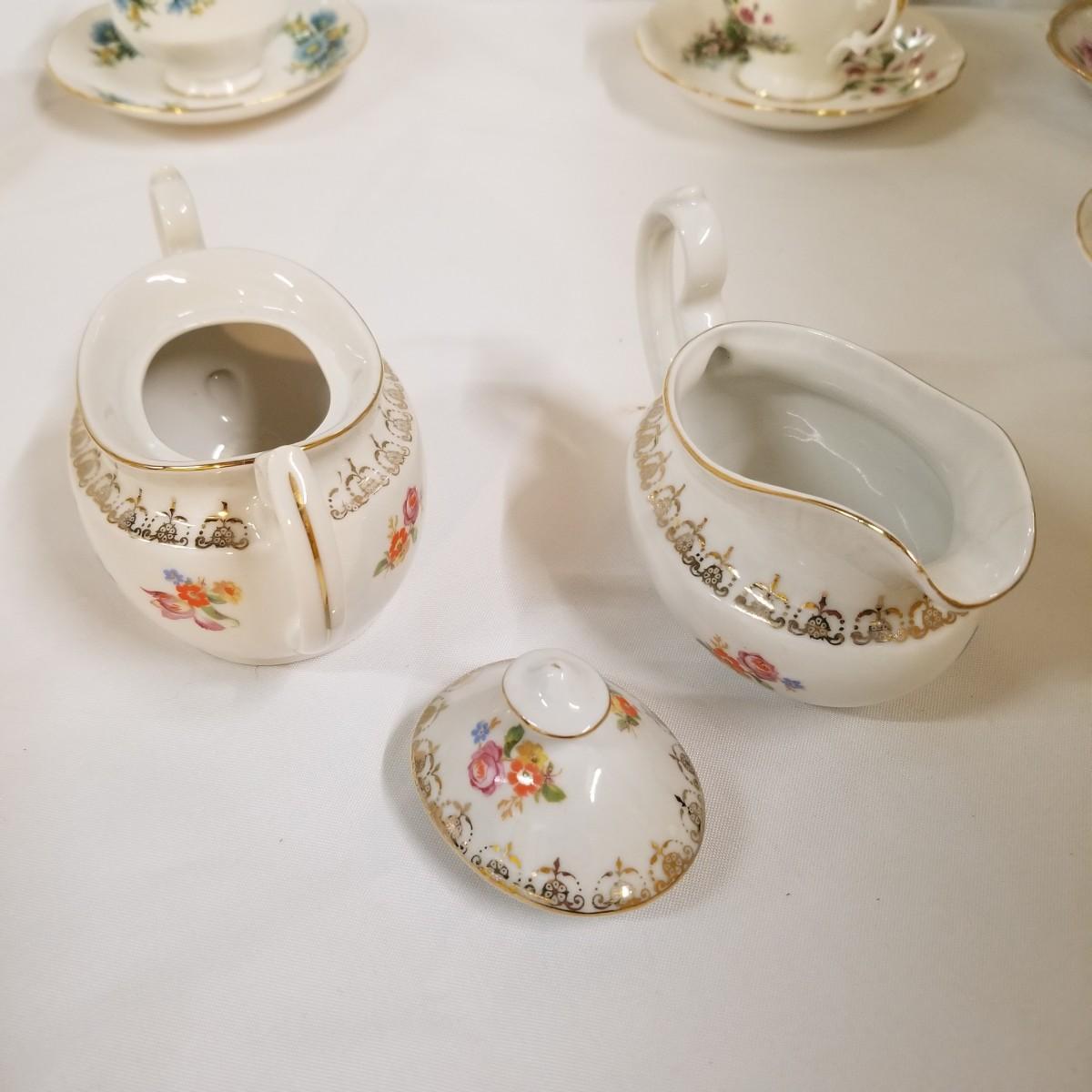 Seven different teacups with matching saucers.  Two sets have more than one saucer.  Also a creamer and sugar bowl set. Most all of the cup sets are bone china, see photos for detail.  Shipping available.