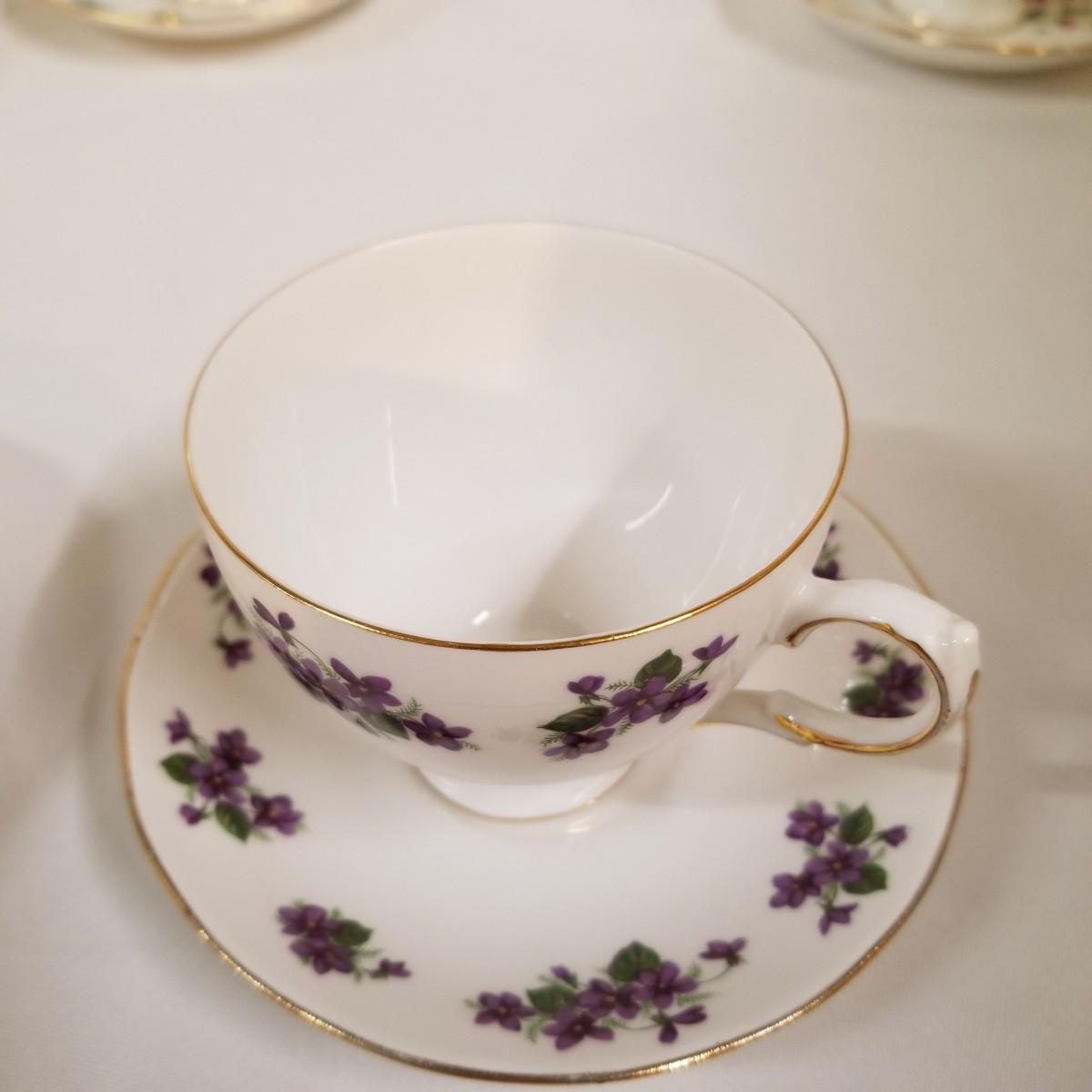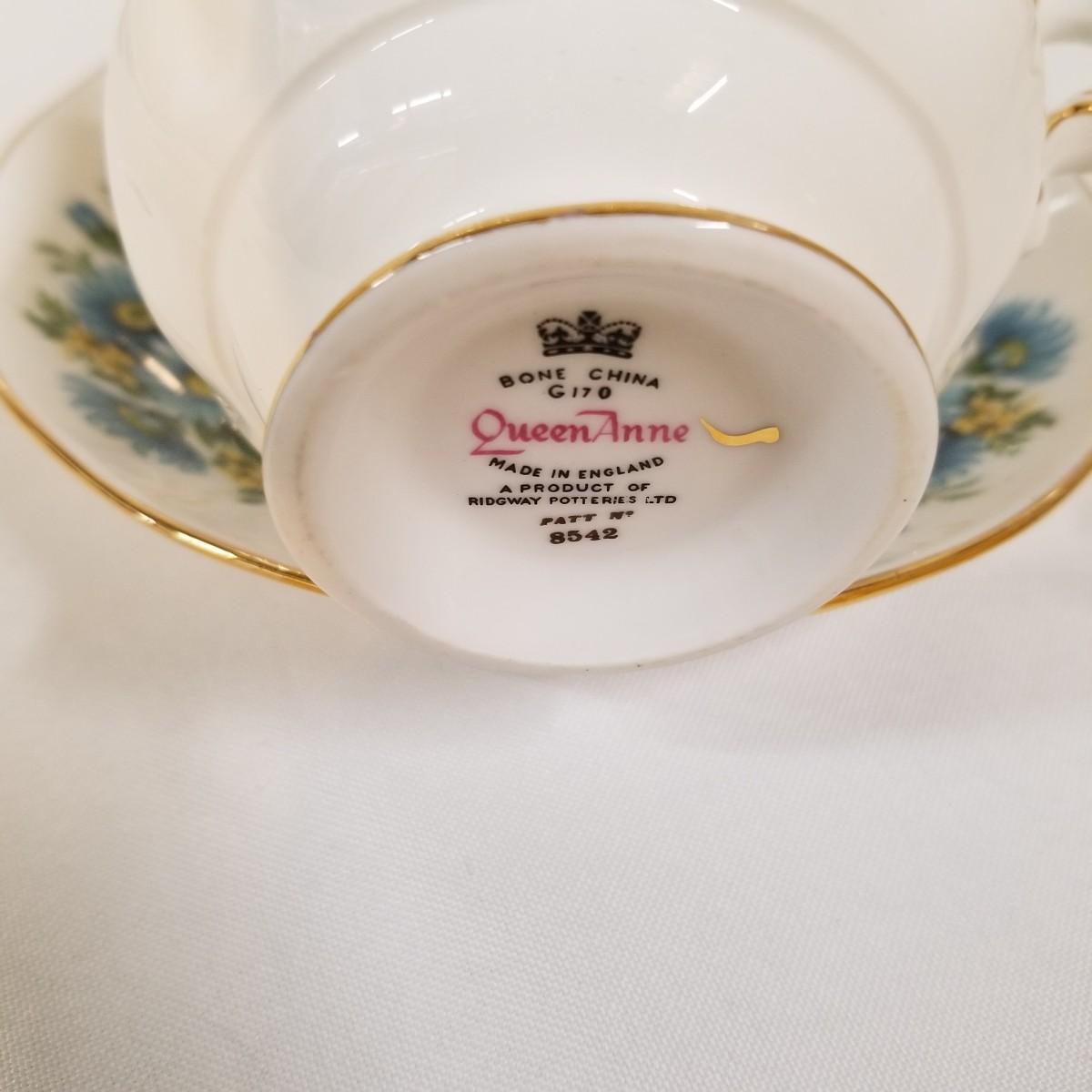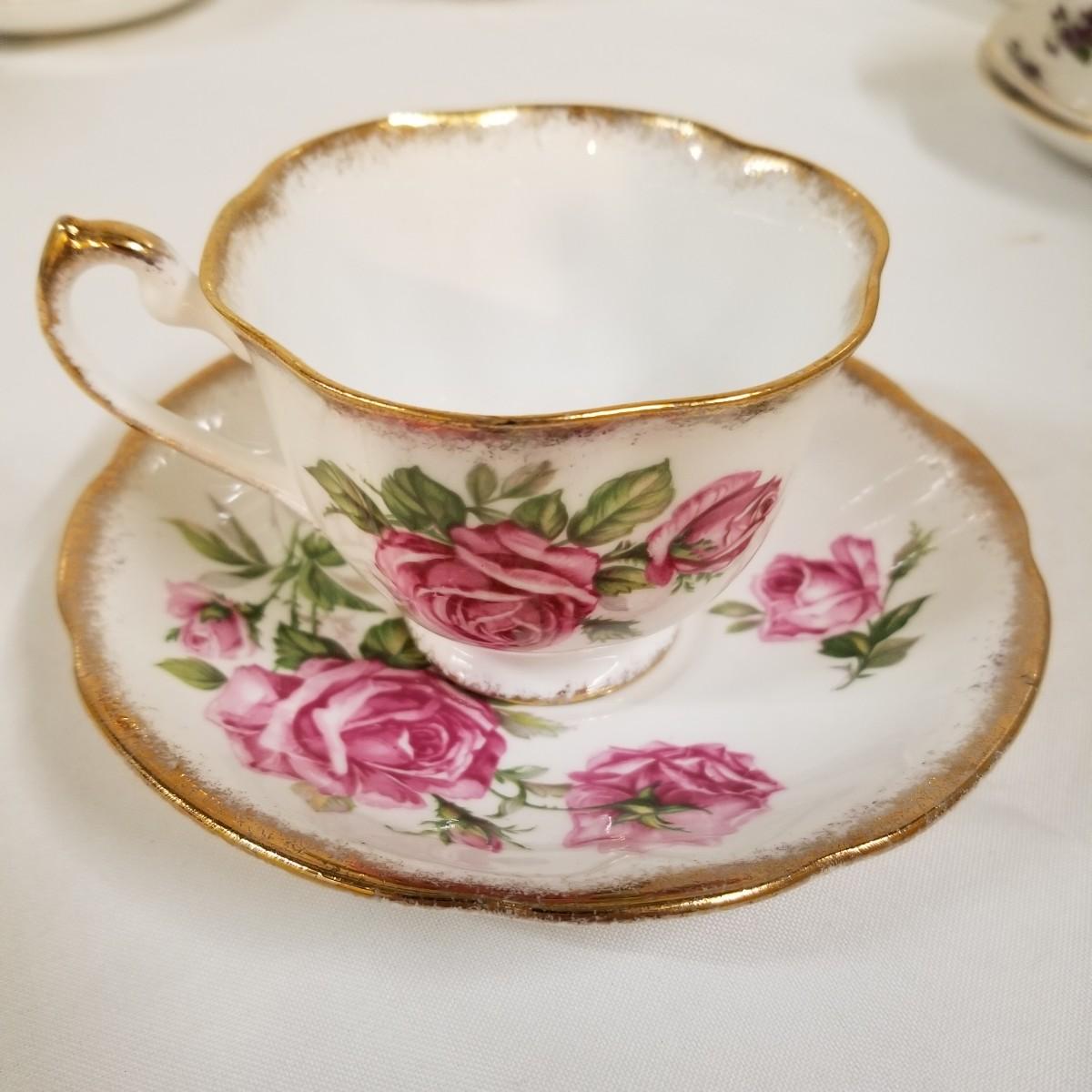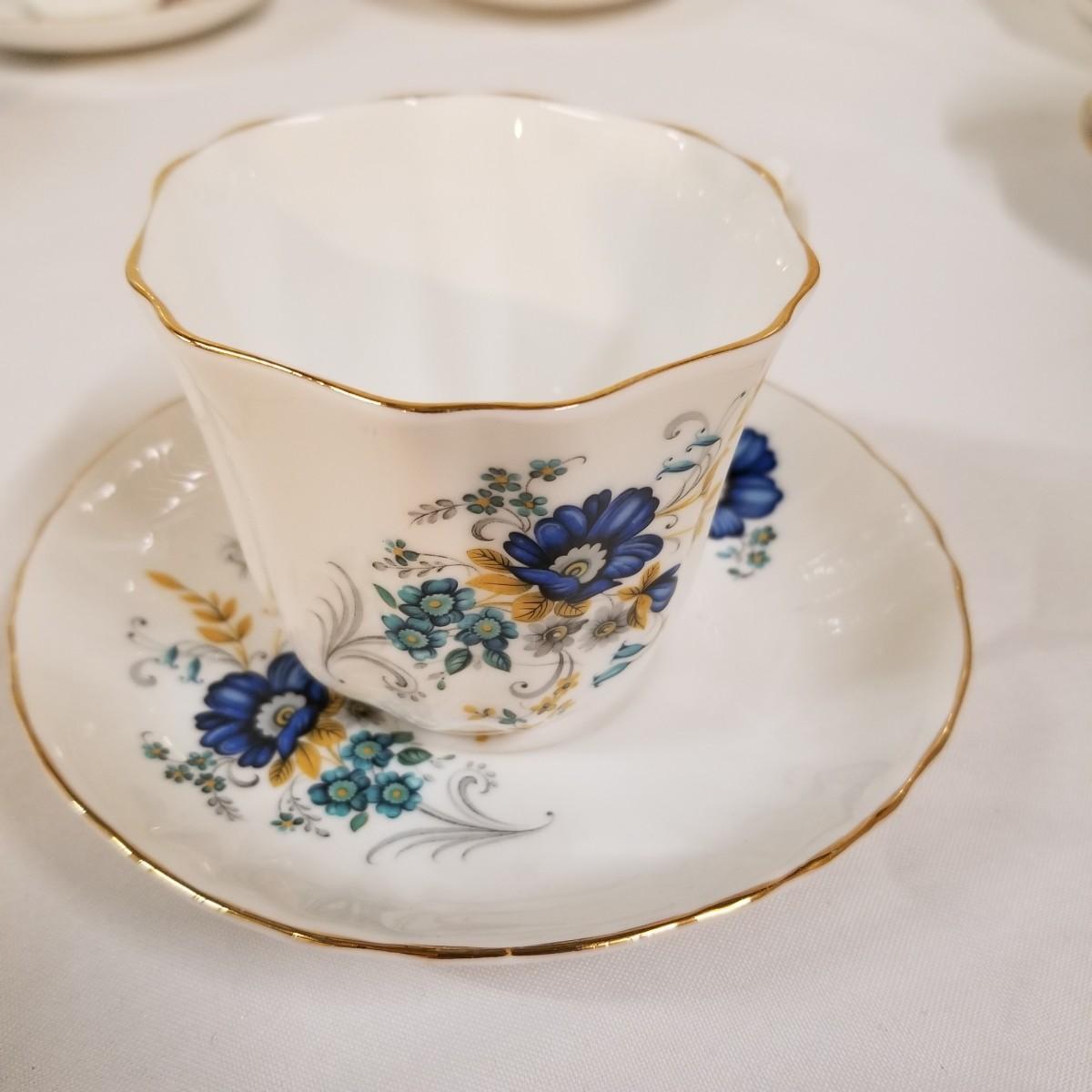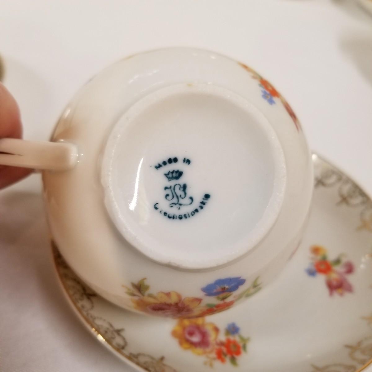 Seven different teacups with matching saucers.  Two sets have more than one saucer.  Also a creamer and sugar bowl set. Most all of the cup sets are bone china, see photos for detail.  Shipping available.