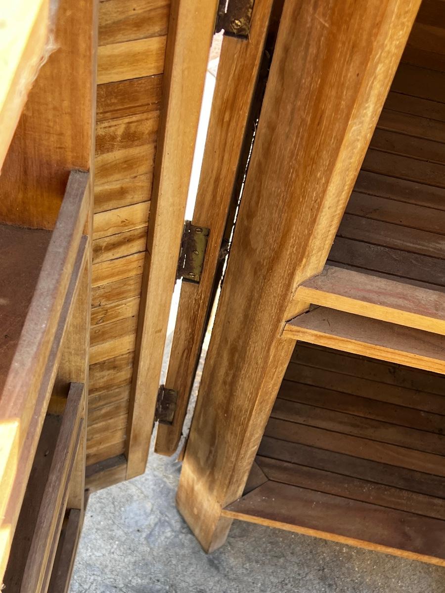 Needs Repair. One of the hinges for the foldout on the top needs to be replaced, the side of the bar possibly glued or nailed back in place. See photos. Top folded = 43” H x 40” W x 19” D. Top folded out = 71” W.