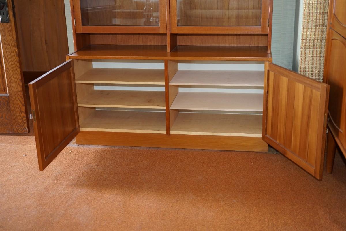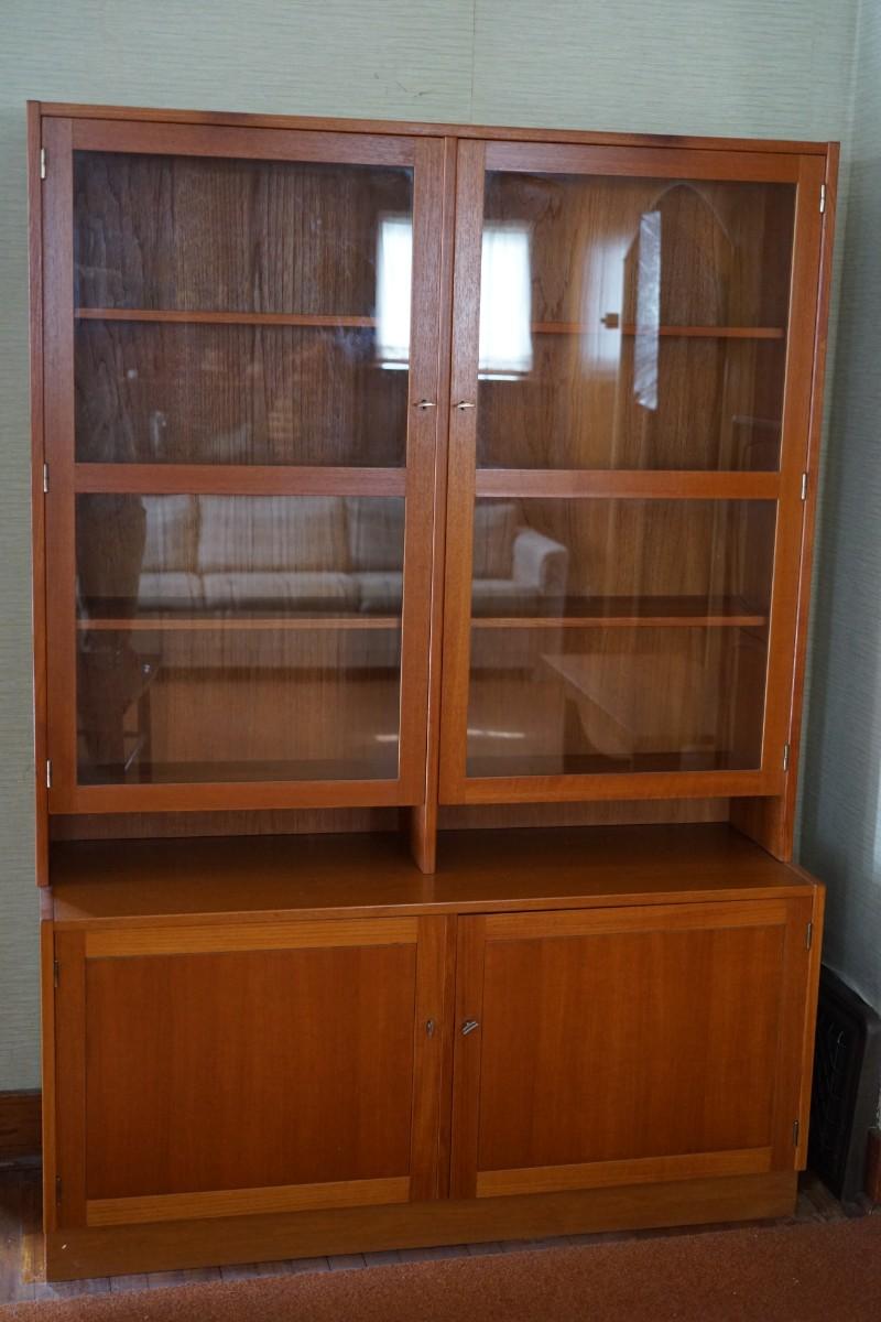 TEAK CABINET BOOKCASE W/GLASS DOORS AND SLIDING DOORS LOCKING KEY HANDLES