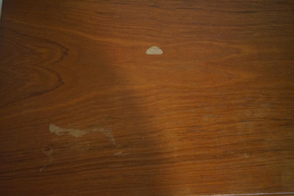 teak end table with one drawer and a lower shelf storage area. the top has some wear. the drawer is a of lighter tone. measures: 20" by 21" by 16"