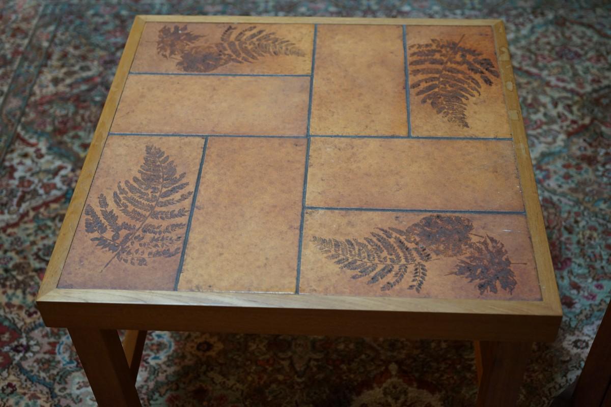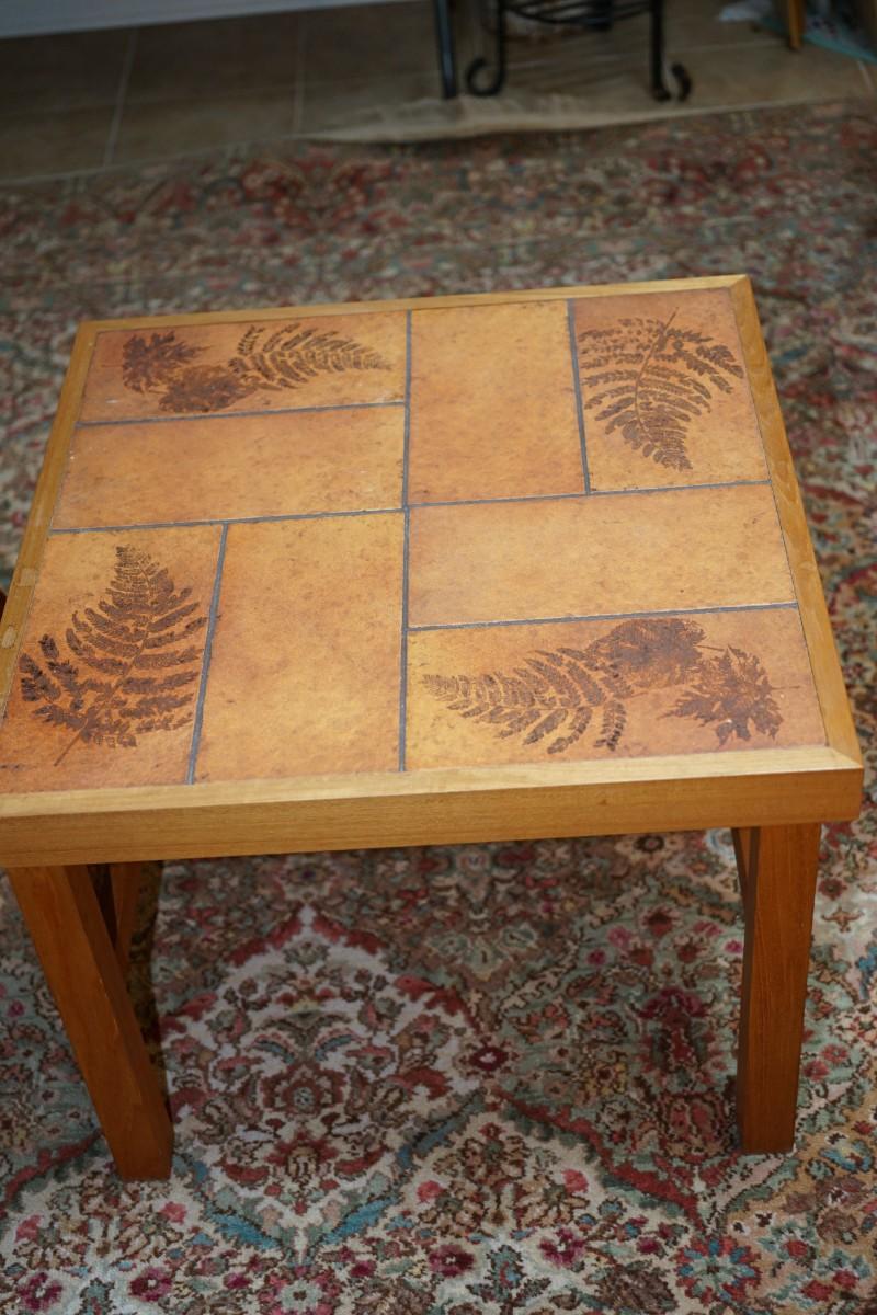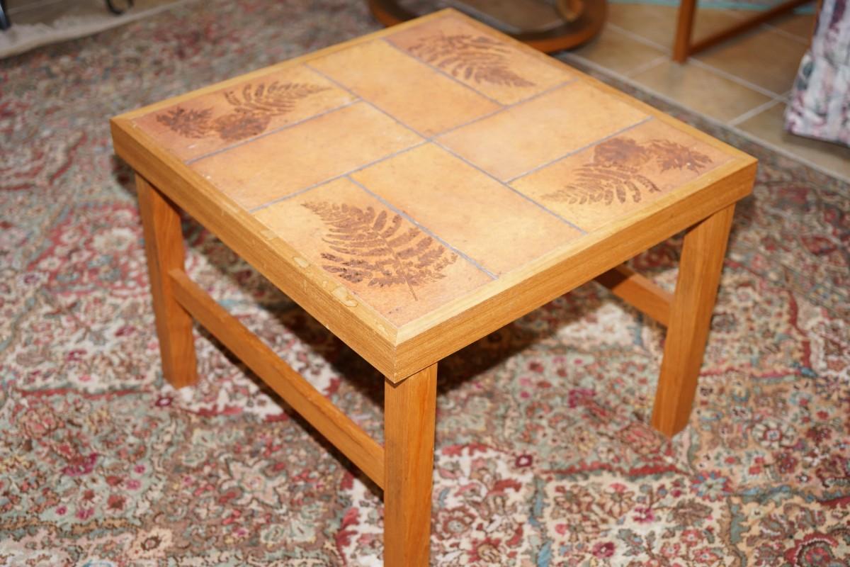 TEAK FRAMED END TABLE W/ BROWN TILE TOP OF FERNS
