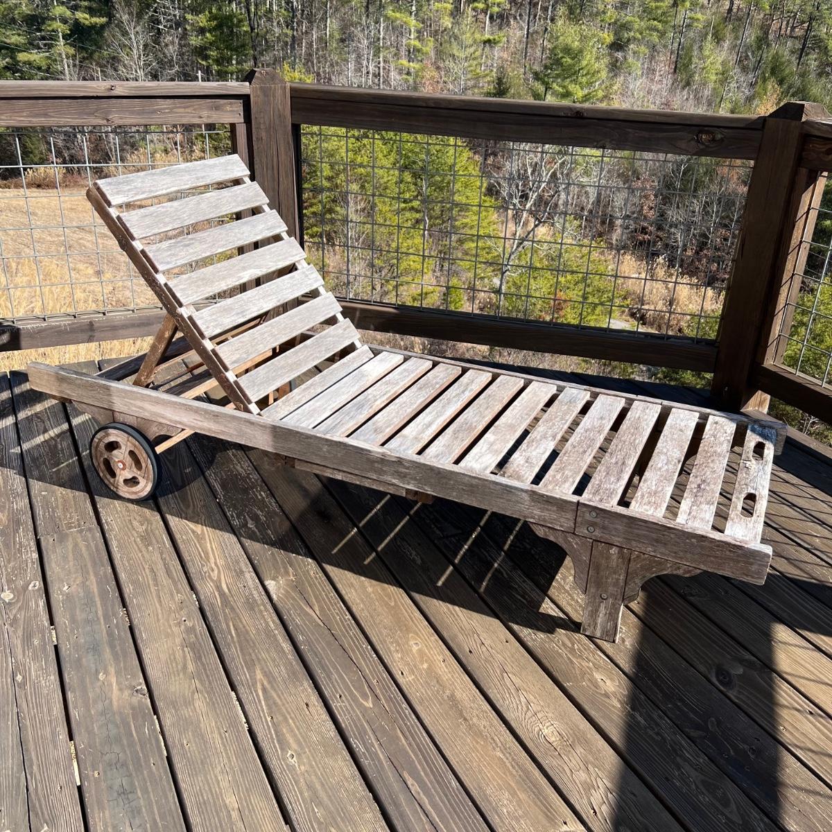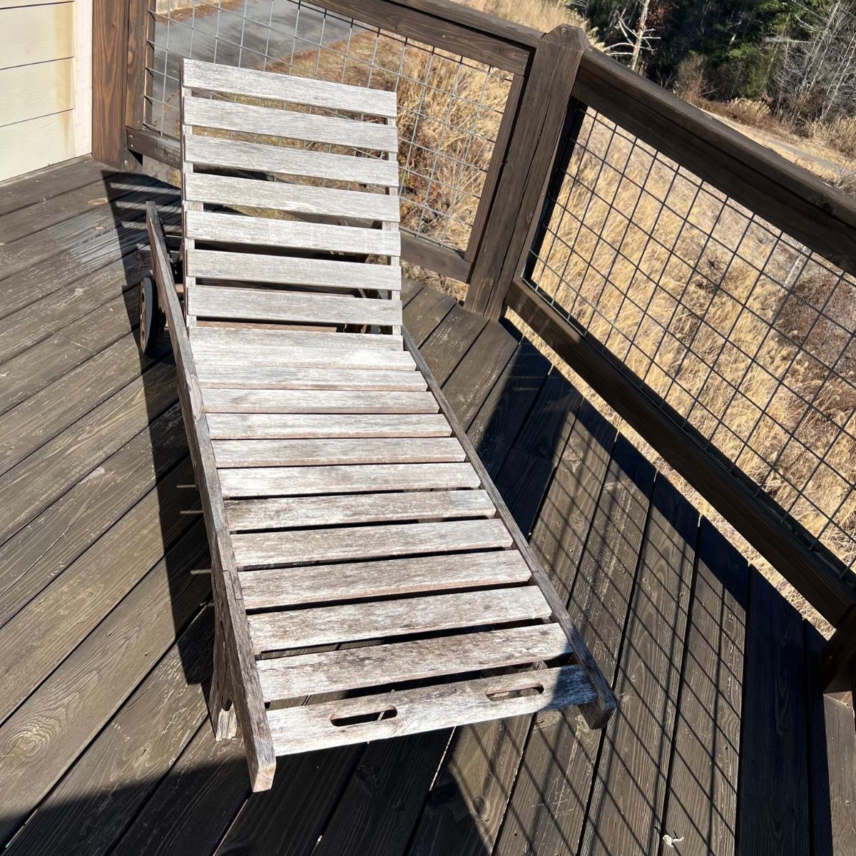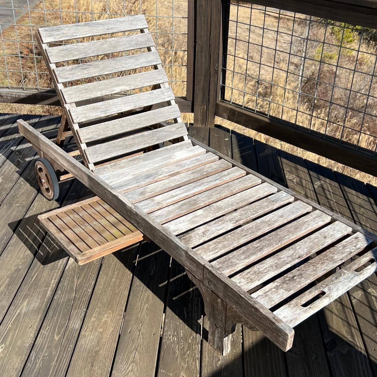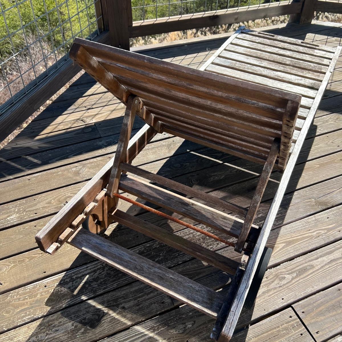 This teak lounger is weathered but some oil will quickly restore it if desired. It is in good condition structurally although the built-in tray is hard to pull out after a rain and there is surface rust on the metal pole that adjusts the tilt. Wheels are wood with rubber treads.