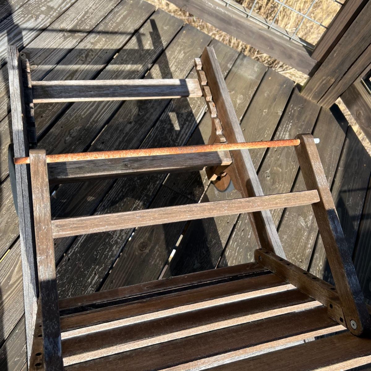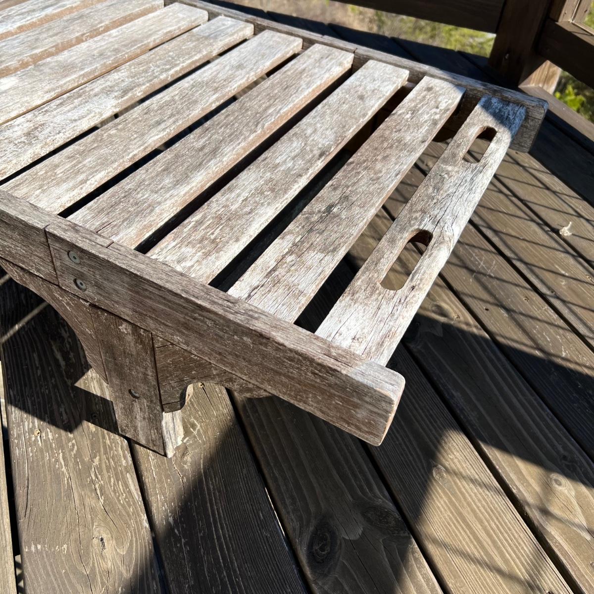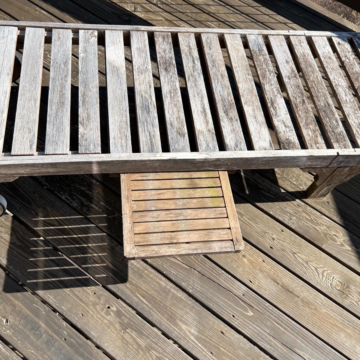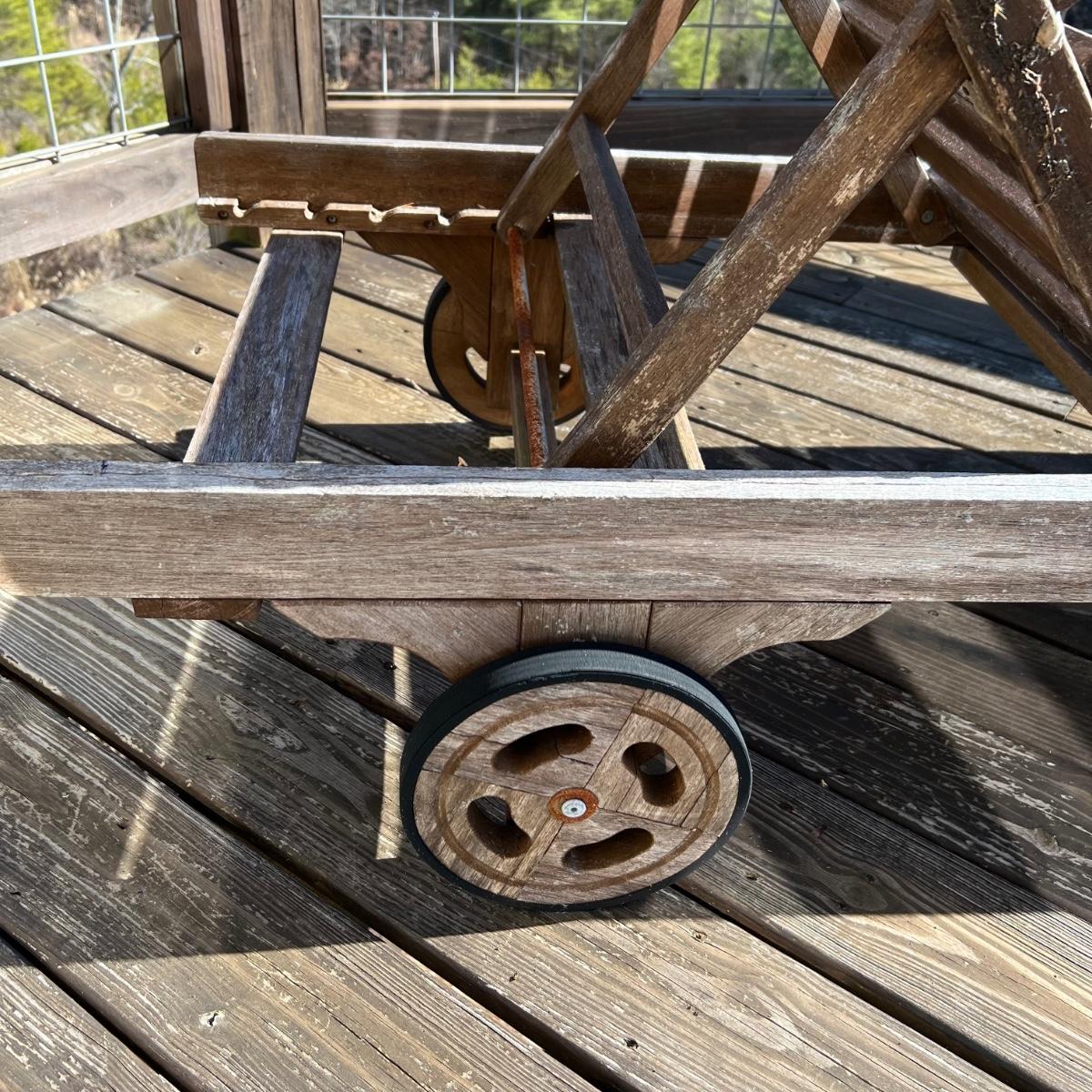 This teak lounger is weathered but some oil will quickly restore it if desired. It is in good condition structurally although the built-in tray is hard to pull out after a rain and there is surface rust on the metal pole that adjusts the tilt. Wheels are wood with rubber treads.