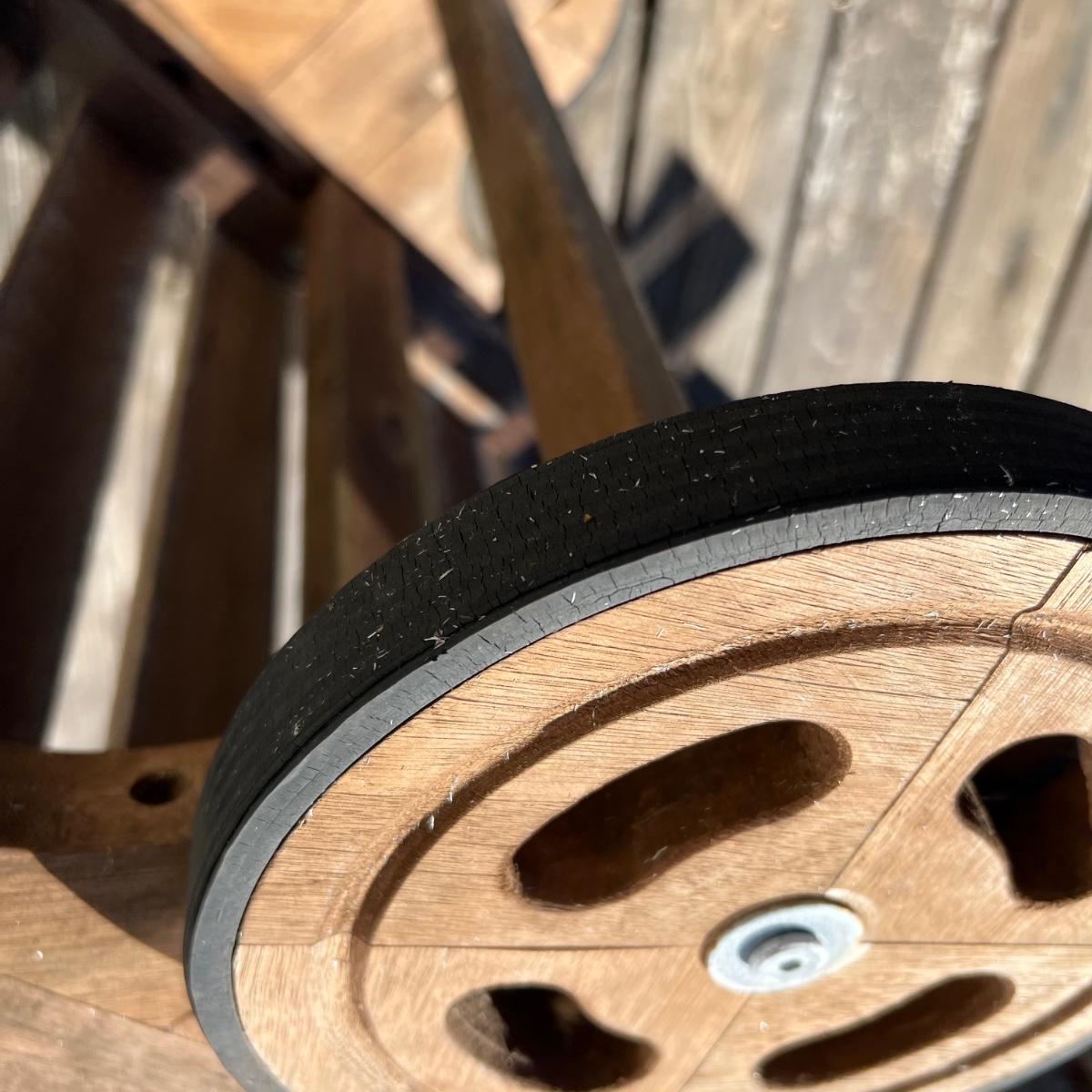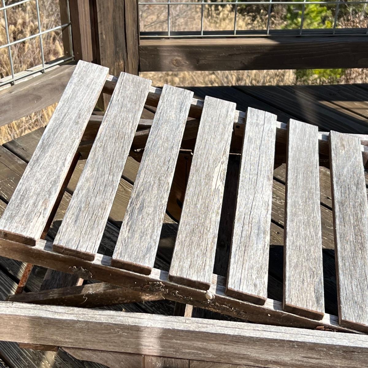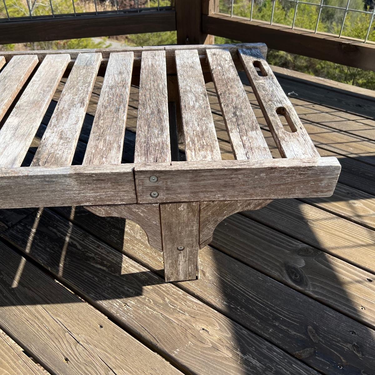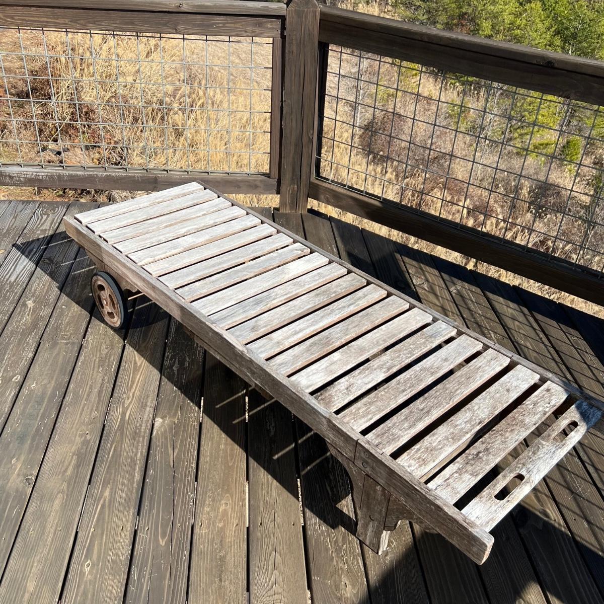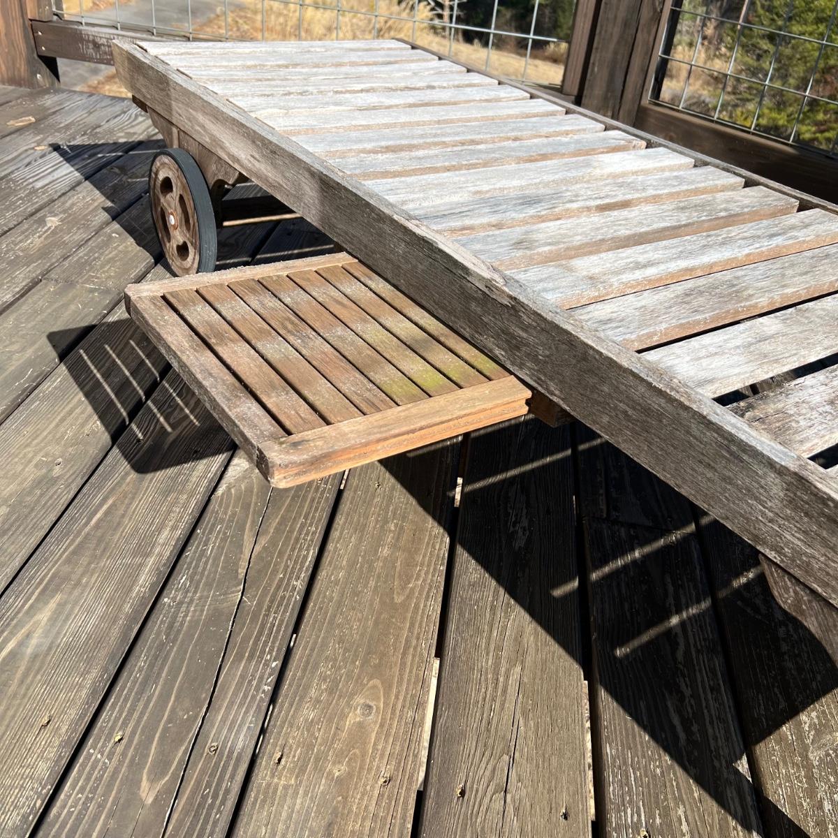 This teak lounger is weathered but some oil will quickly restore it if desired. It is in good condition structurally although the built-in tray is hard to pull out after a rain and there is surface rust on the metal pole that adjusts the tilt. Wheels are wood with rubber treads.