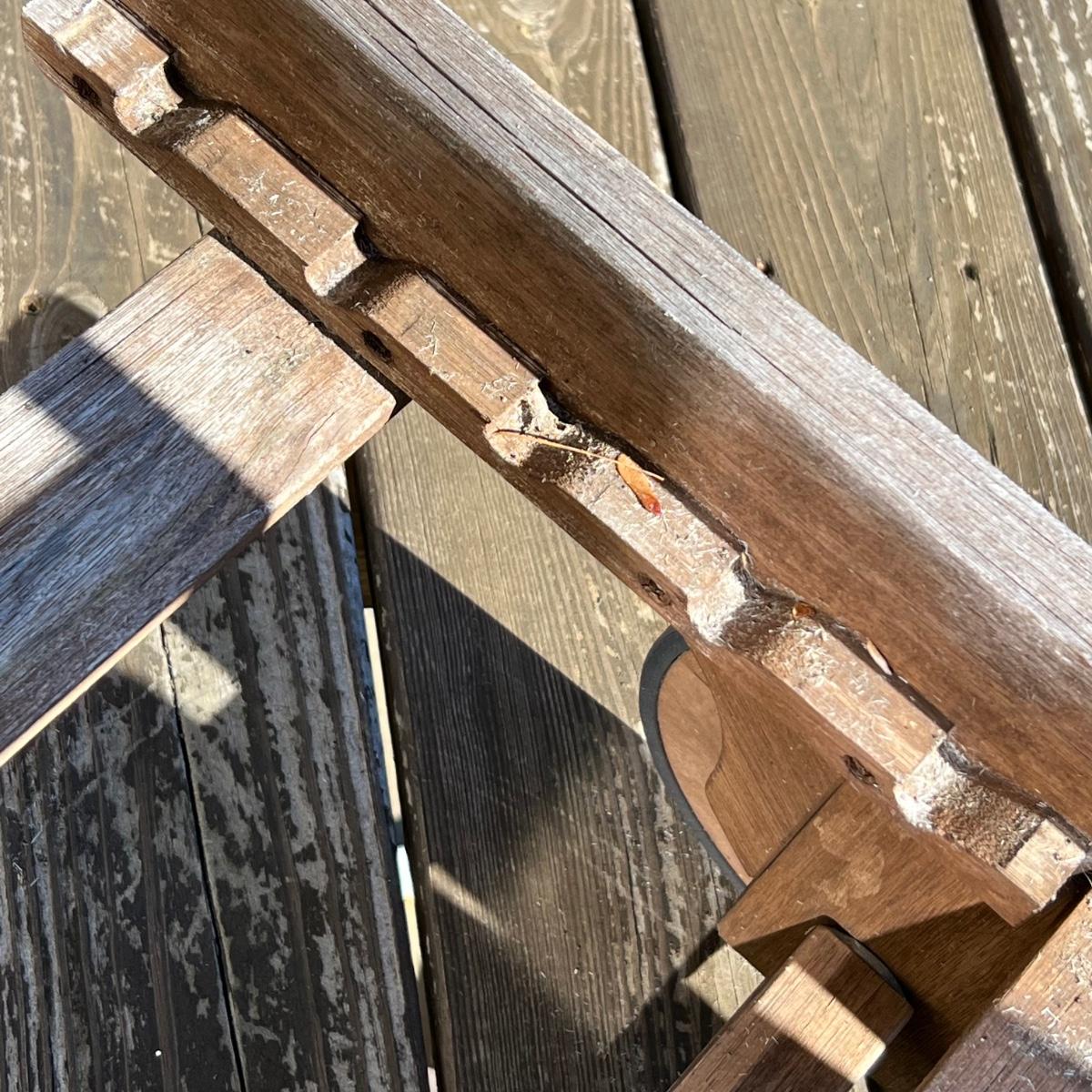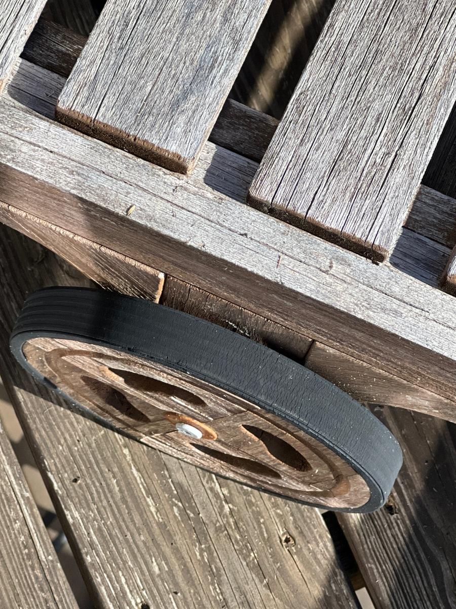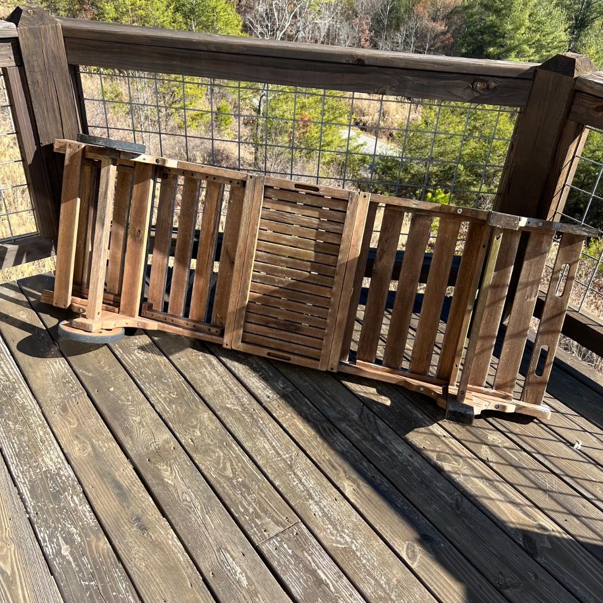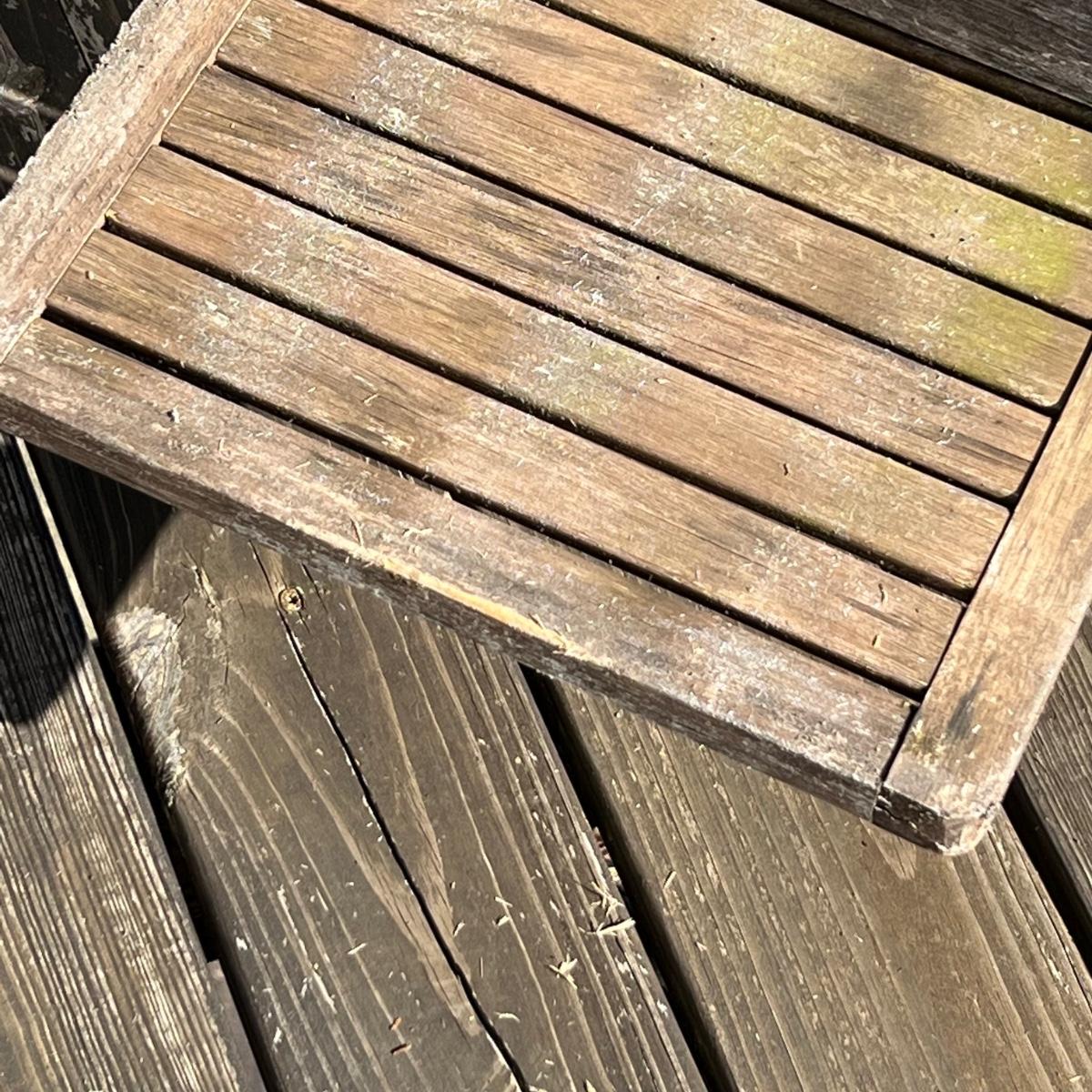 This teak lounger is weathered but some oil will quickly restore it if desired. It is in good condition structurally although the built-in tray is hard to pull out after a rain and there is surface rust on the metal pole that adjusts the tilt. Wheels are wood with rubber treads.