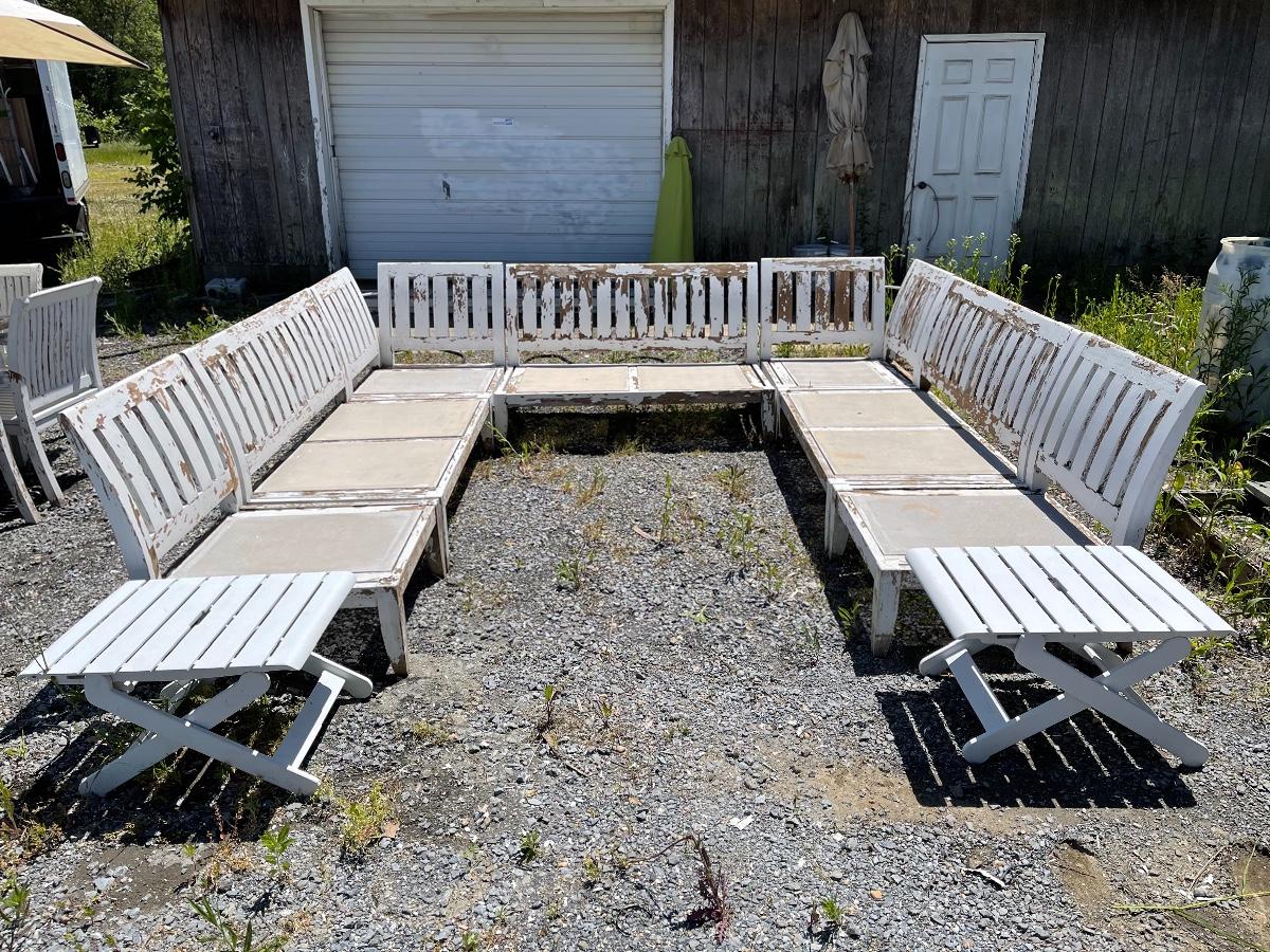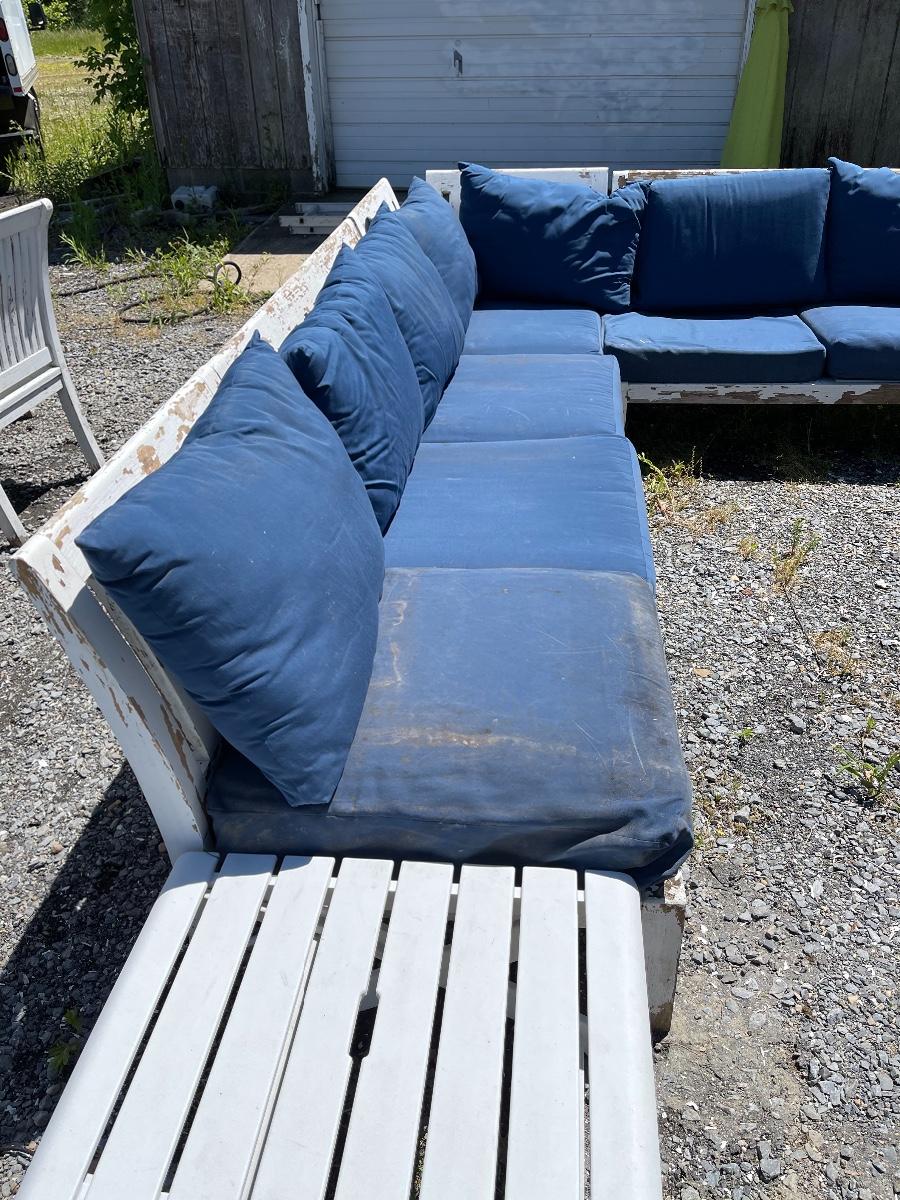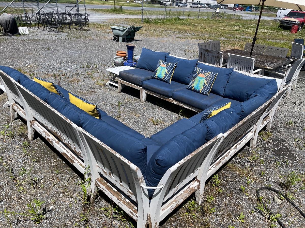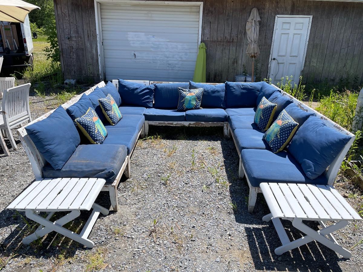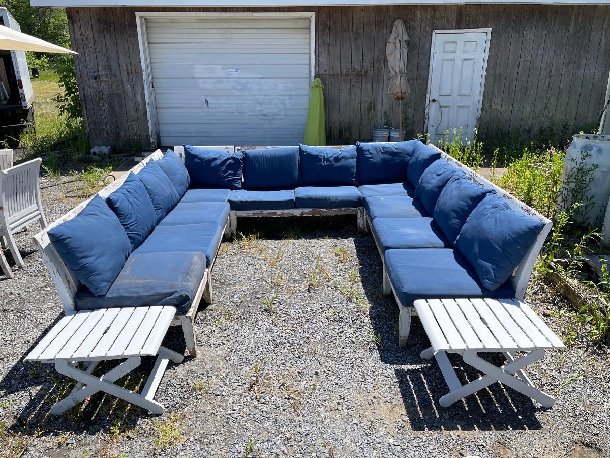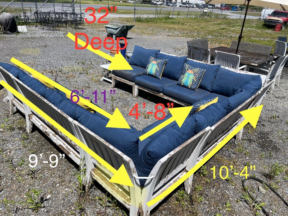 This is a fabulous teak wood outdoor sectional sofa by Kingsley Bate There are (7) sectional pieces that form a “U” shape. Versatile in many ways for a custom configuration. Comes with blue canvas seat /back cushions along with decorative pillows and a tan canvas umbrella-stand not included. Also included qty (2) plastic collapsible end tables (26” x19”). Please see photo with detailed dimensions of overall “U” shape sectional. Some of the pillows need repair-see pics. The canvas will need to be washed-overall condition of canvas seats/pillow backs in overall ok condition. There are also nylon mesh removable sections below each seat cushion for cleaning/storage, etc.. The teak wood as pictured has some flaking paint. Would make a great outdoor lounge area if refurbished or can be used “as is”.