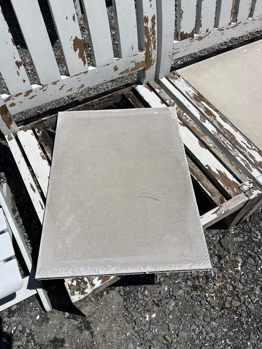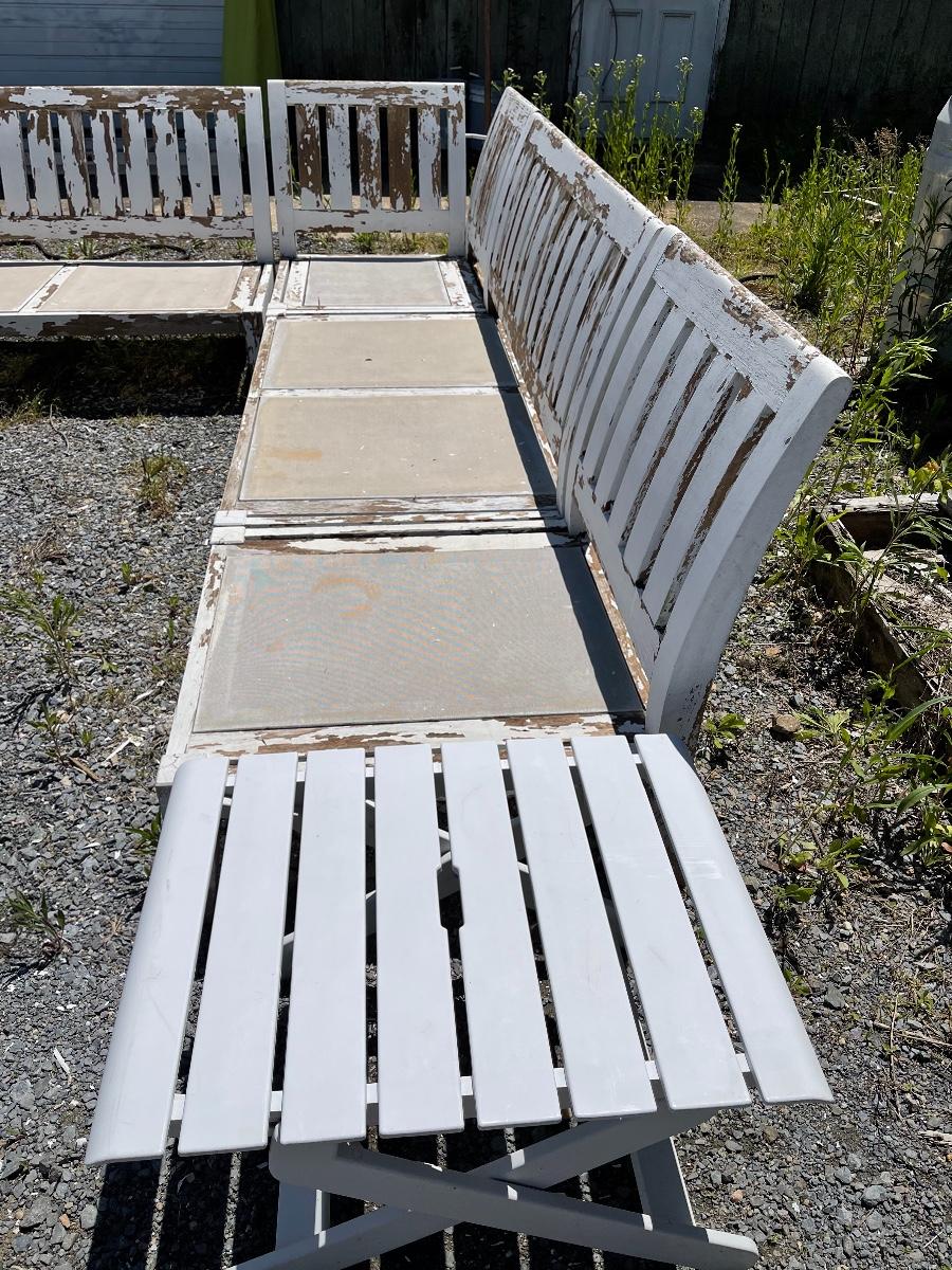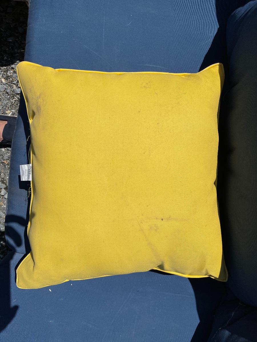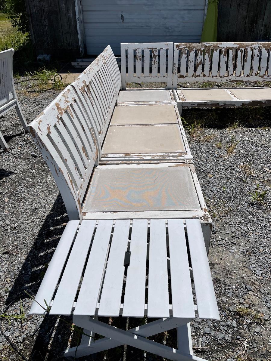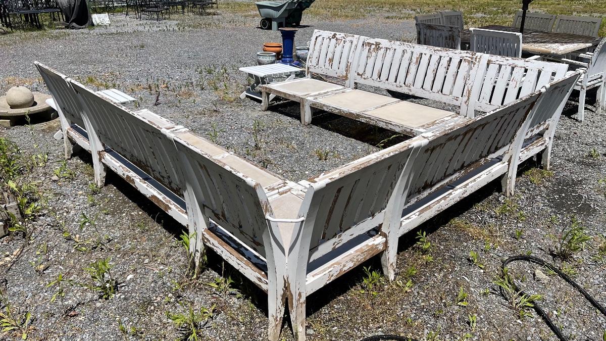This is a fabulous teak wood outdoor sectional sofa by Kingsley Bate There are (7) sectional pieces that form a “U” shape. Versatile in many ways for a custom configuration. Comes with blue canvas seat /back cushions along with decorative pillows and a tan canvas umbrella-stand not included. Also included qty (2) plastic collapsible end tables (26” x19”). Please see photo with detailed dimensions of overall “U” shape sectional. Some of the pillows need repair-see pics. The canvas will need to be washed-overall condition of canvas seats/pillow backs in overall ok condition. There are also nylon mesh removable sections below each seat cushion for cleaning/storage, etc.. The teak wood as pictured has some flaking paint. Would make a great outdoor lounge area if refurbished or can be used “as is”.
