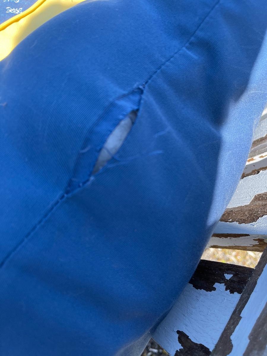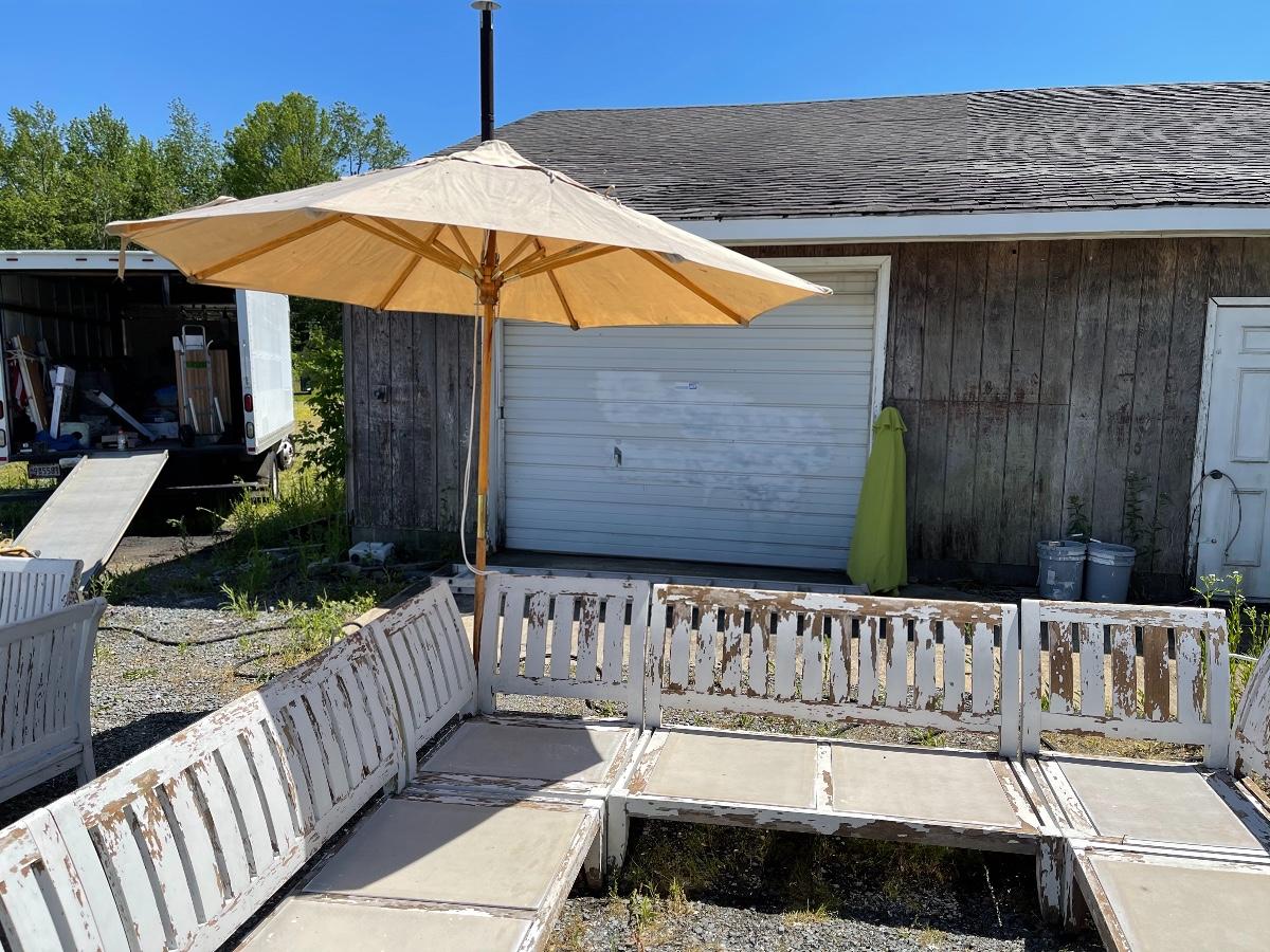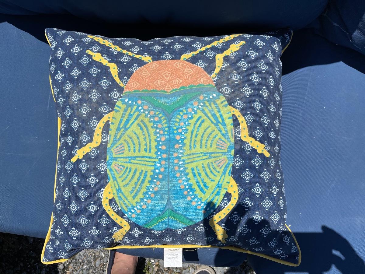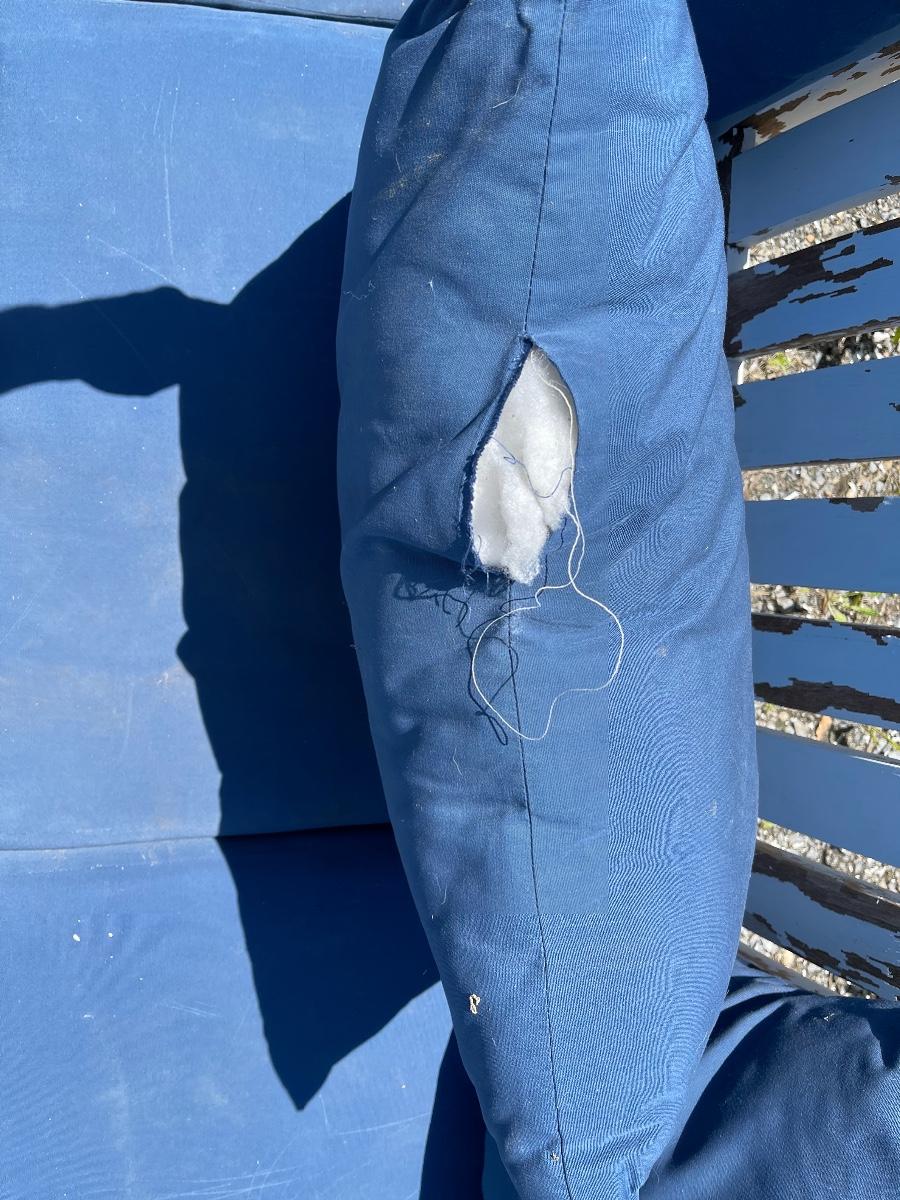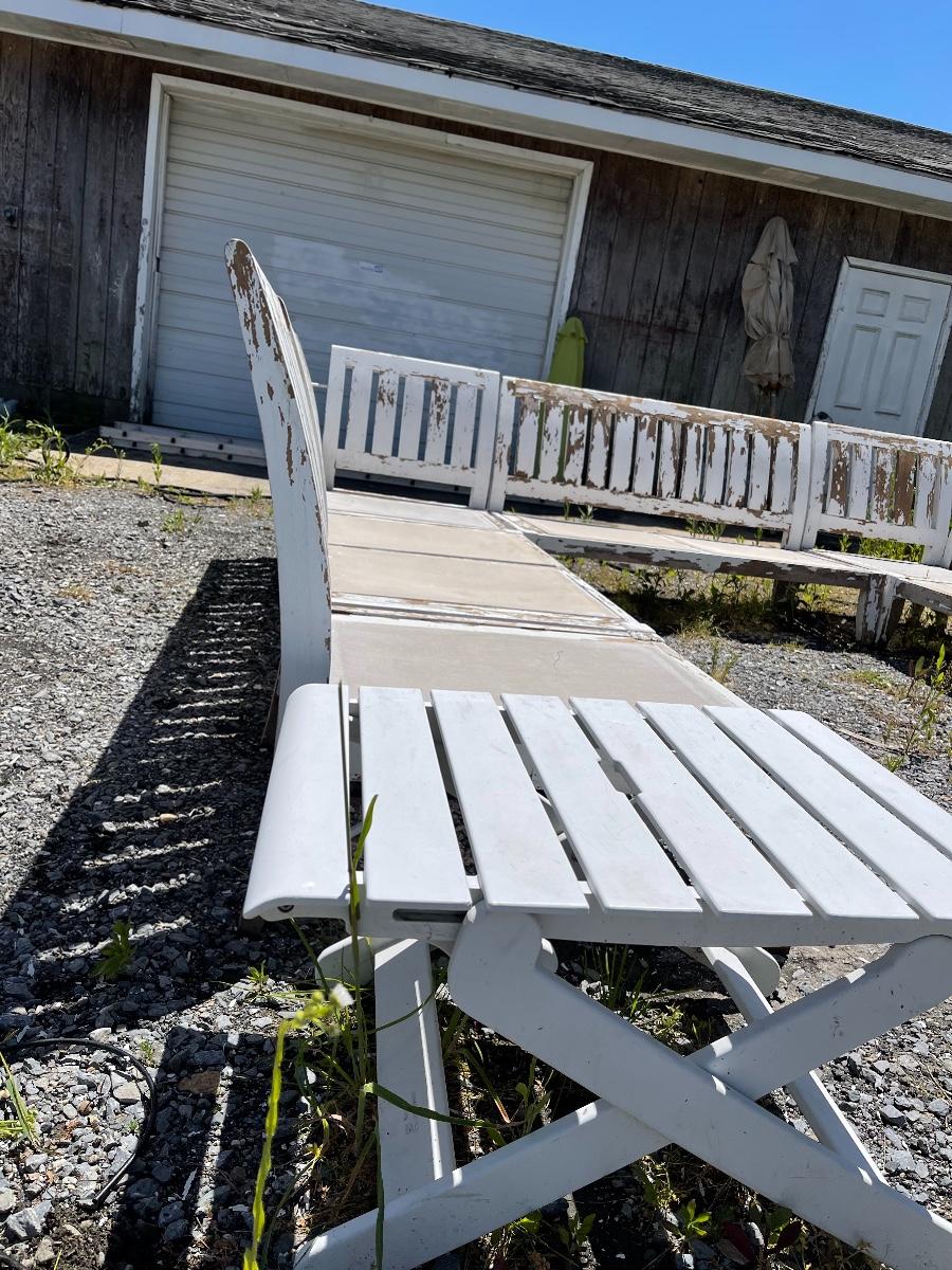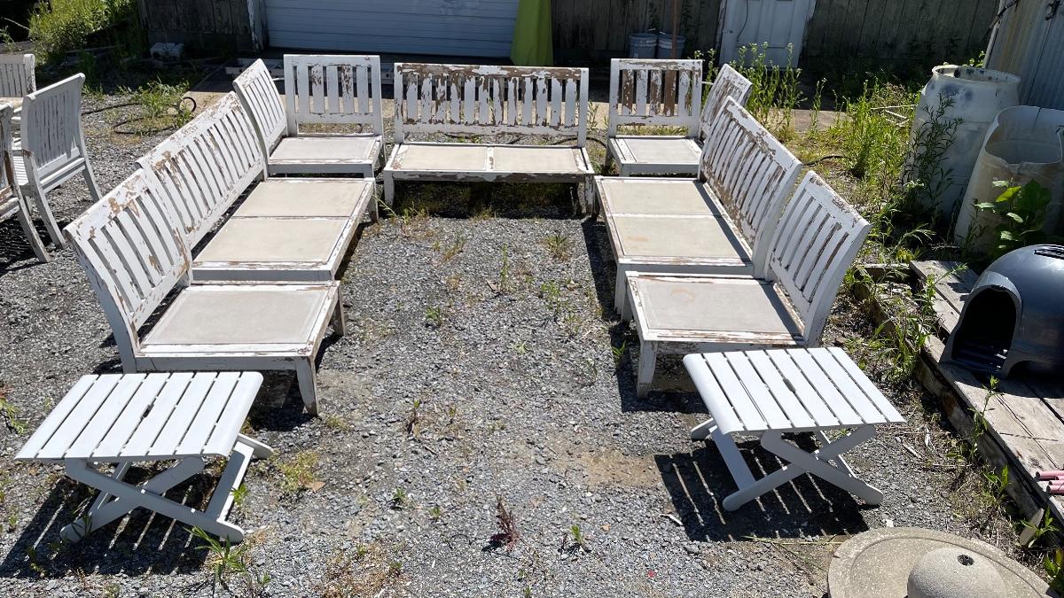 This is a fabulous teak wood outdoor sectional sofa by Kingsley Bate There are (7) sectional pieces that form a “U” shape. Versatile in many ways for a custom configuration. Comes with blue canvas seat /back cushions along with decorative pillows and a tan canvas umbrella-stand not included. Also included qty (2) plastic collapsible end tables (26” x19”). Please see photo with detailed dimensions of overall “U” shape sectional. Some of the pillows need repair-see pics. The canvas will need to be washed-overall condition of canvas seats/pillow backs in overall ok condition. There are also nylon mesh removable sections below each seat cushion for cleaning/storage, etc.. The teak wood as pictured has some flaking paint. Would make a great outdoor lounge area if refurbished or can be used “as is”.