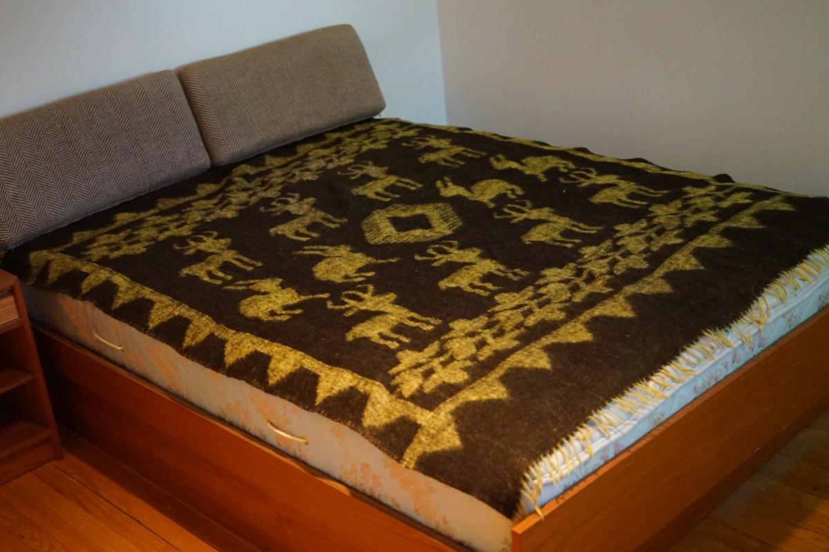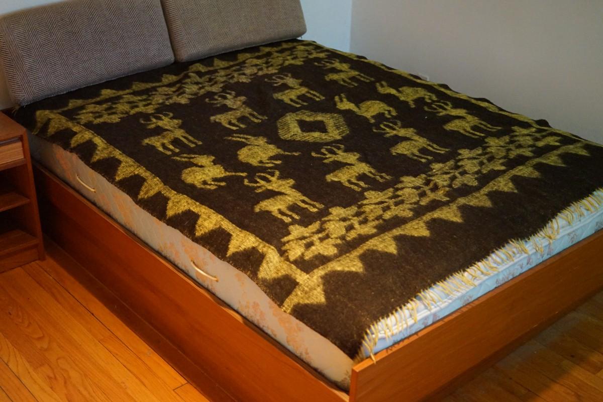 Good condition. sturdy. slat wooden support. Mattress goes with if you want. The blanket is sold seperatly.