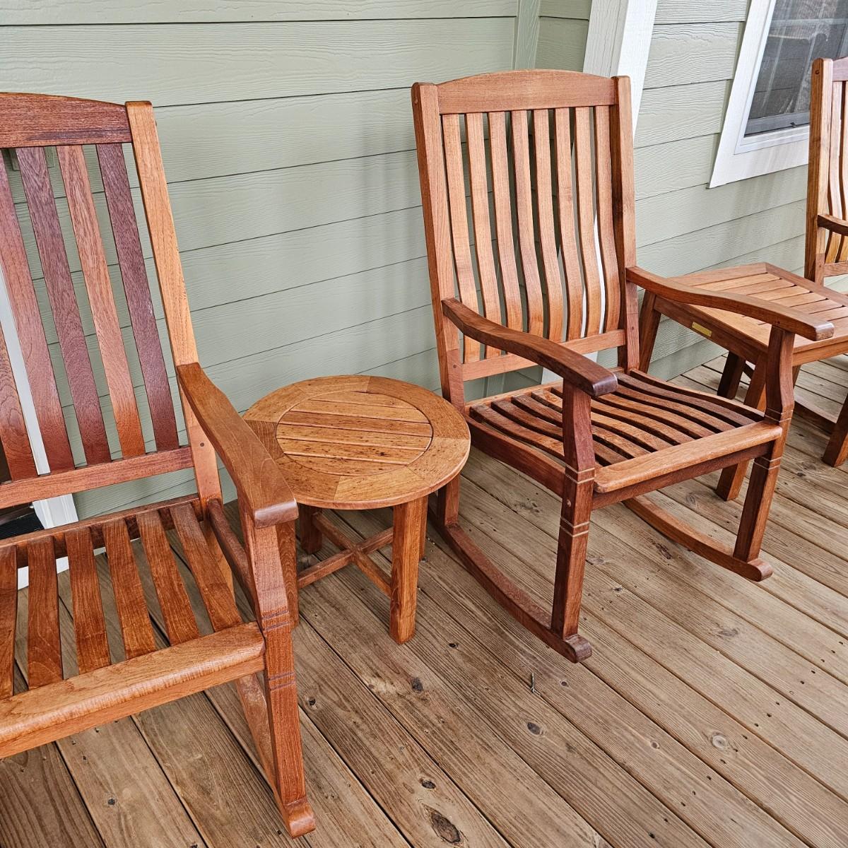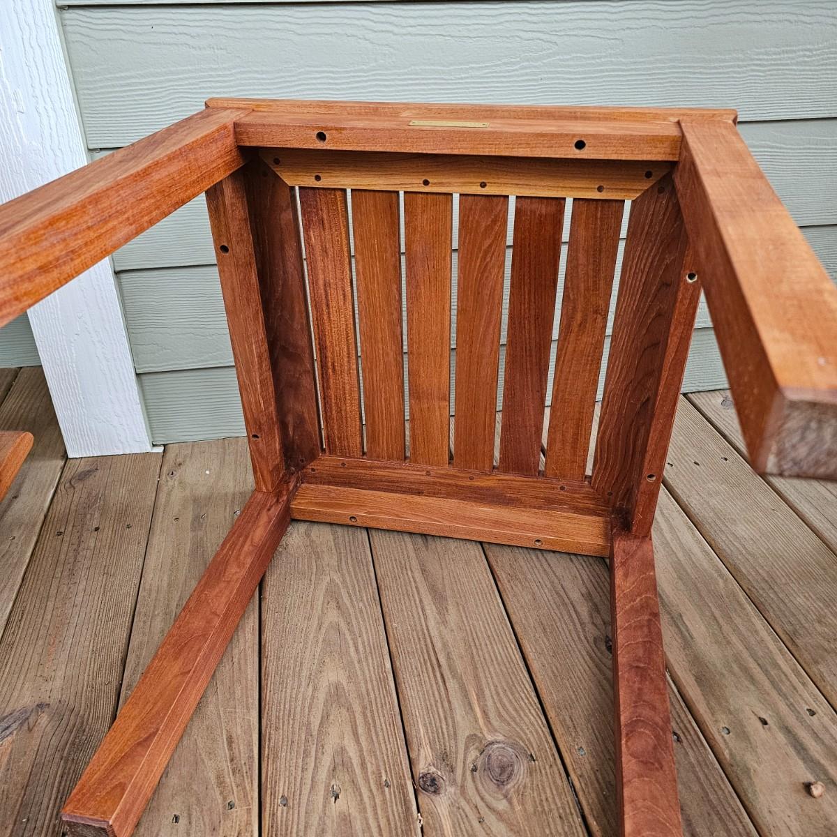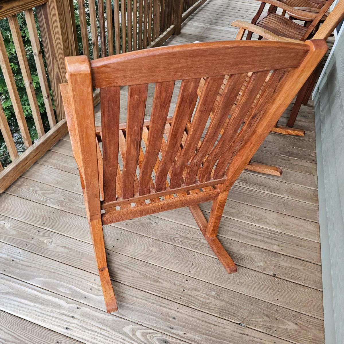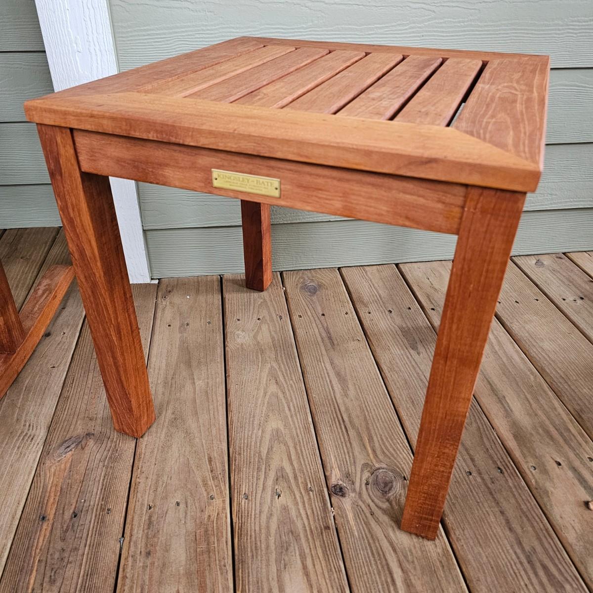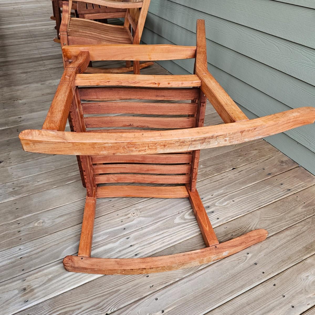 Four rocking chairs and two side tables, all teak wood. Rockers have open slat backs and seats, measure 25" x 32" x 44"H, have 18" seat height. Round table is 20"D x 18"H, square table is 20" x 20" x 20" x H, has sign on side, Kingsley Bate from Manassas, VA. See photos for details. Local pickup only.