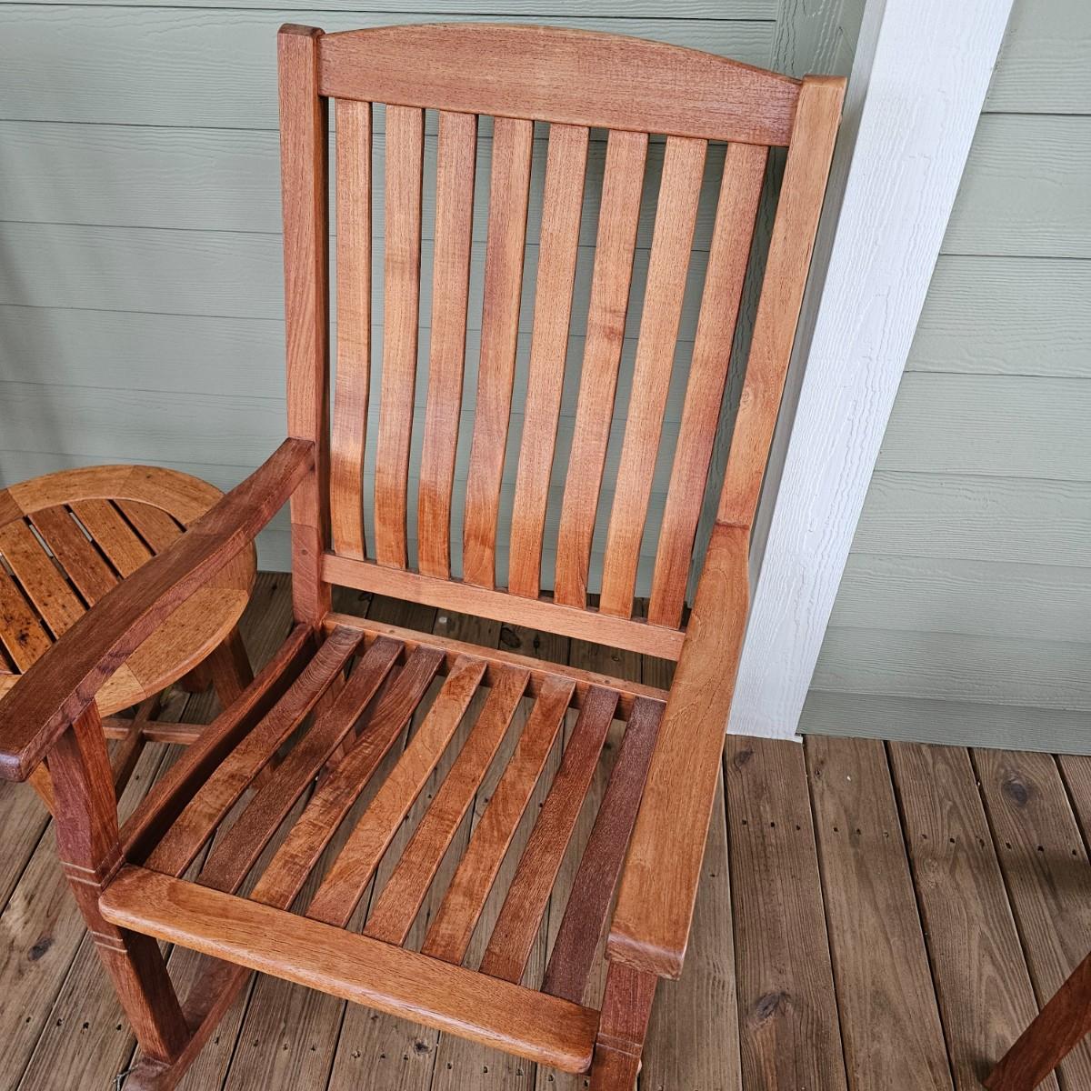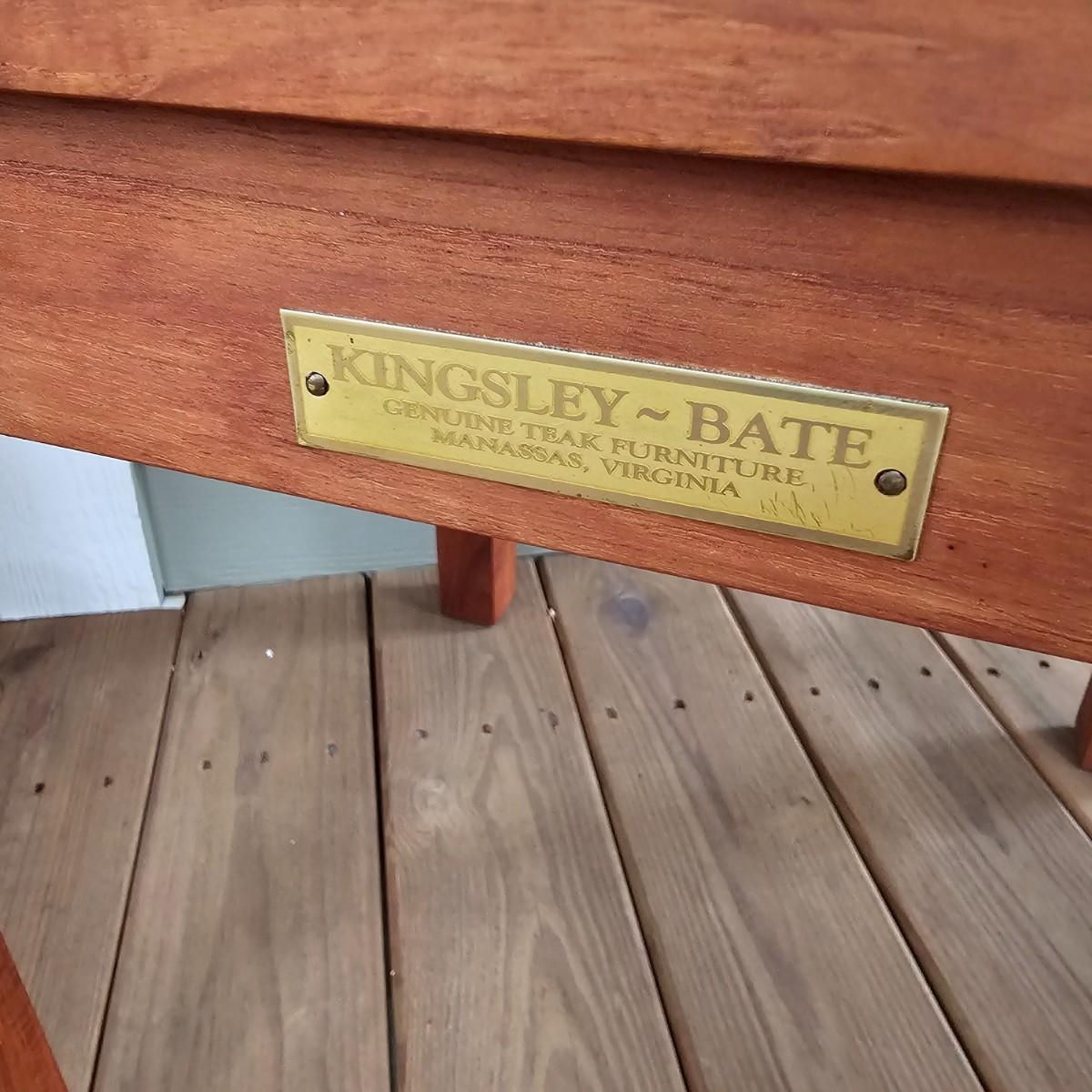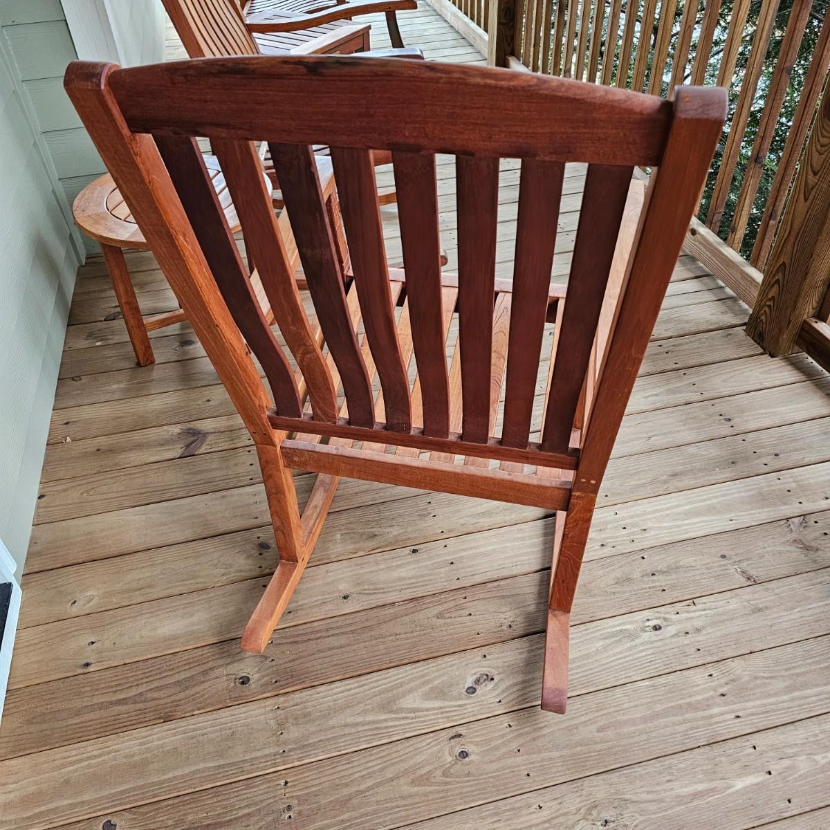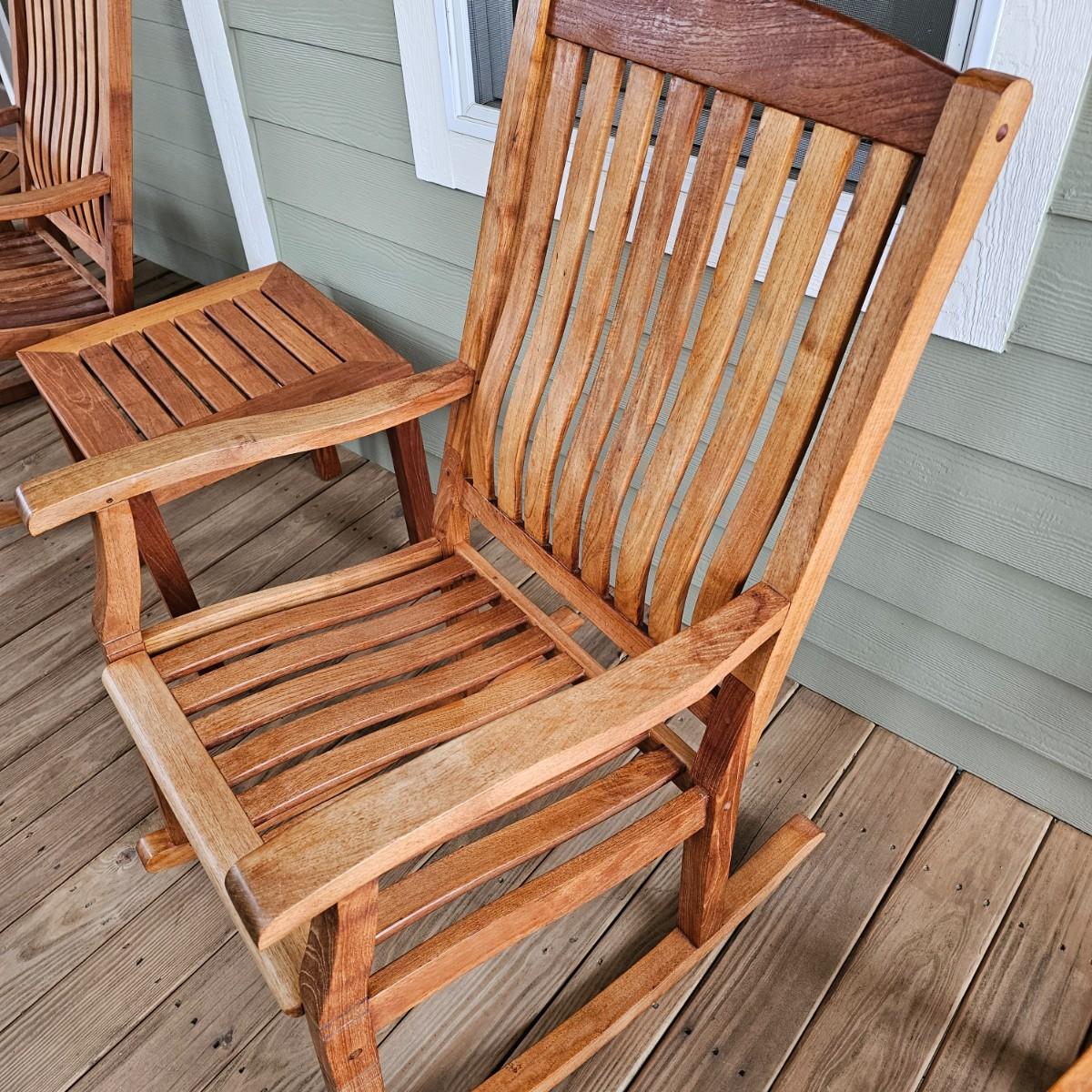 Four rocking chairs and two side tables, all teak wood. Rockers have open slat backs and seats, measure 25" x 32" x 44"H, have 18" seat height. Round table is 20"D x 18"H, square table is 20" x 20" x 20" x H, has sign on side, Kingsley Bate from Manassas, VA. See photos for details. Local pickup only.