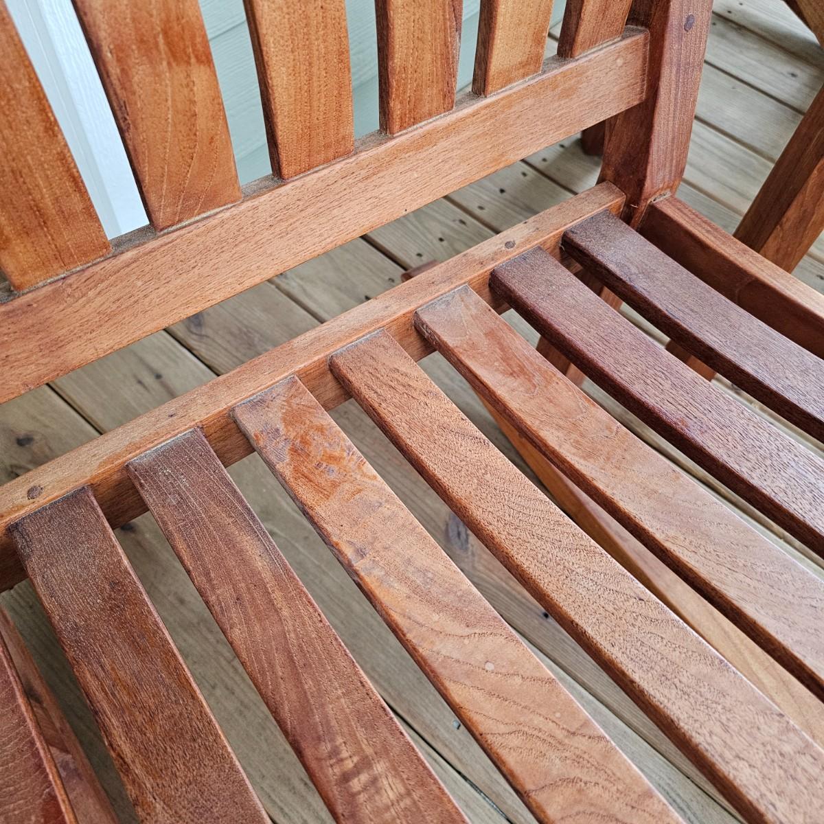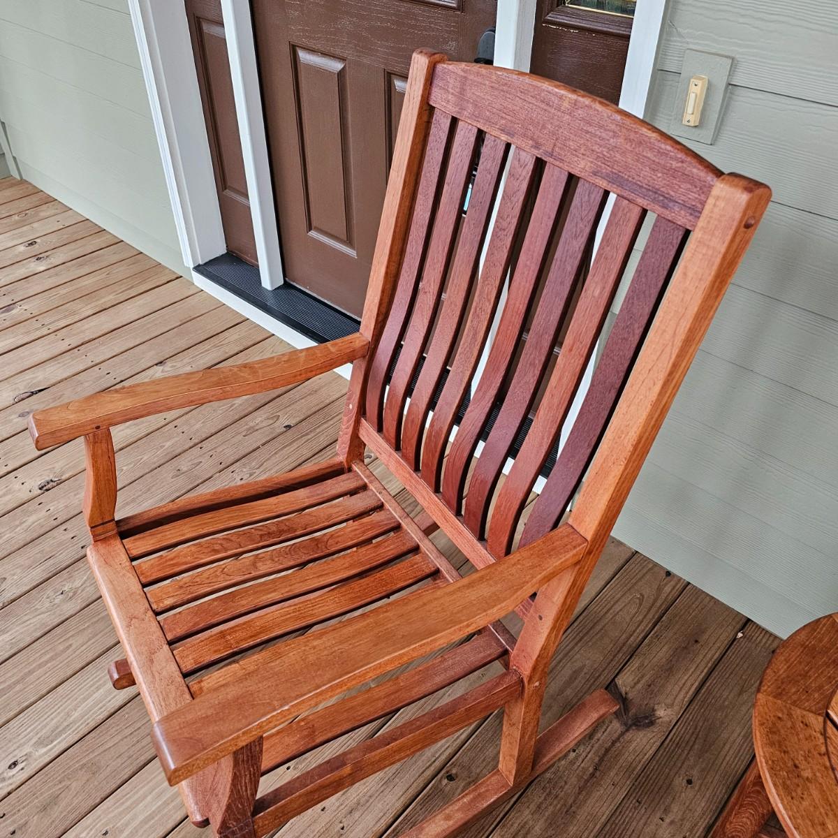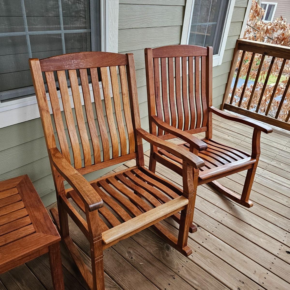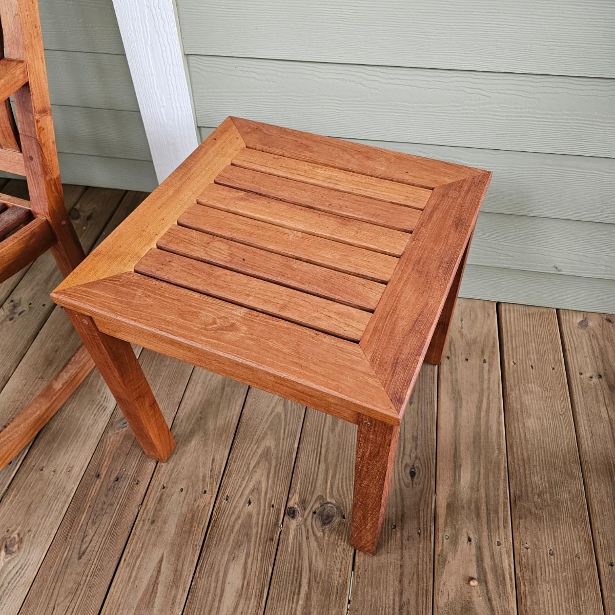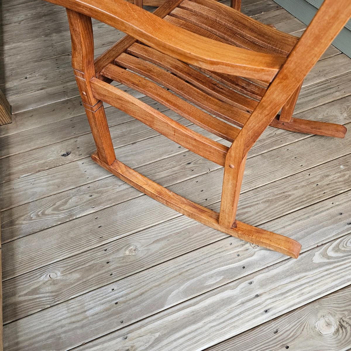 Four rocking chairs and two side tables, all teak wood. Rockers have open slat backs and seats, measure 25" x 32" x 44"H, have 18" seat height. Round table is 20"D x 18"H, square table is 20" x 20" x 20" x H, has sign on side, Kingsley Bate from Manassas, VA. See photos for details. Local pickup only.