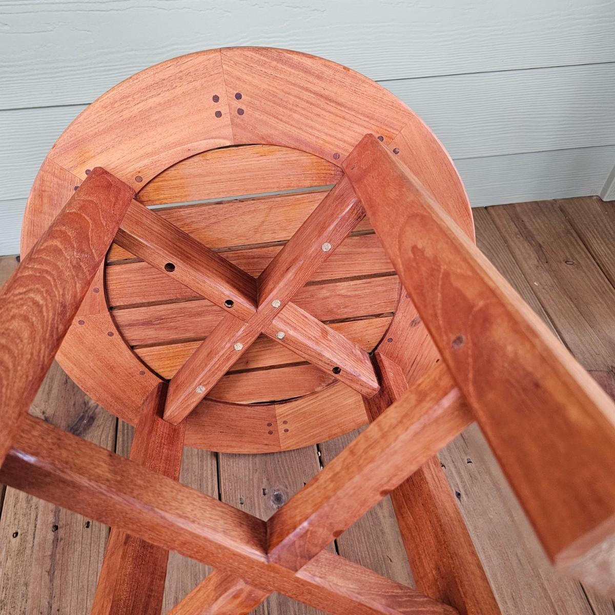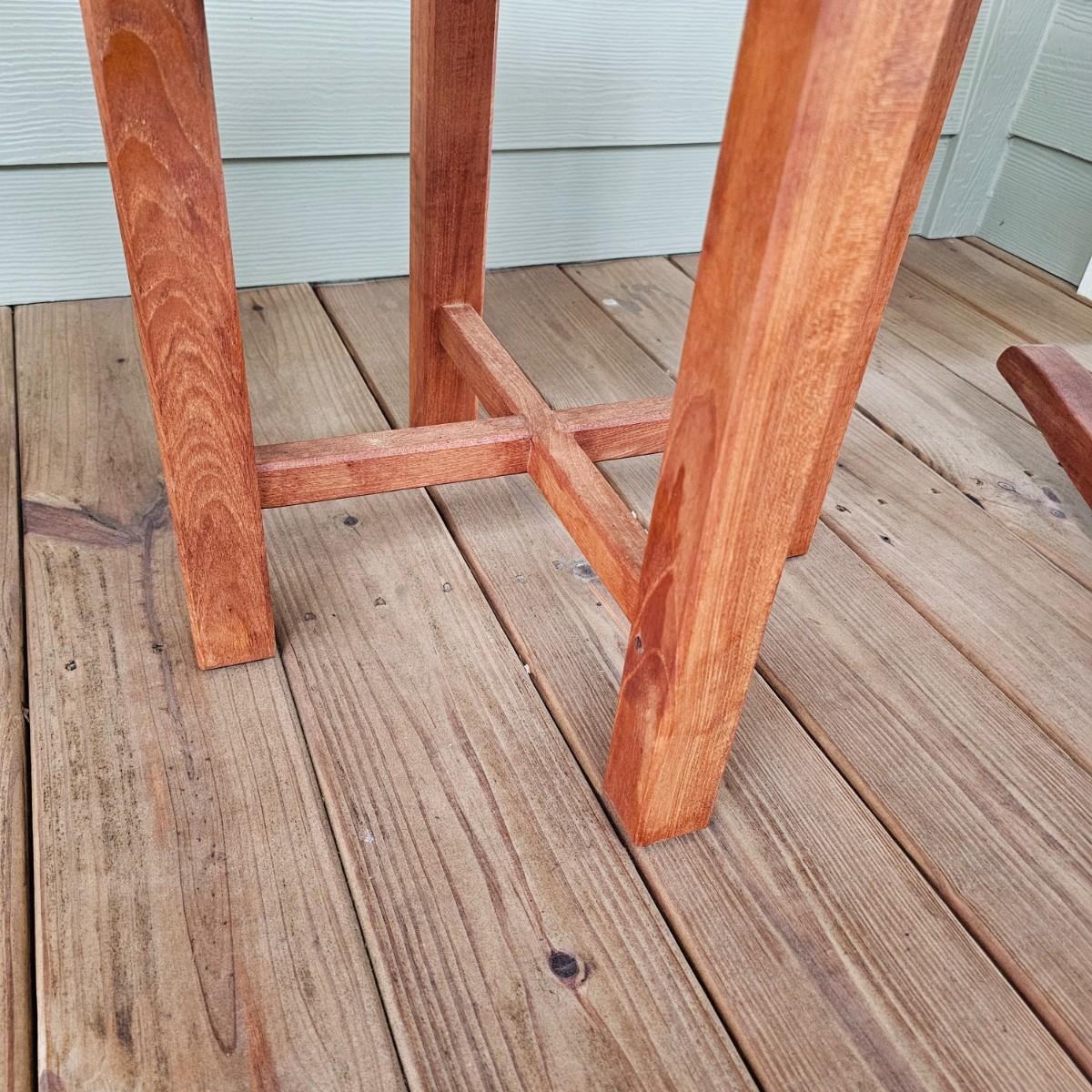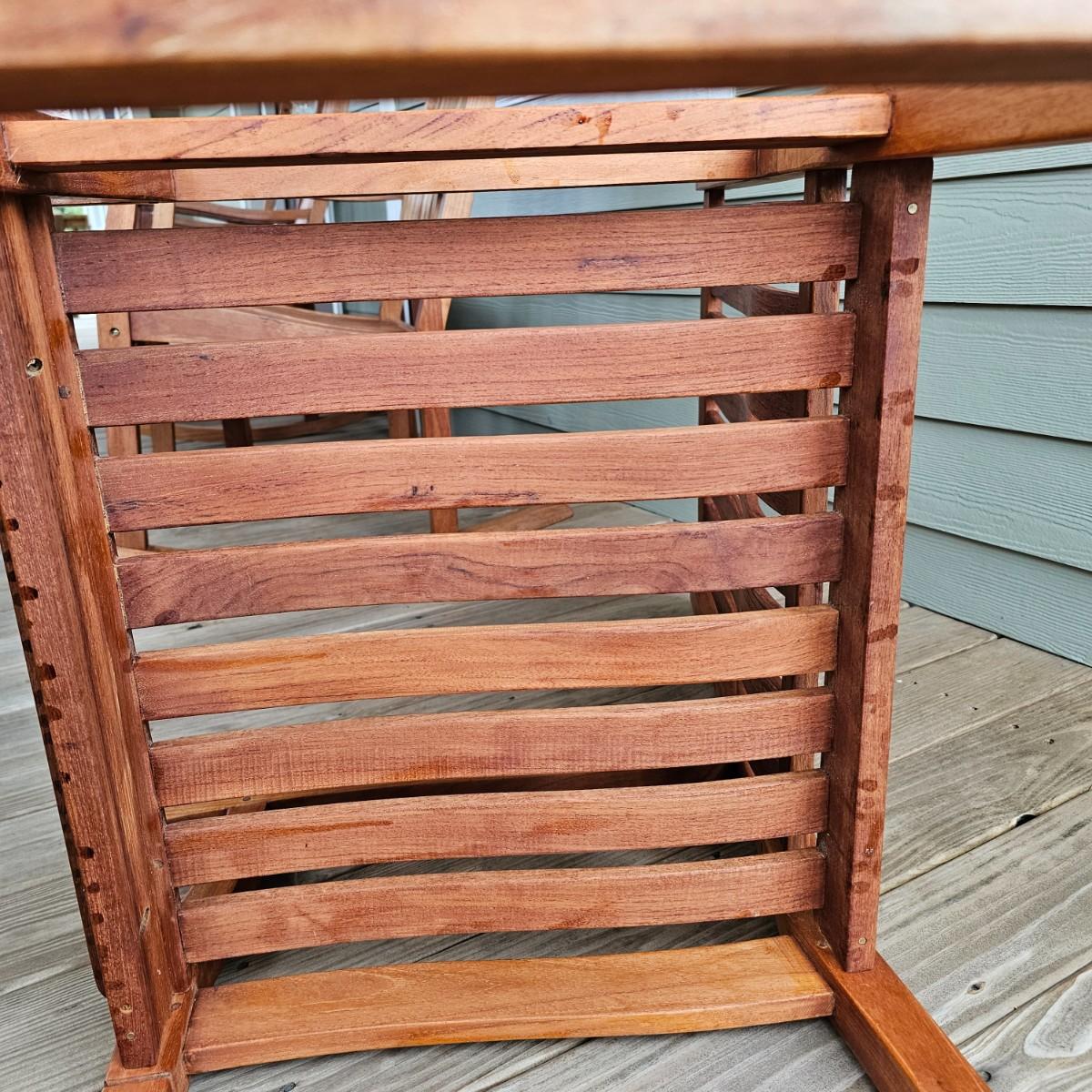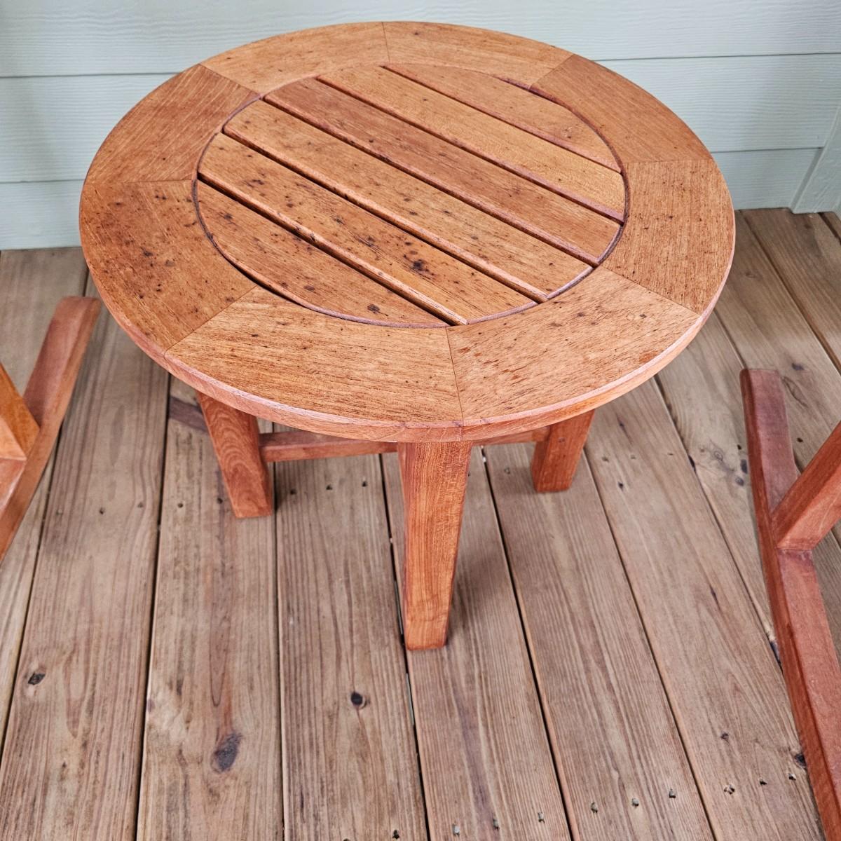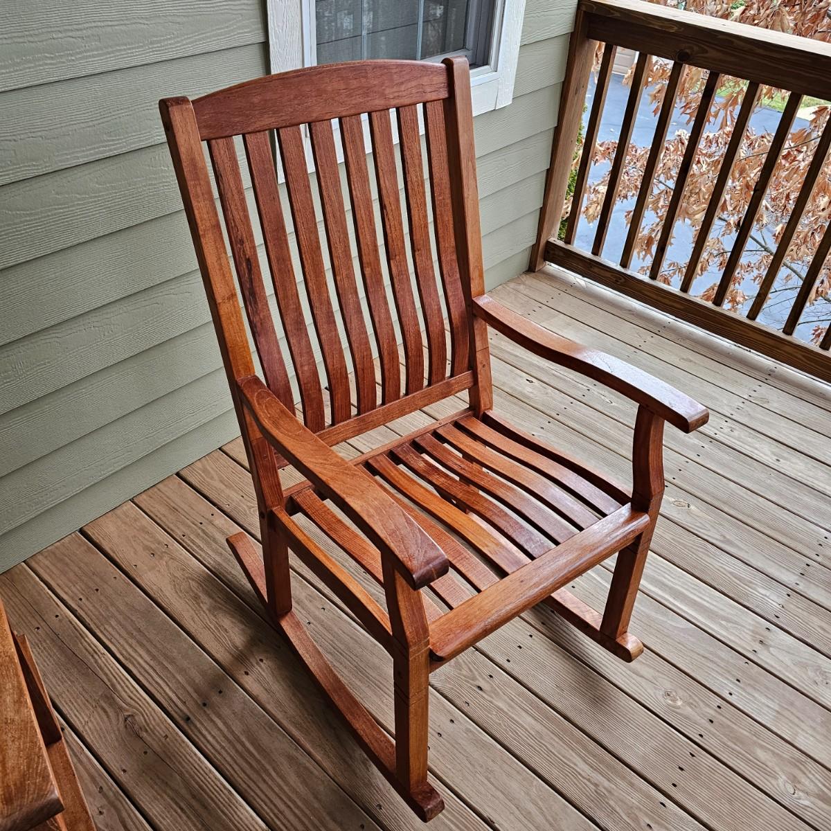 Four rocking chairs and two side tables, all teak wood. Rockers have open slat backs and seats, measure 25" x 32" x 44"H, have 18" seat height. Round table is 20"D x 18"H, square table is 20" x 20" x 20" x H, has sign on side, Kingsley Bate from Manassas, VA. See photos for details. Local pickup only.