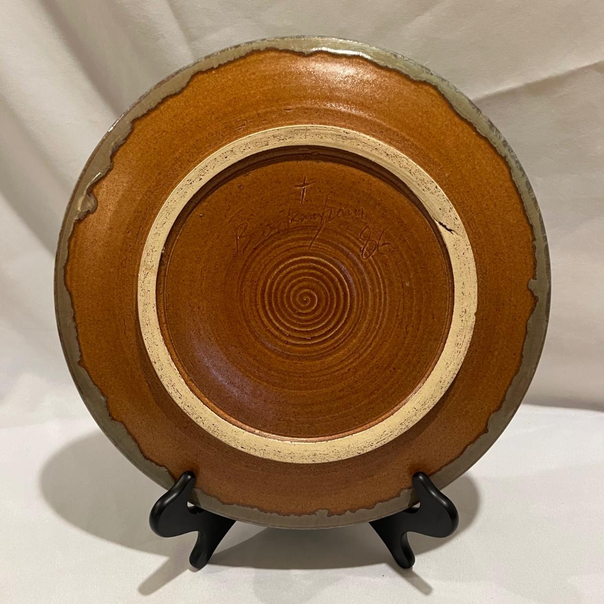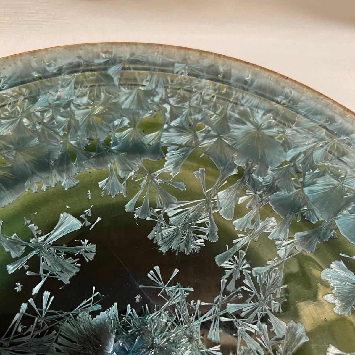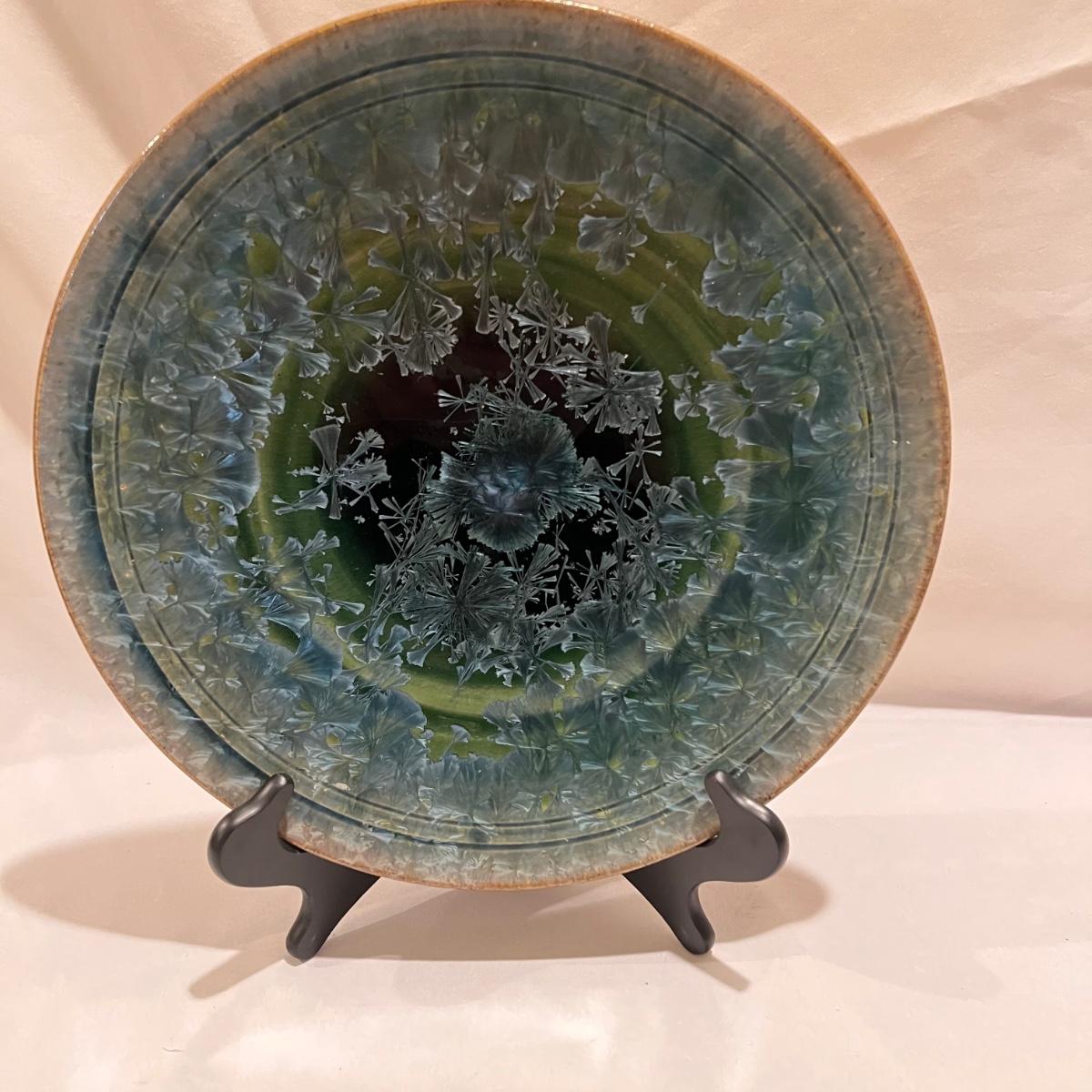 Lovely green and teal blue serving platter measures 14”D. Glaze appears iridescent almost as snowflakes. See photographs for signature. Plate stand is not included.
