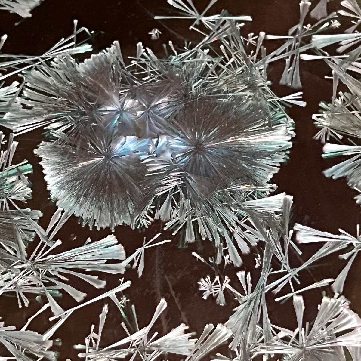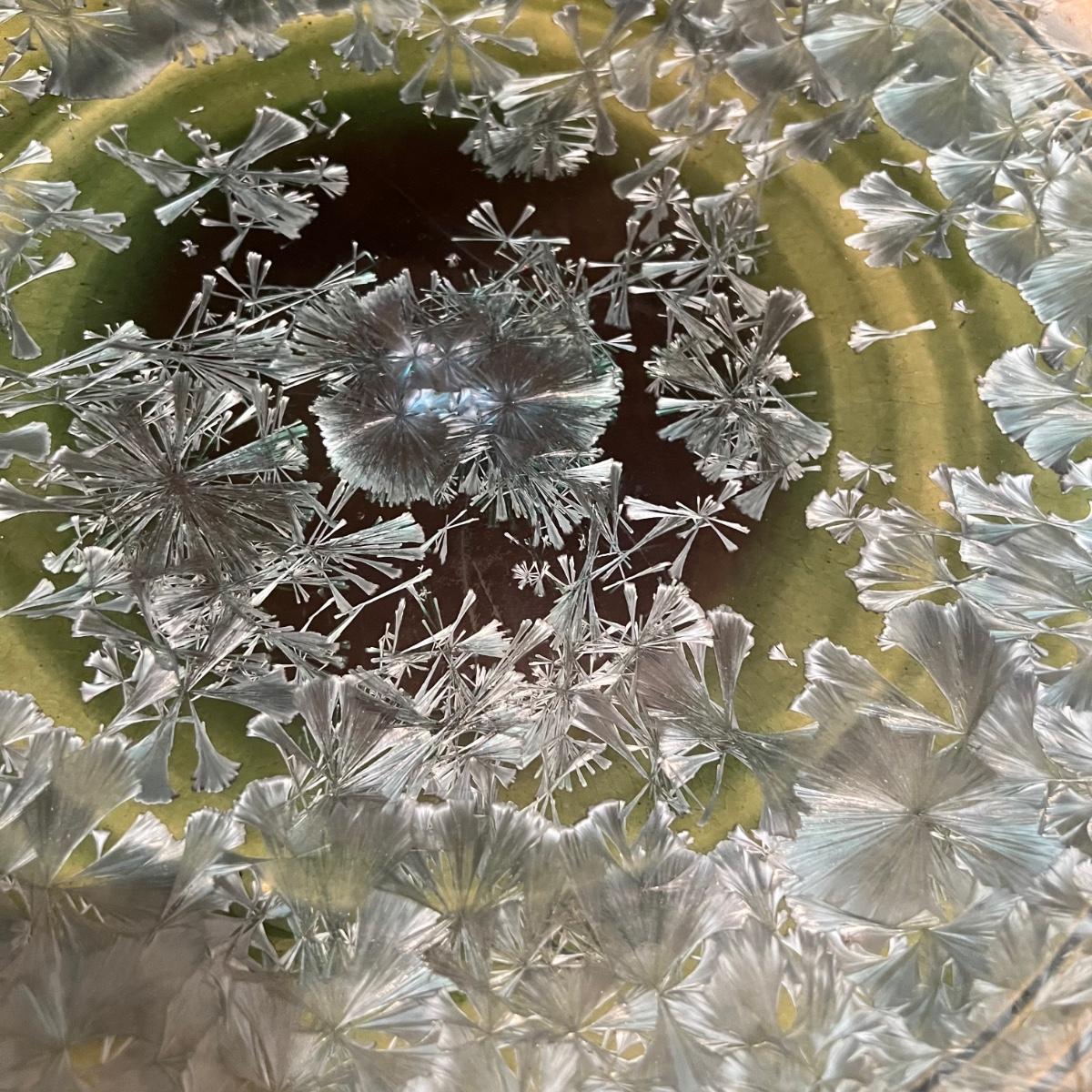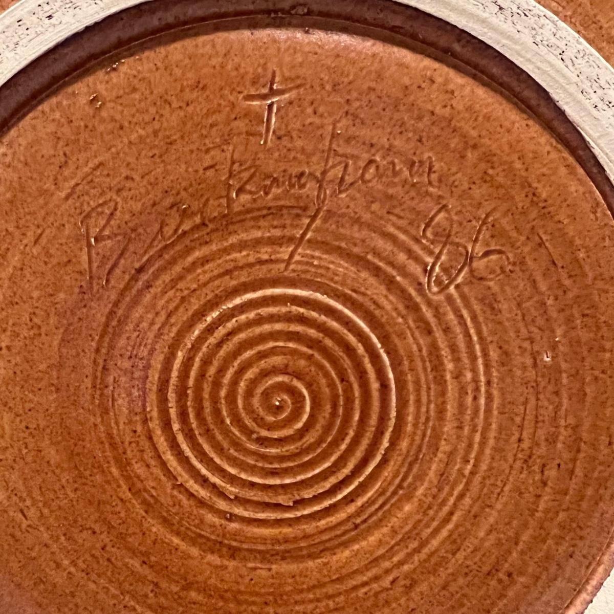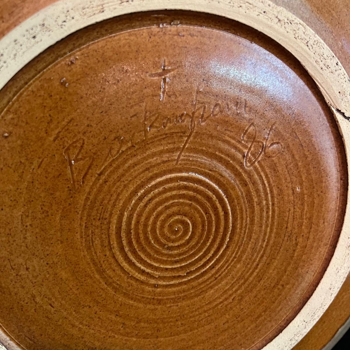 Lovely green and teal blue serving platter measures 14”D. Glaze appears iridescent almost as snowflakes. See photographs for signature. Plate stand is not included.