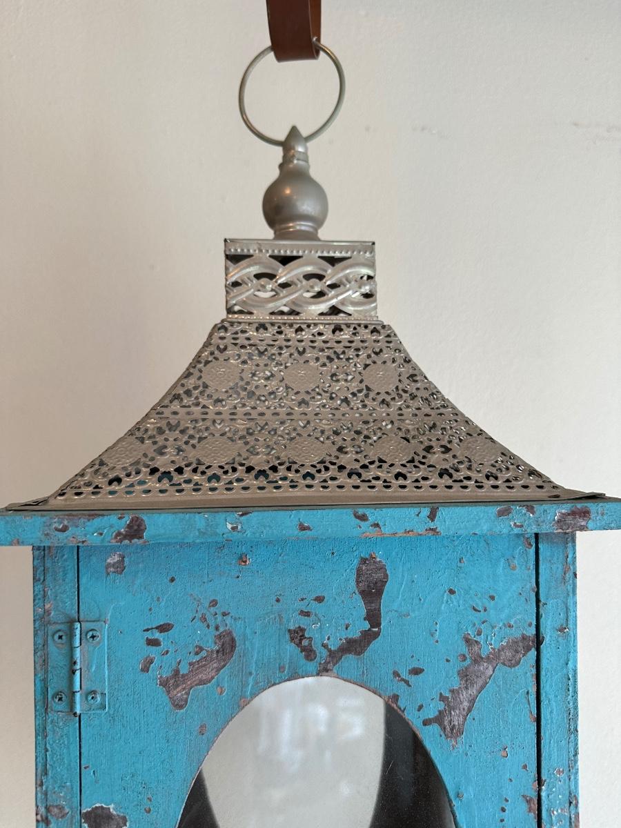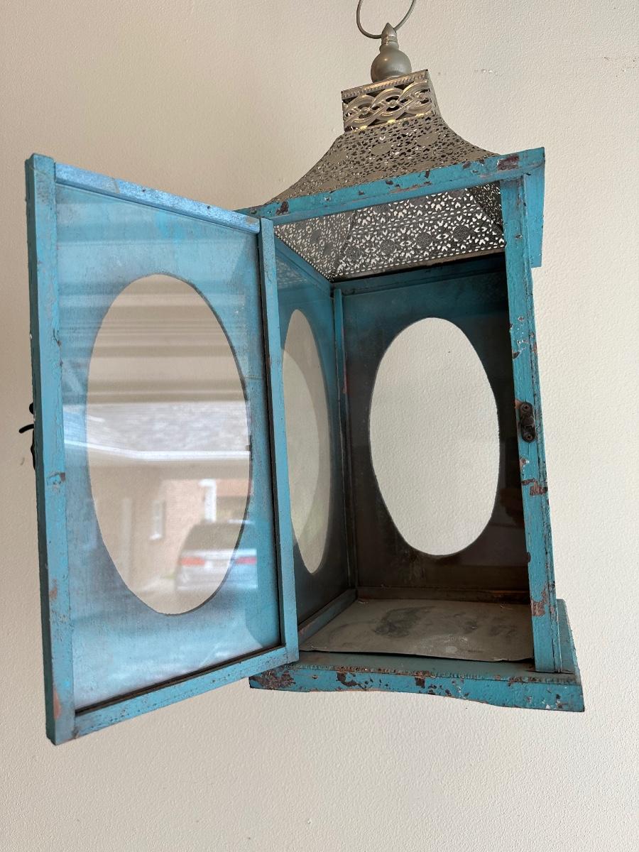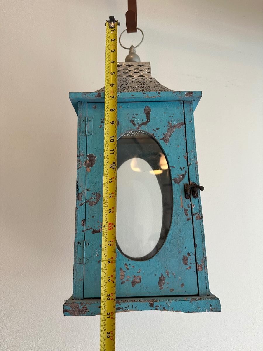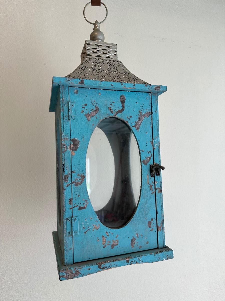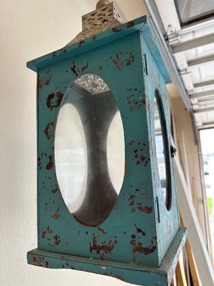 Large Teal Blue Wood & Metal Lantern Terrarium with Glass Windows