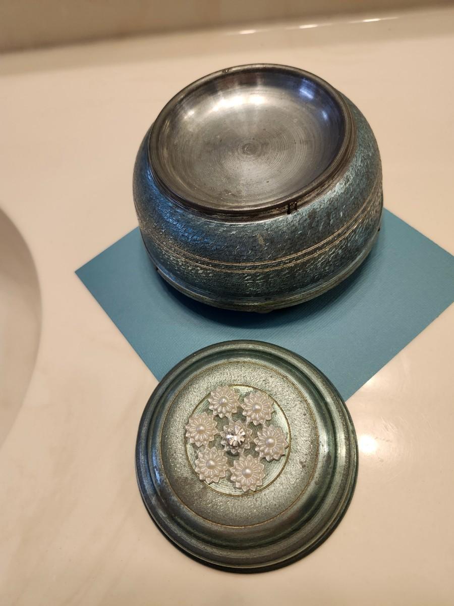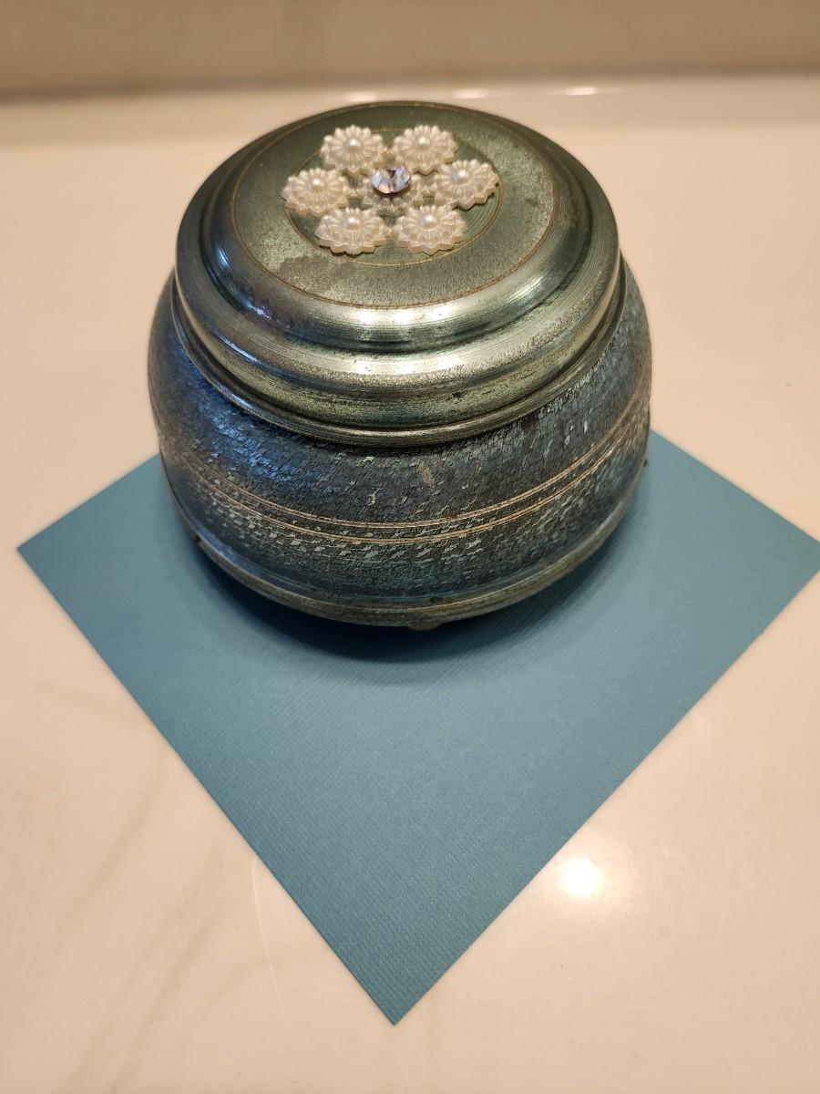 Vi ntage blue metallic music box with 7 white rosettes centerpiece on the lid.