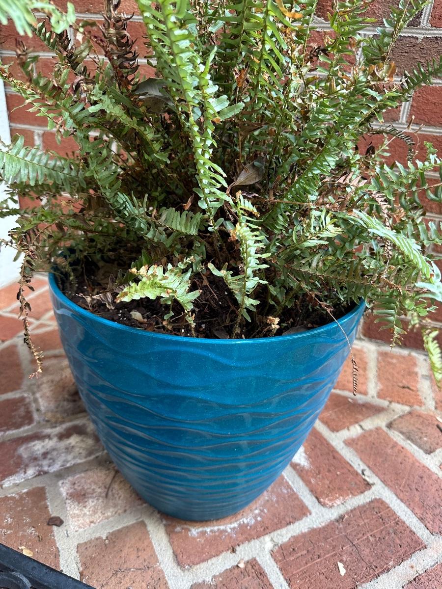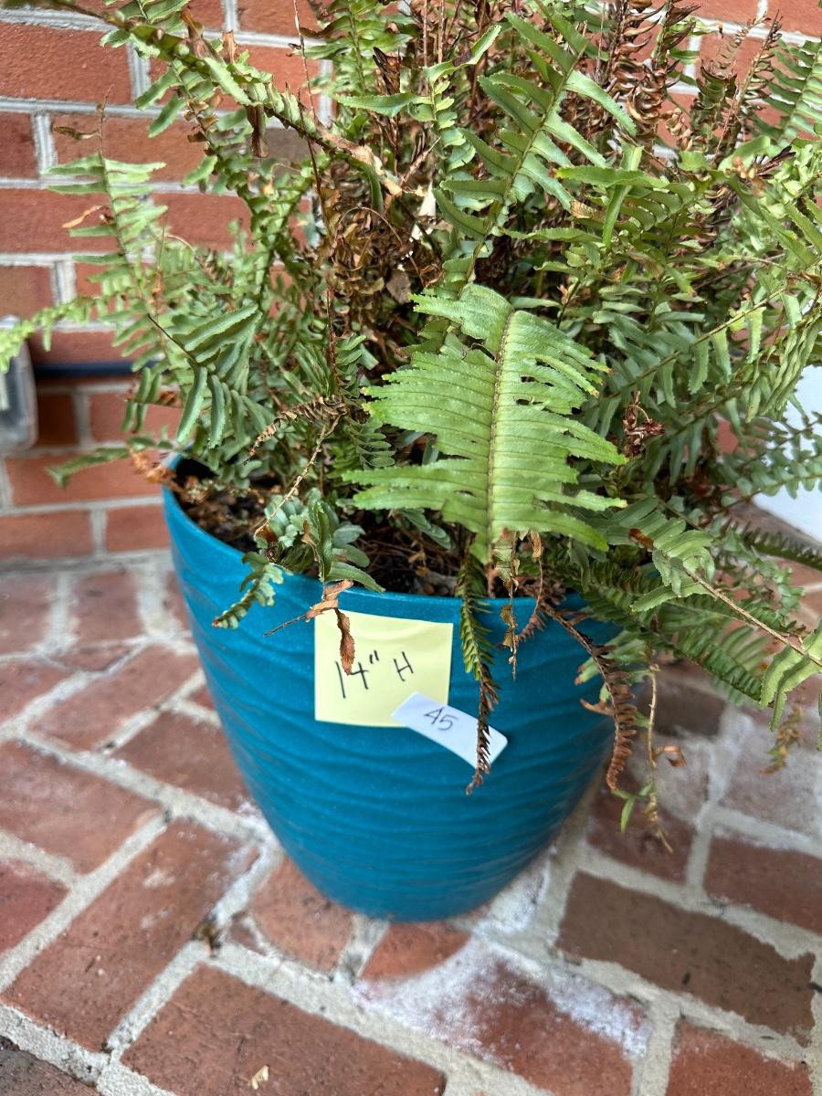 PR TEAL PLASTIC PLANTERS 14" TALL WITH FERNS