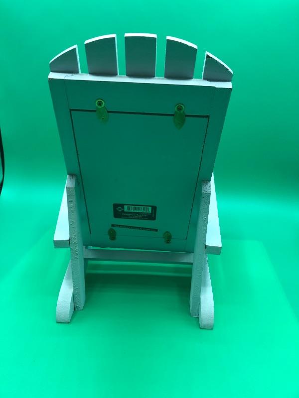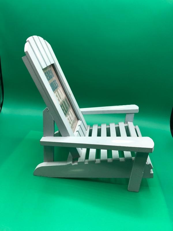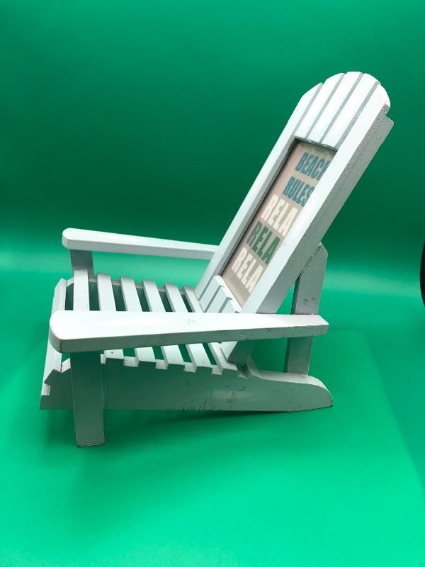 Light teal blue wood beach chair. Framed slogan reads "Beach Rules Relax Relax Relax". Could be used as a picture frame instead. Holds a 4"x6" picture.