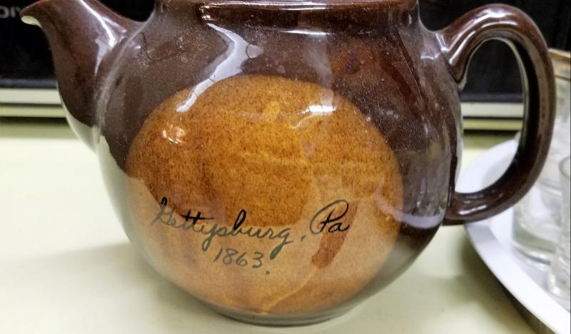 Marked Gettysburg Pennsylvania, 1863 teapots, souvenir, copper creamer, and Various sized shot glasses