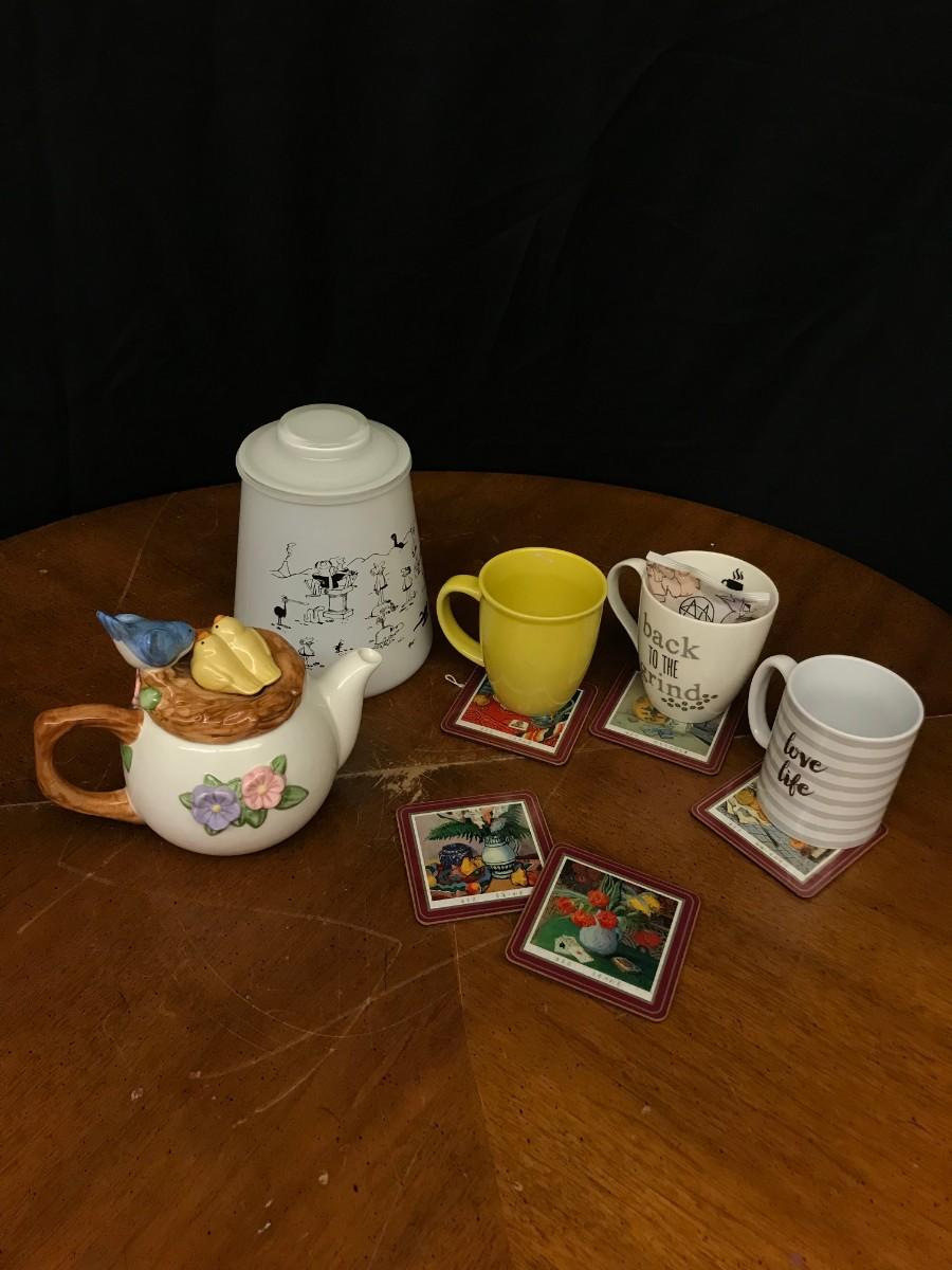 glassware : teapot,coffee mugs, coasters, cookie jar featuring vintage comic scenes;