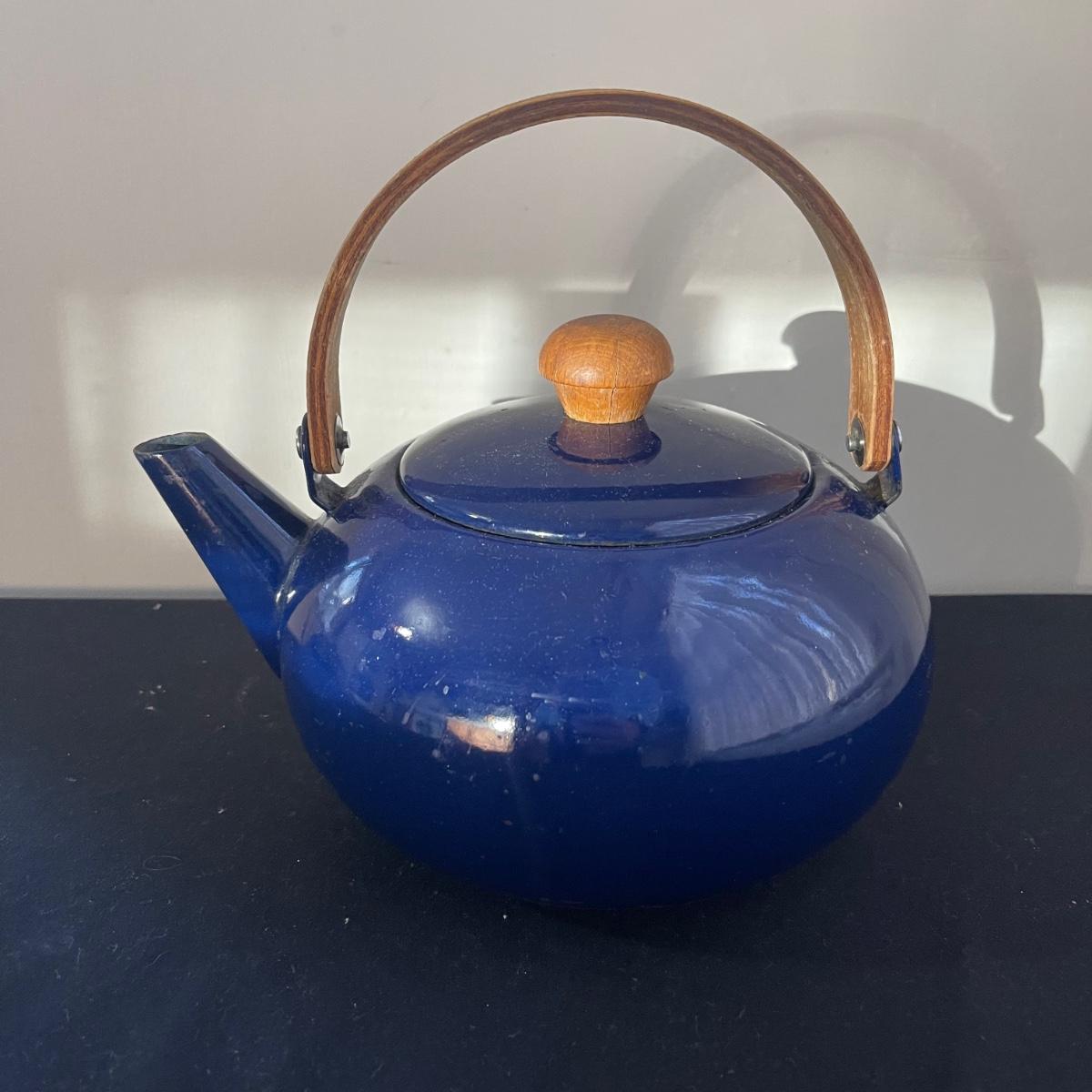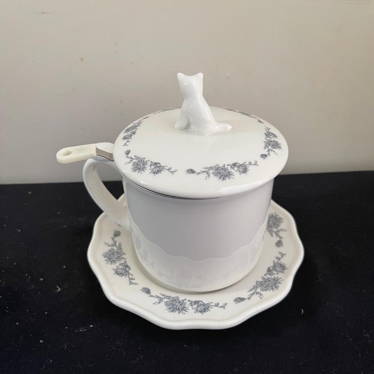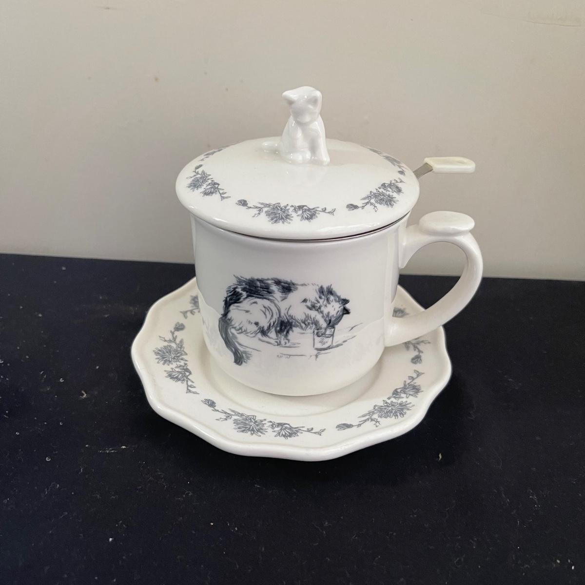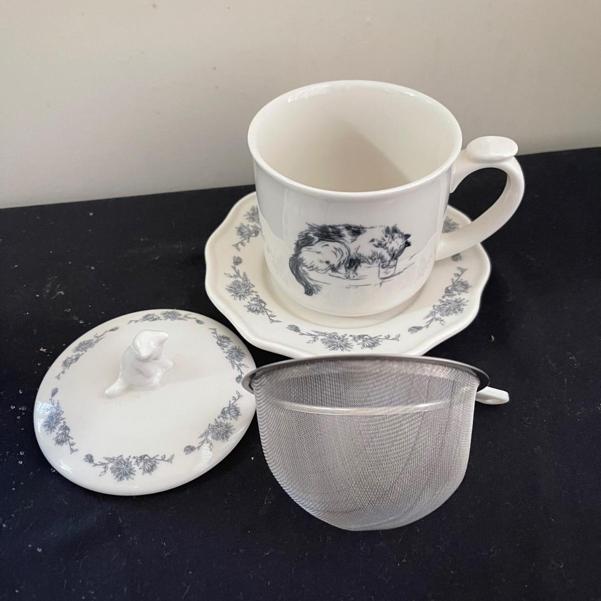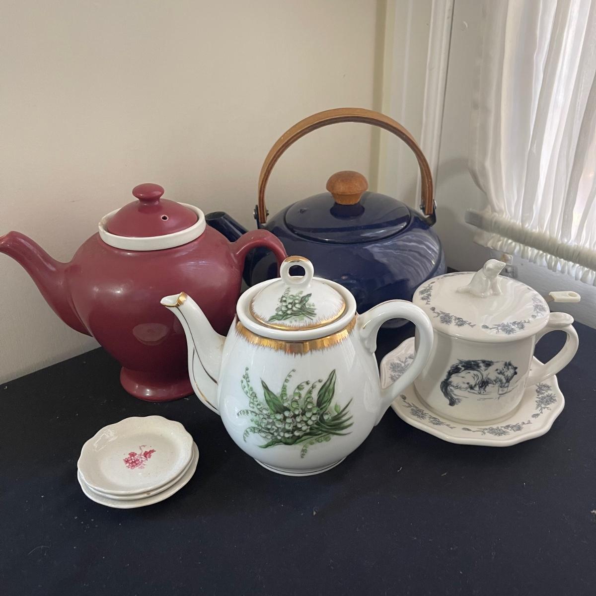 Three teapots, a teacup and saucer, and three small tea bag dishes. There is a blue enamelware tea pot, a red ceramic teapot, and a white tea pot with gold leaf detailing and a floral design. The teacup has a cat image and the saucer has a mouse.