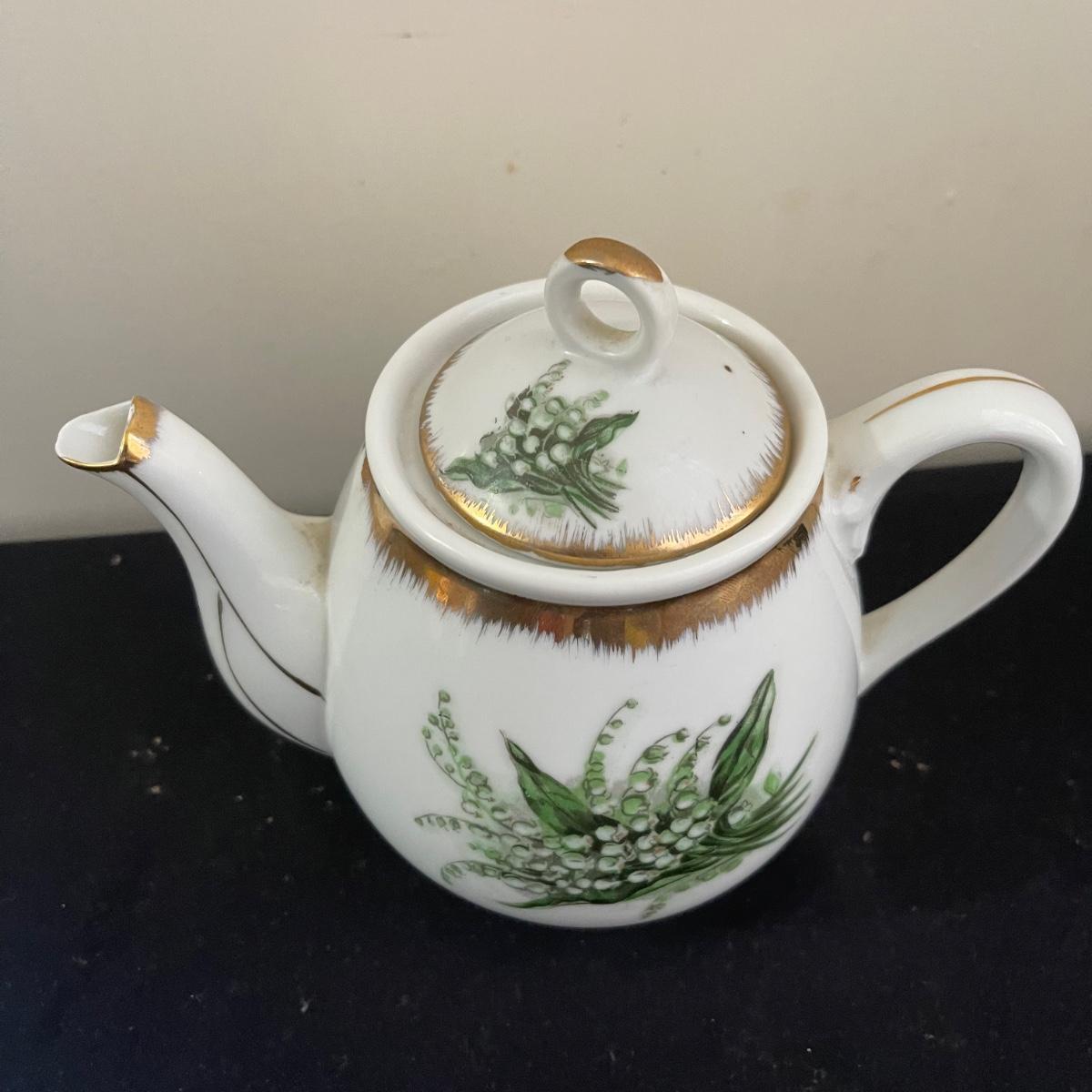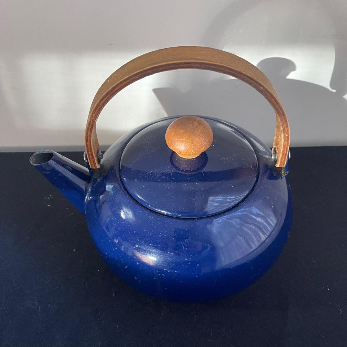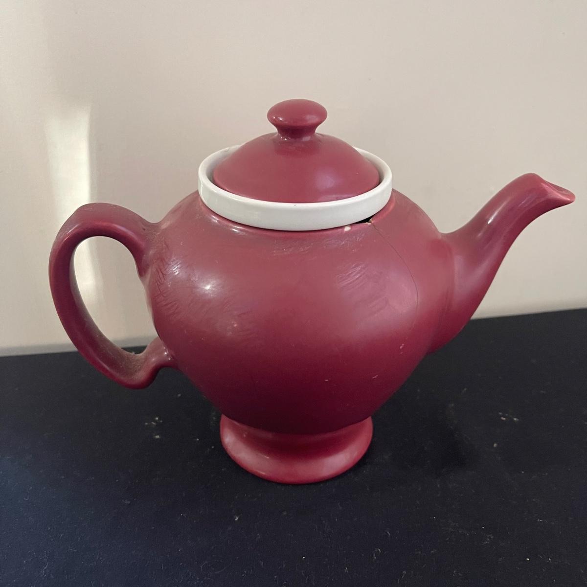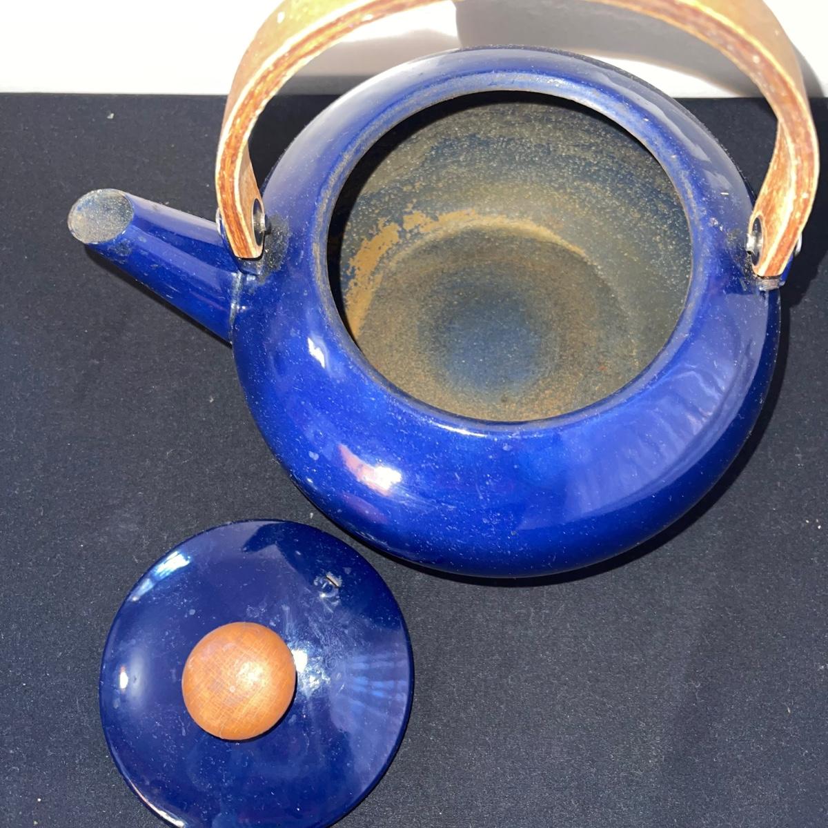Three teapots, a teacup and saucer, and three small tea bag dishes. There is a blue enamelware tea pot, a red ceramic teapot, and a white tea pot with gold leaf detailing and a floral design. The teacup has a cat image and the saucer has a mouse.