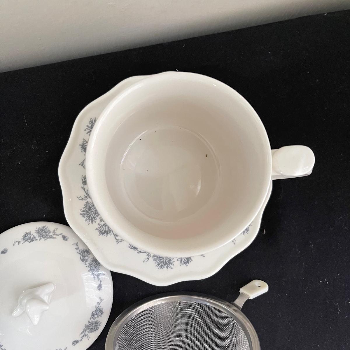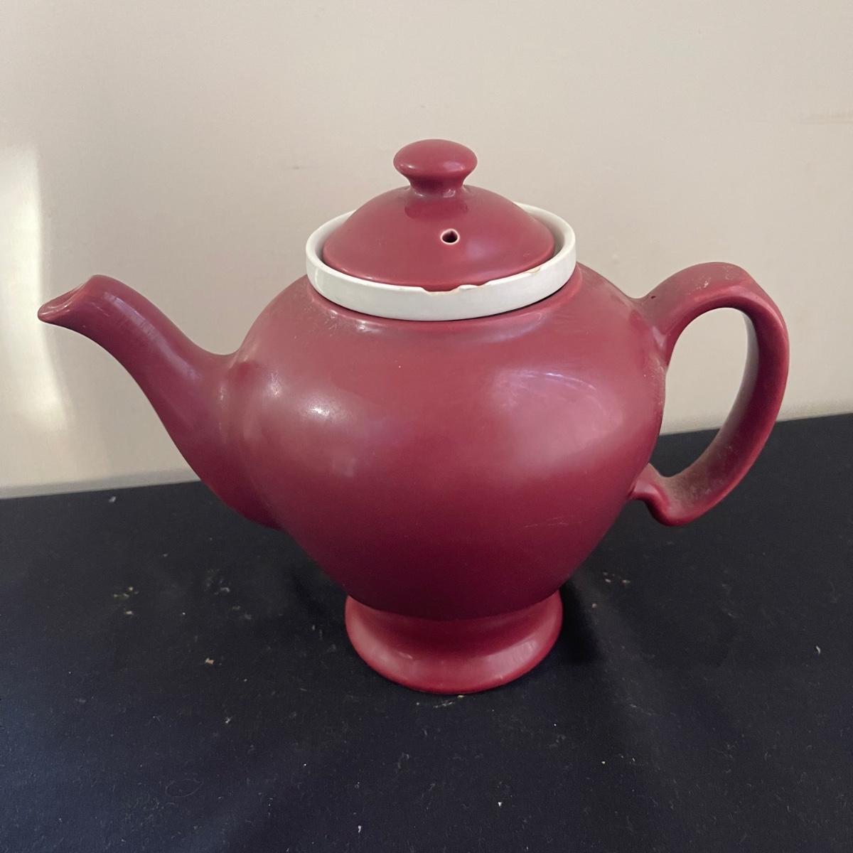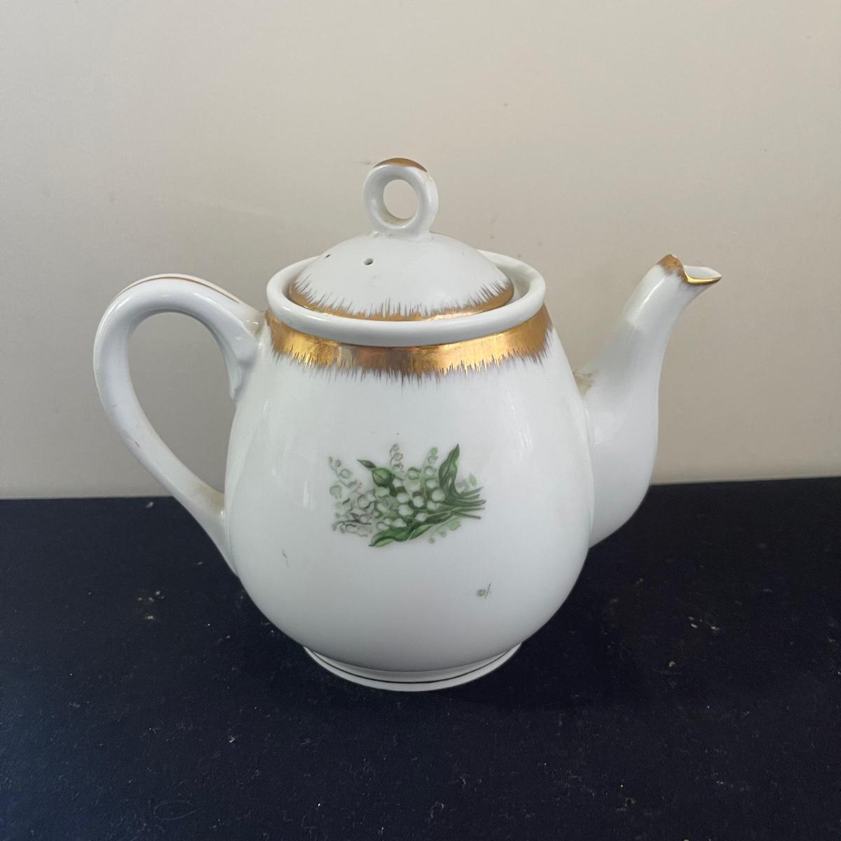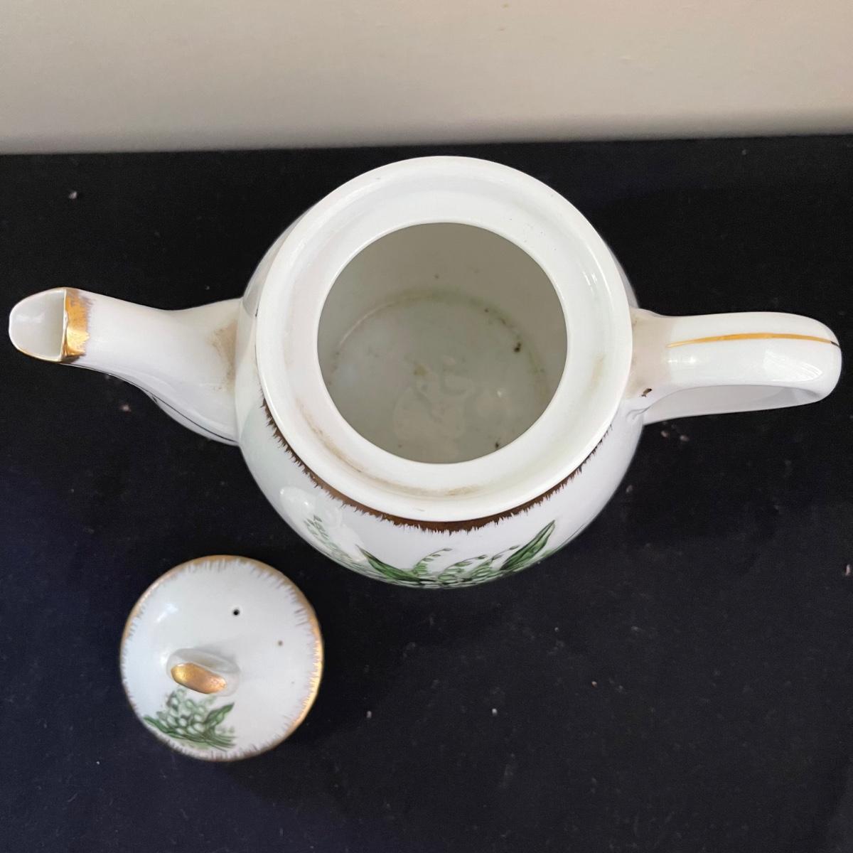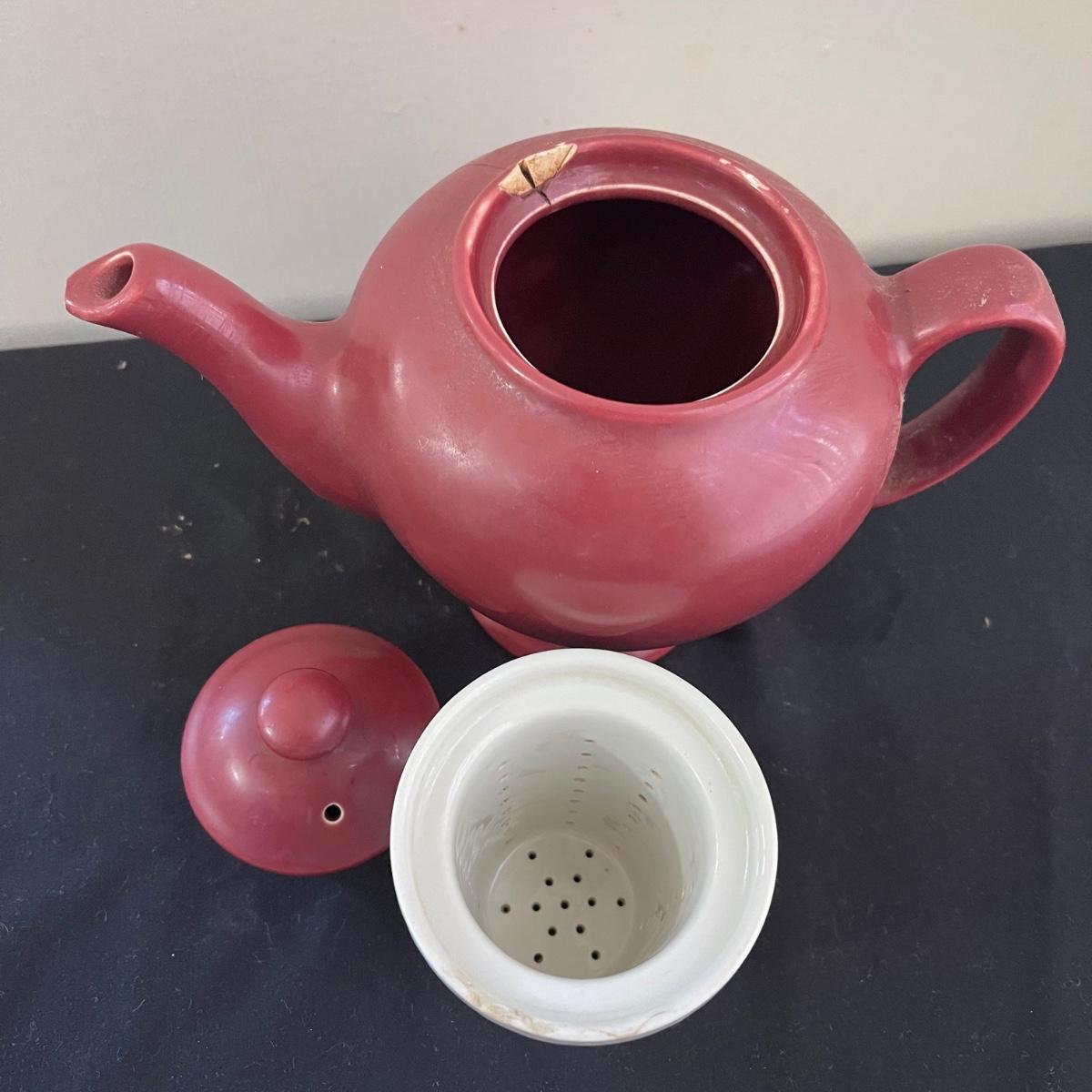 Three teapots, a teacup and saucer, and three small tea bag dishes. There is a blue enamelware tea pot, a red ceramic teapot, and a white tea pot with gold leaf detailing and a floral design. The teacup has a cat image and the saucer has a mouse.