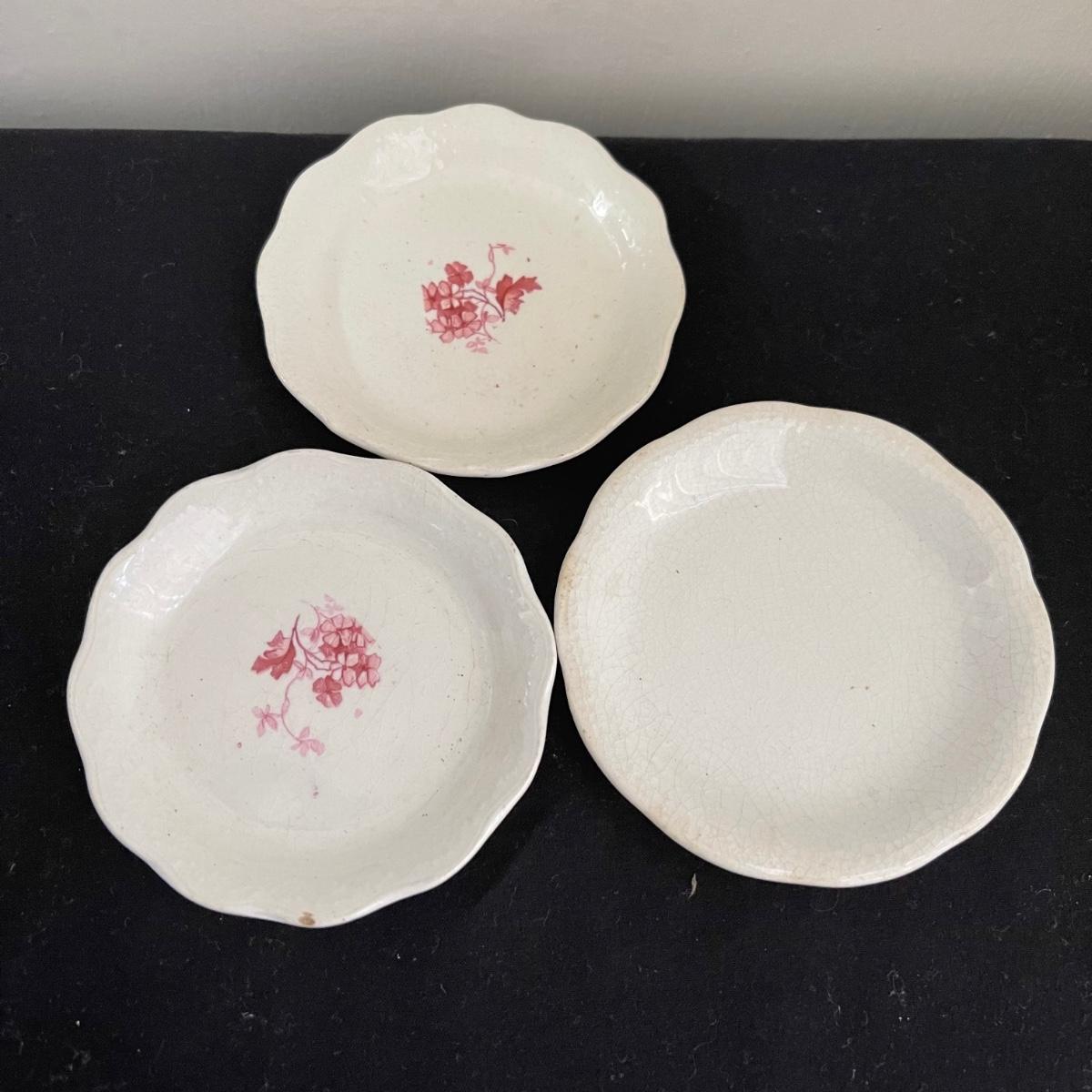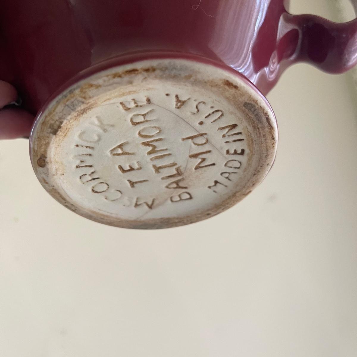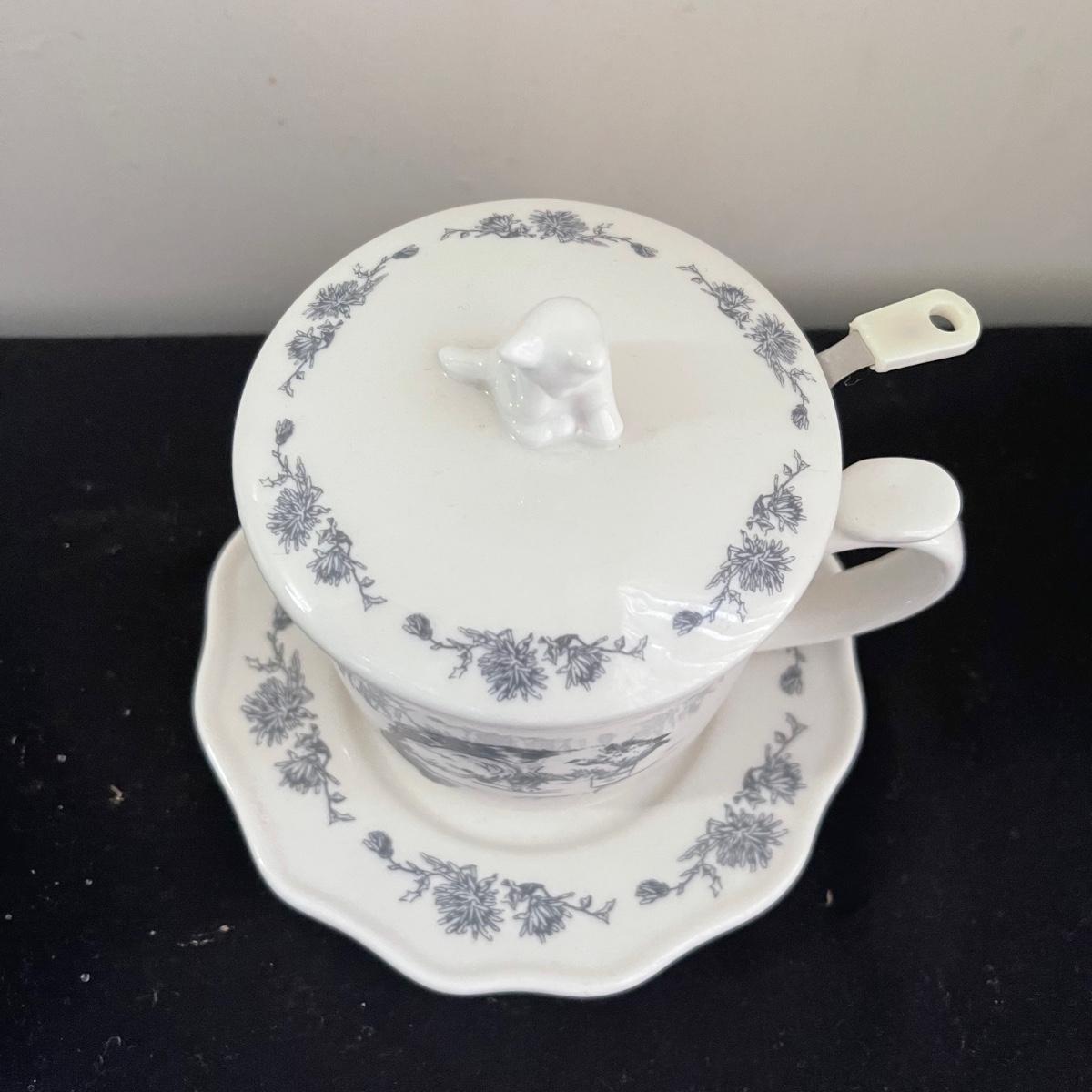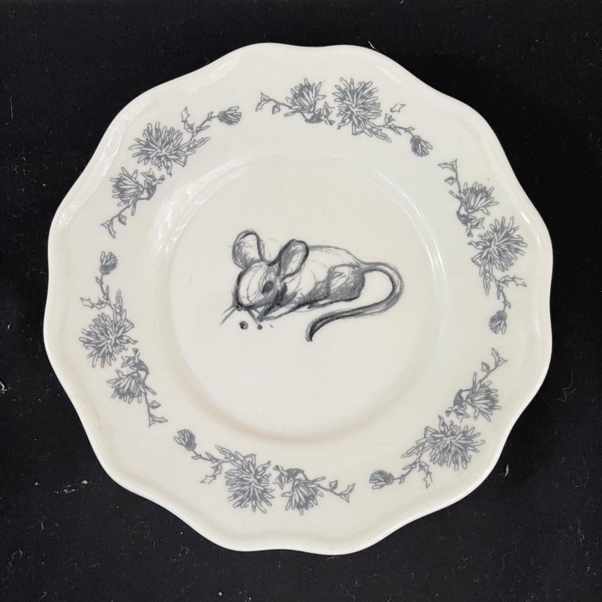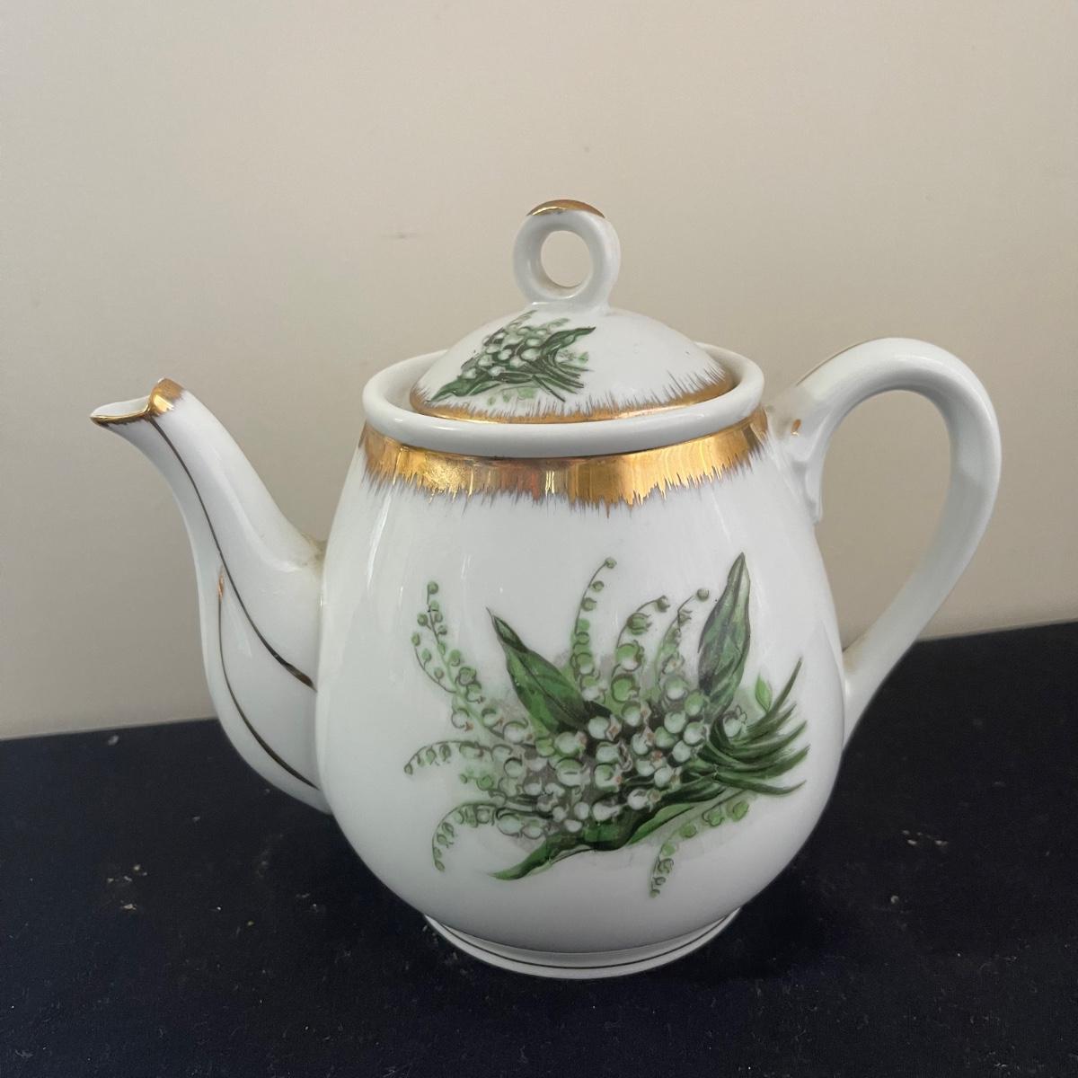 Three teapots, a teacup and saucer, and three small tea bag dishes. There is a blue enamelware tea pot, a red ceramic teapot, and a white tea pot with gold leaf detailing and a floral design. The teacup has a cat image and the saucer has a mouse.