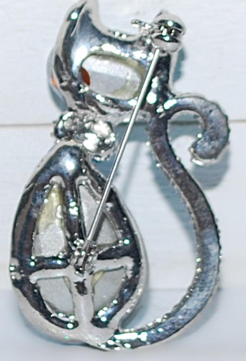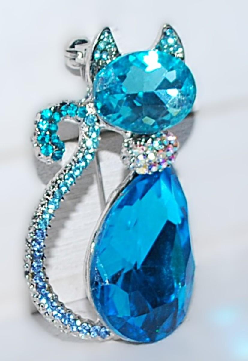 Teardrop Beveled Bejeweled BLUE CAT BROOCH (2" x 1¼") with Collar, Ears & Tail Accent Stones on a Silver Tone Setting
