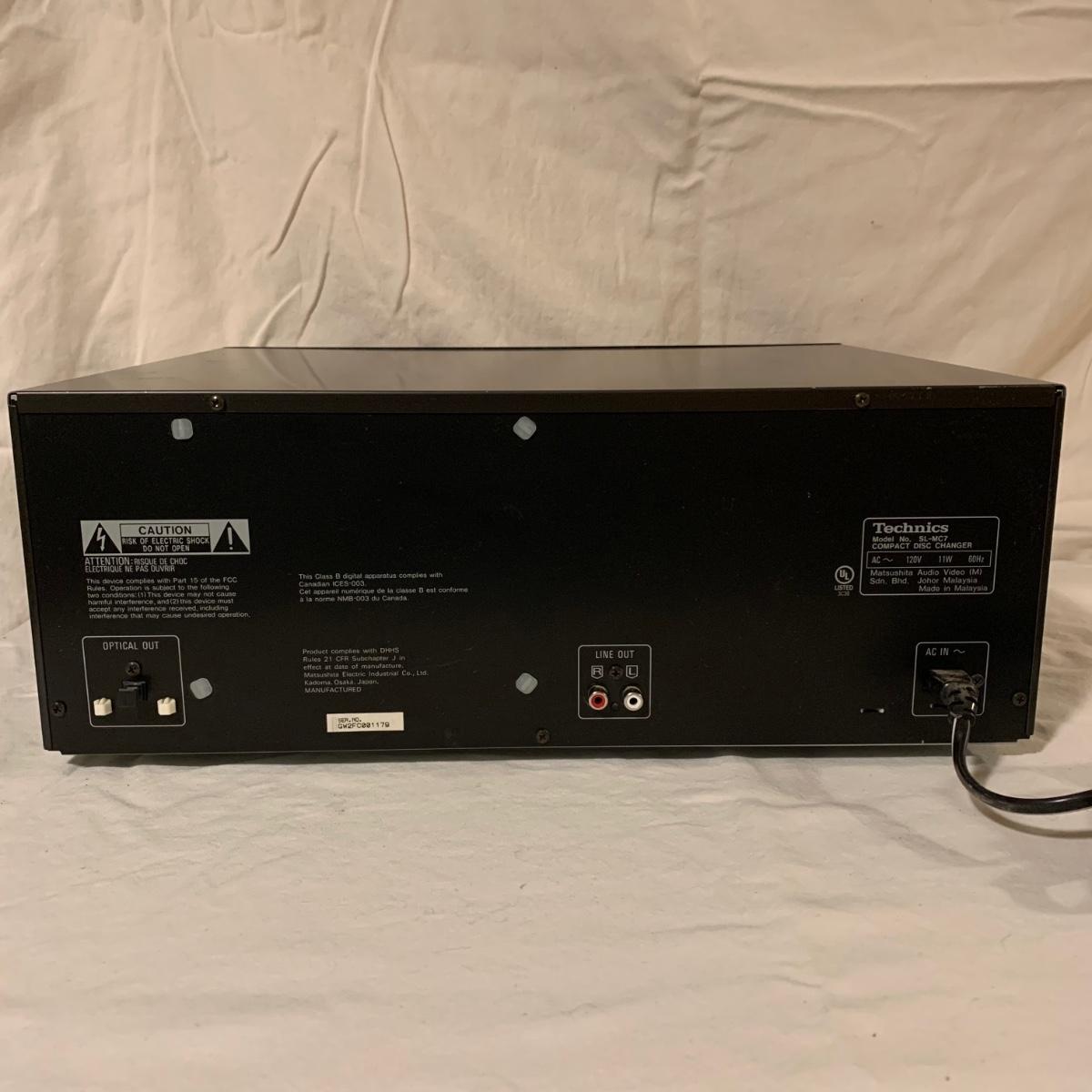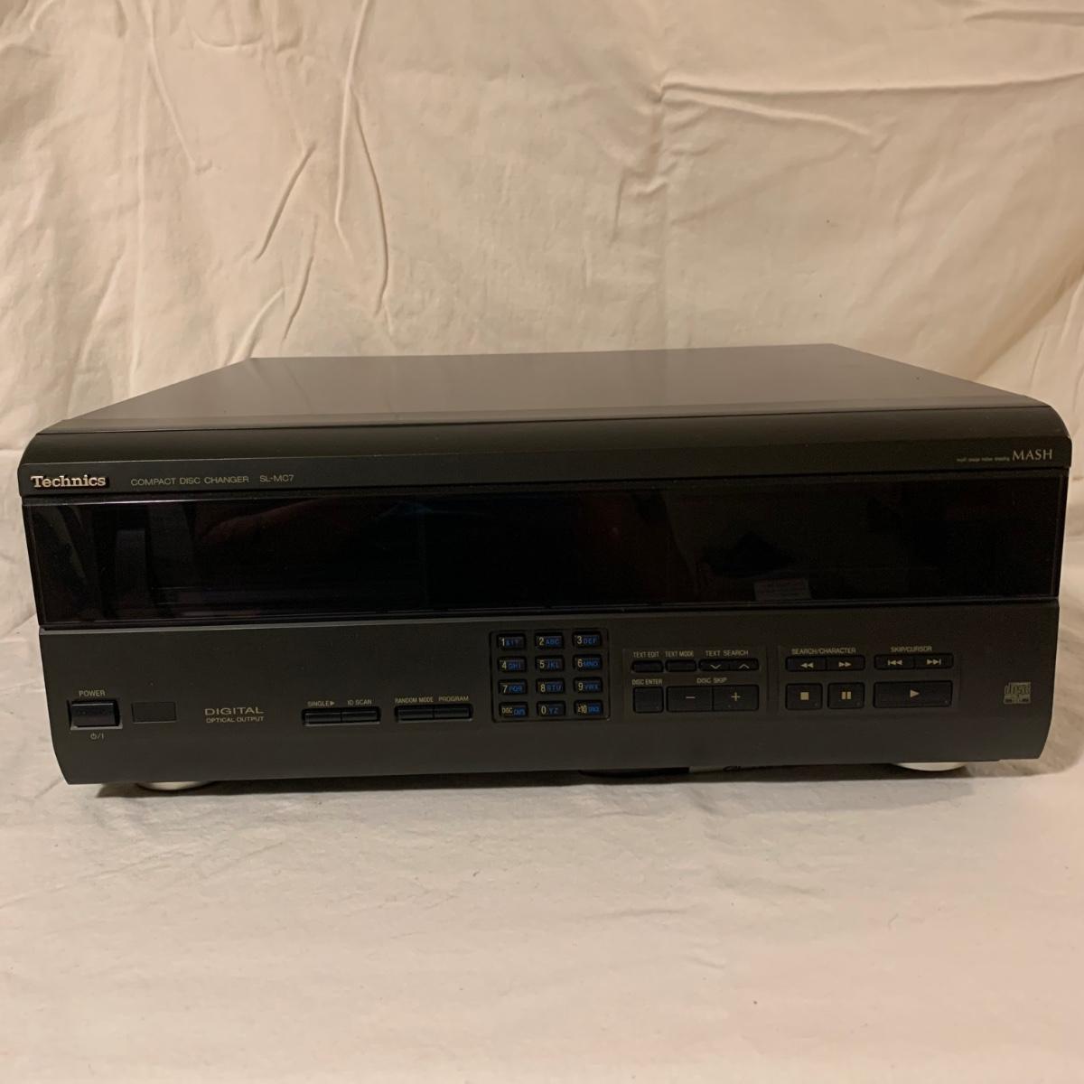 Technics SL-MC7 disc changer with remote, manual, and AV cord. Unit powers on and measures approximately 17” x 15” x 6.5”H. Please see photos for more details.