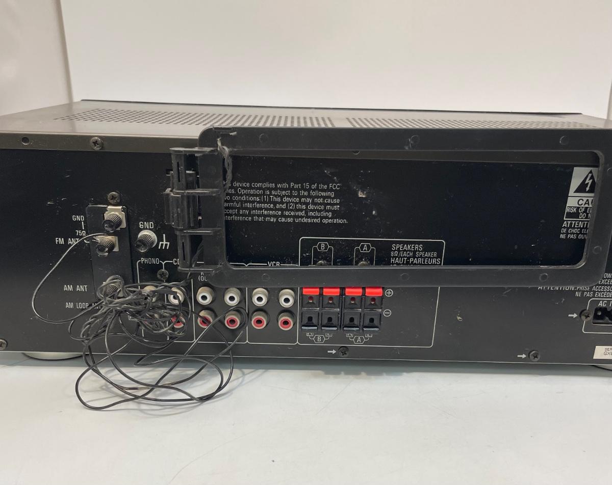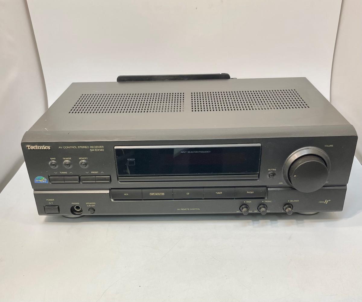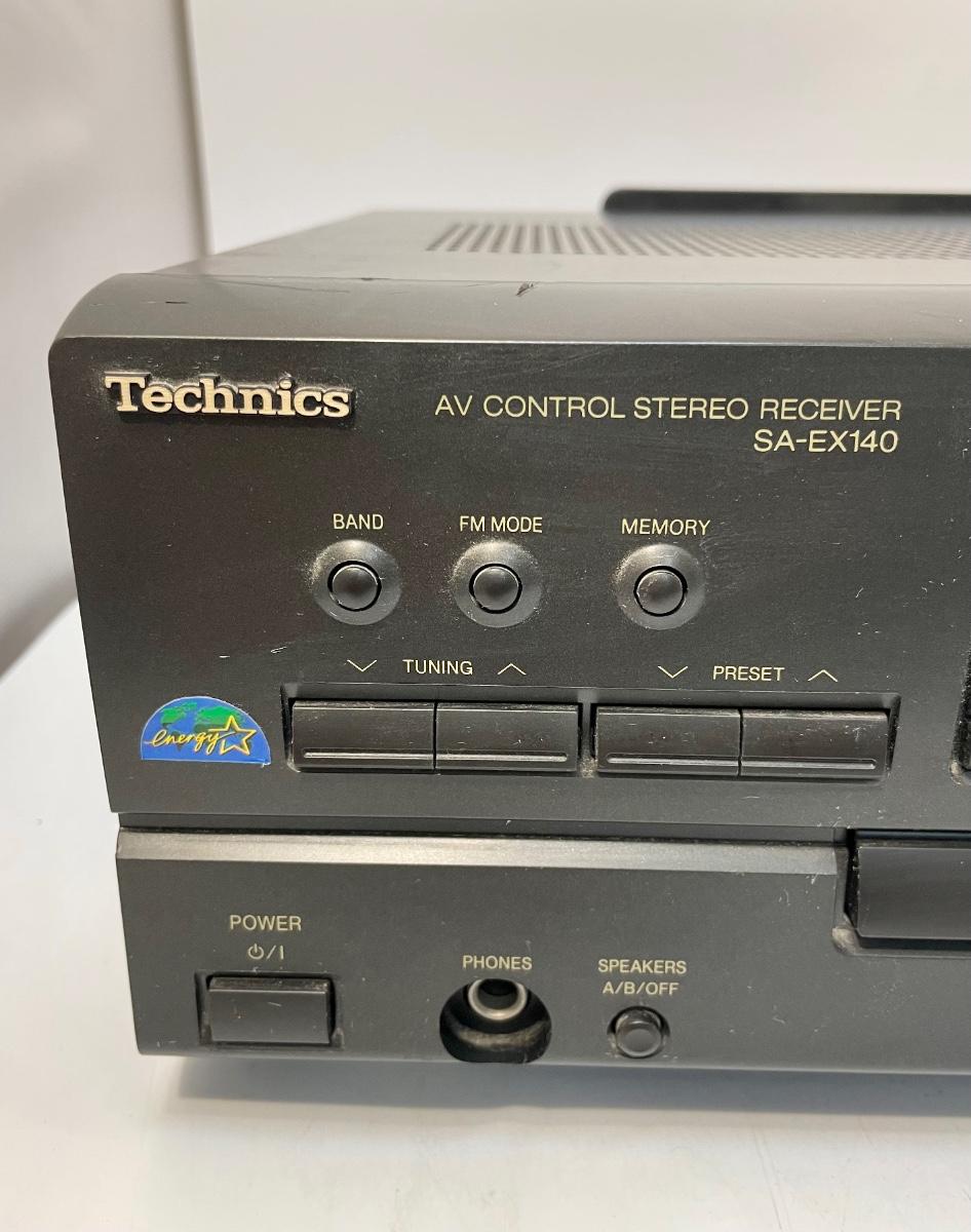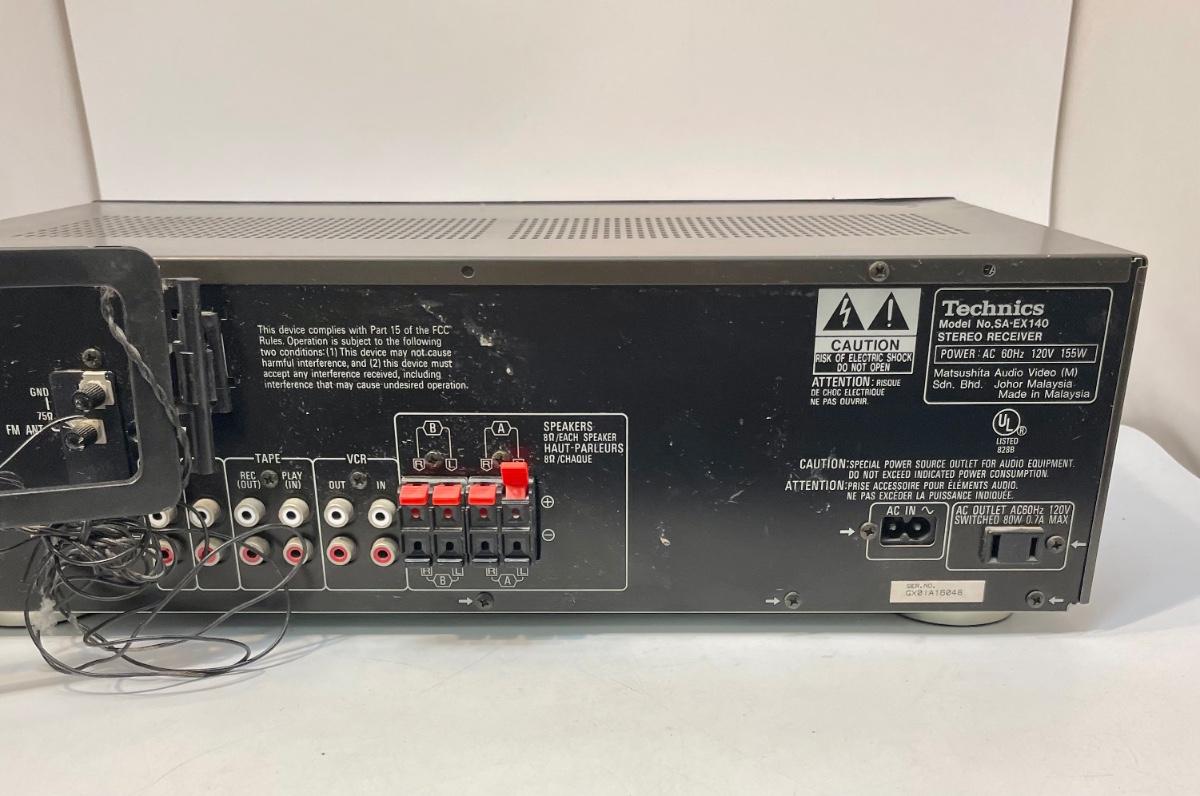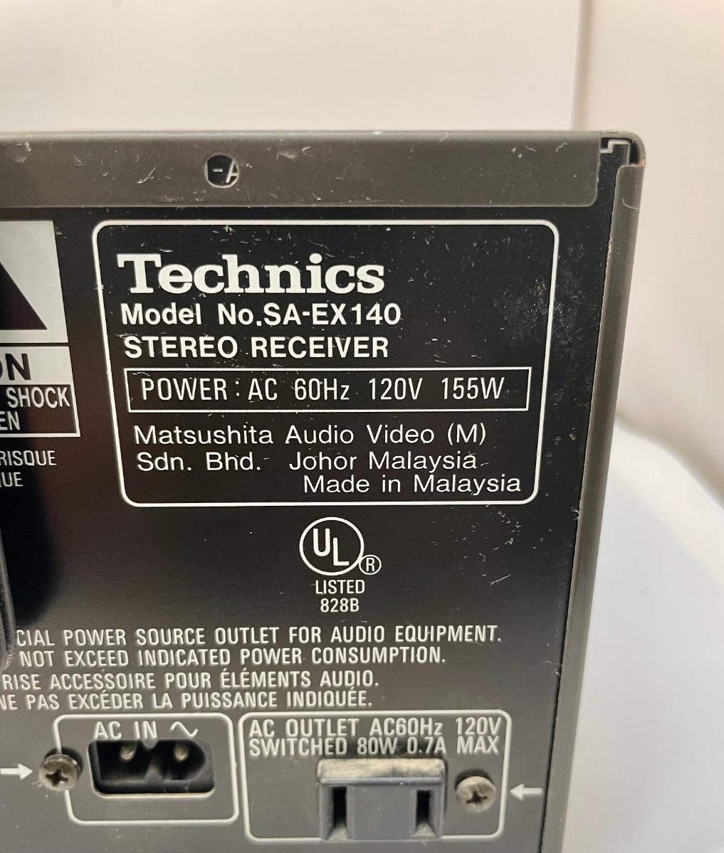 Technics Stereo Receiver Model SA-EX 140, made in Malaysia by Matsushita Audio Video. NOTE: Unit has been tested (powers up and switches between functions) but was not connected to speakers to evaluate sound output. It is missing the original remote control and the original power cord. AM-FM antennas are both connected and included.