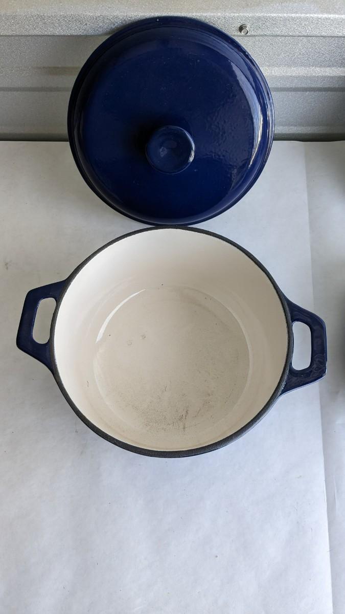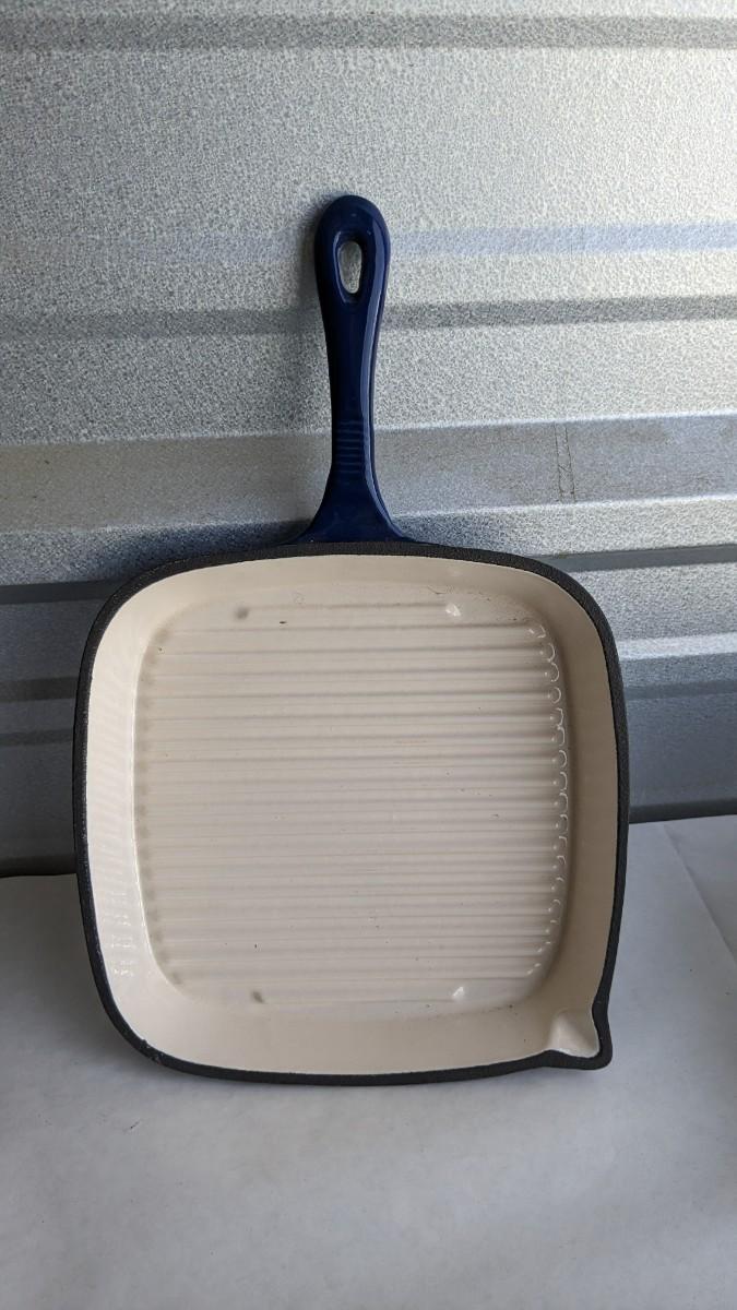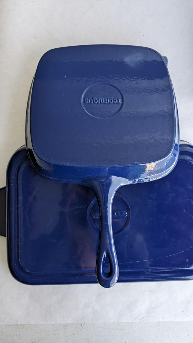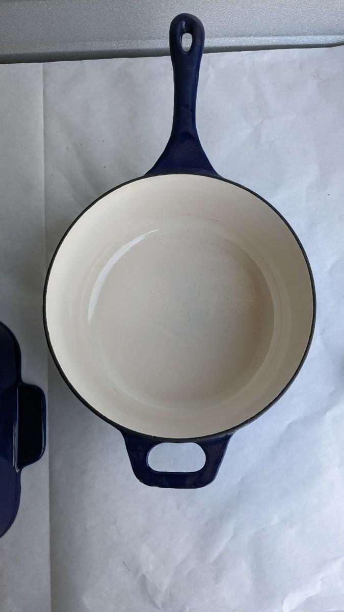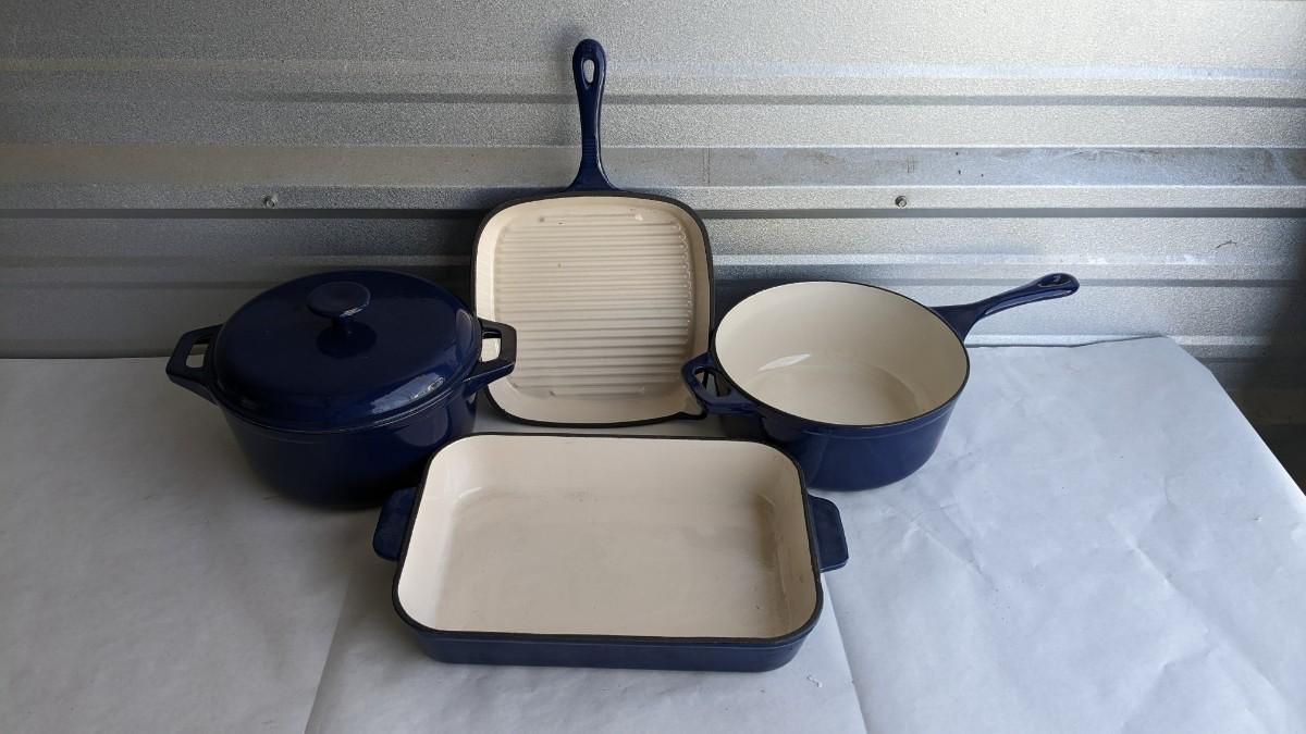 Beautiful blue cast iron cookware, 4 cooking pieces with interchangeable lid for 9.25" saute pan and dutch oven. Casserole dish is approximately 12."x9". And 9" griddle pan with pour spout perfect for bacon. This set needs a wash and is ready to go after that. Minimal wear found on casserole dish and lid, please note in photos. This set is incredibly heavy, please keep in mind if requesting shipping. 2616