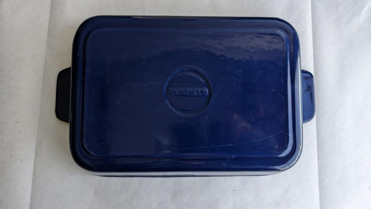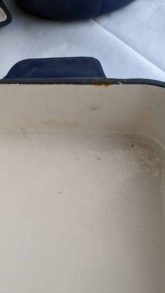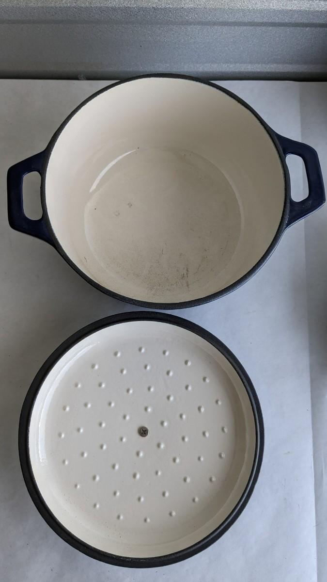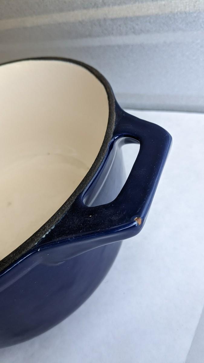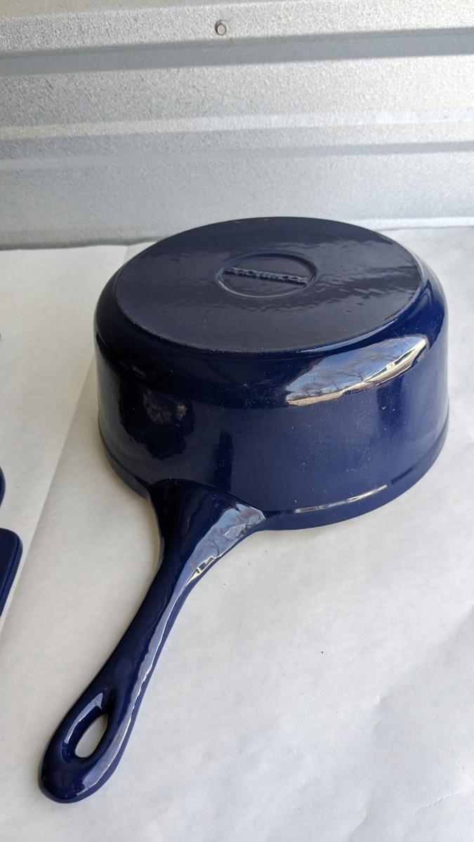 Beautiful blue cast iron cookware, 4 cooking pieces with interchangeable lid for 9.25" saute pan and dutch oven. Casserole dish is approximately 12."x9". And 9" griddle pan with pour spout perfect for bacon. This set needs a wash and is ready to go after that. Minimal wear found on casserole dish and lid, please note in photos. This set is incredibly heavy, please keep in mind if requesting shipping. 2616