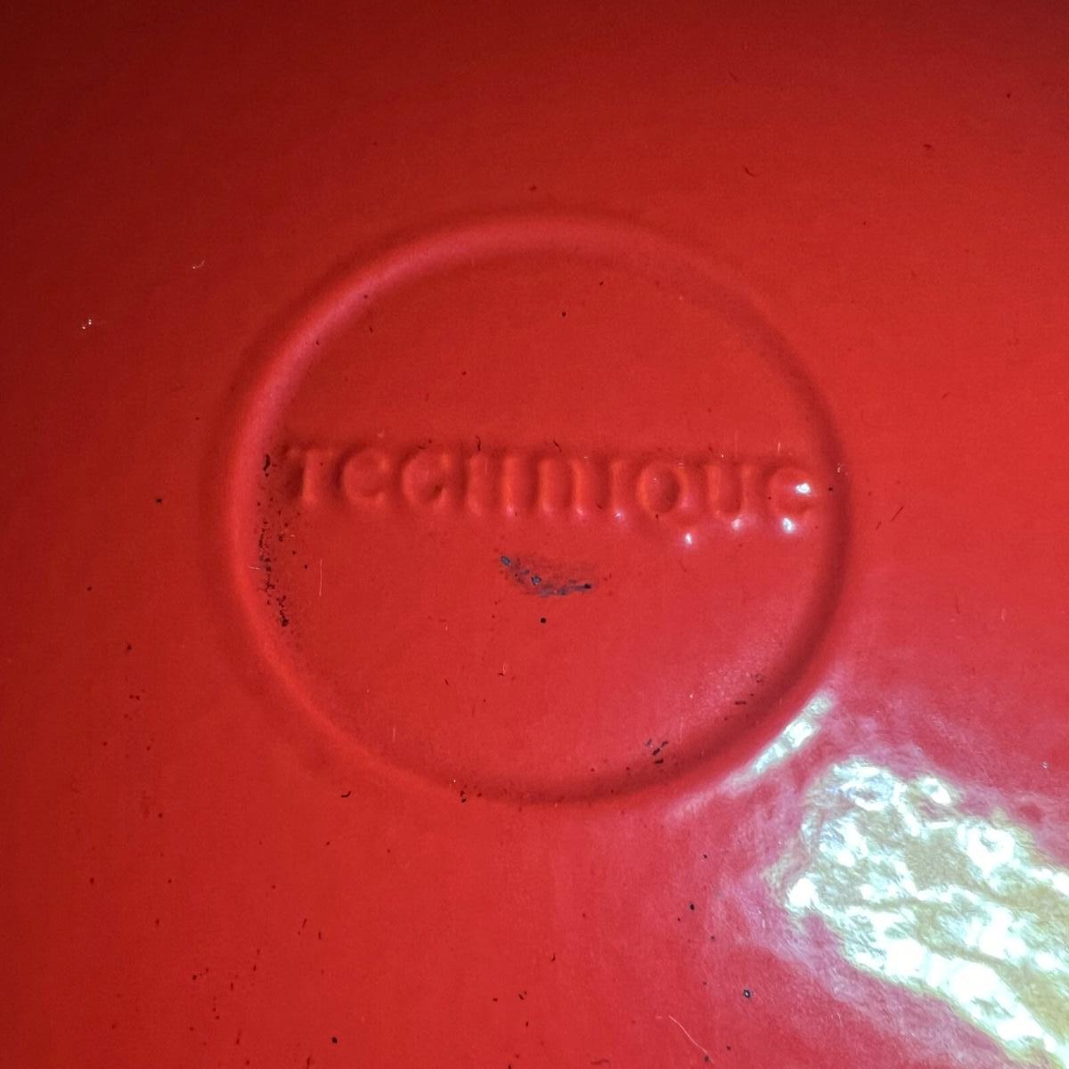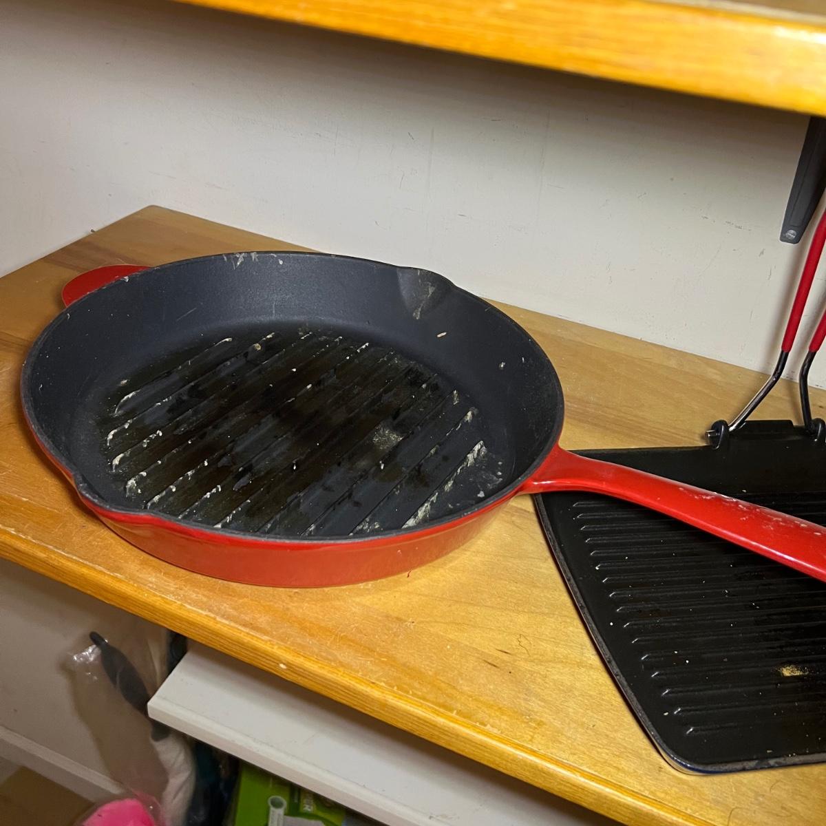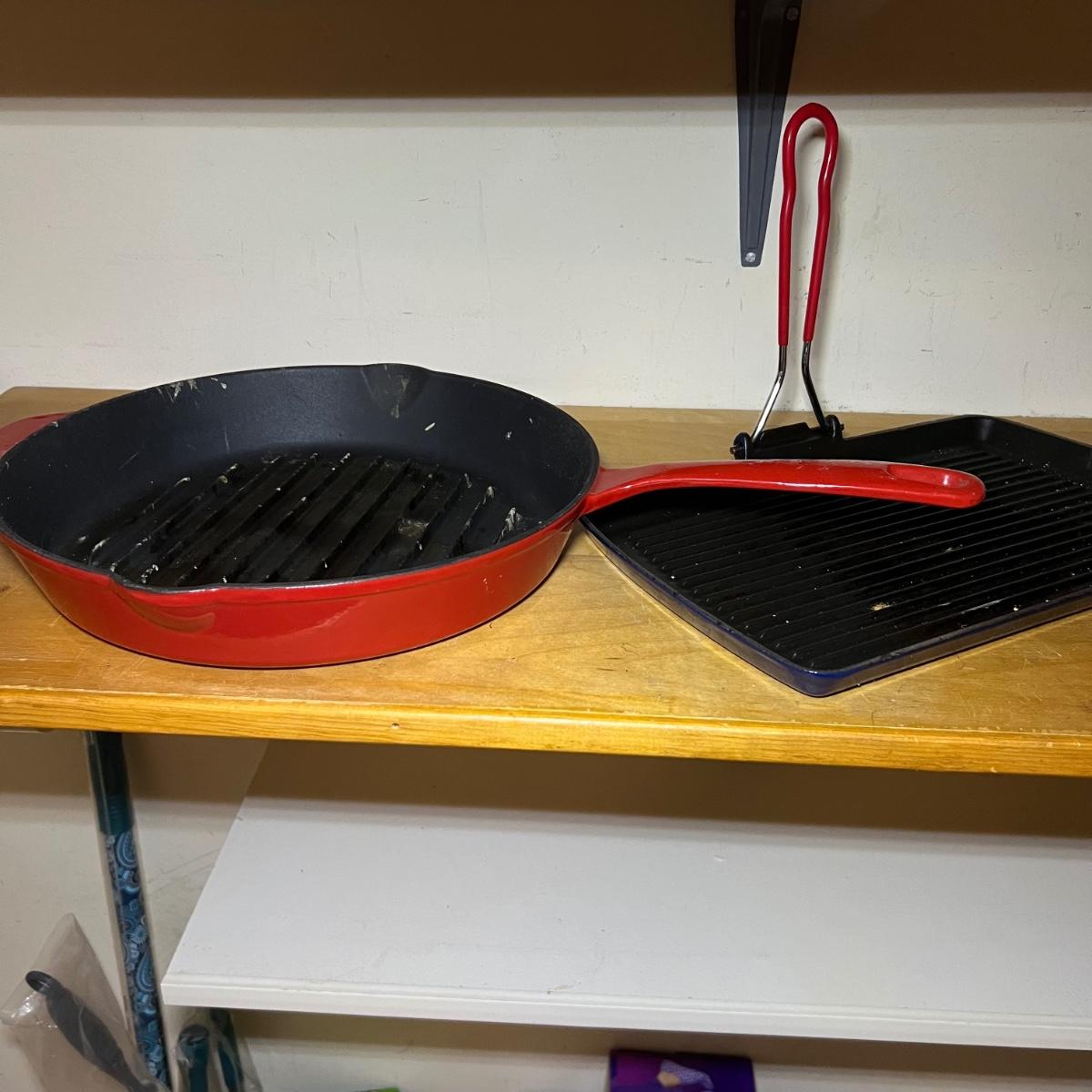 Two enameled cast iron pans includes a red Technique that measures 12”D x 2”H. The other griddle pan has a collapsible handle and is stamped ‘France’. Both pans show wear and need a good cleaning, see images.
