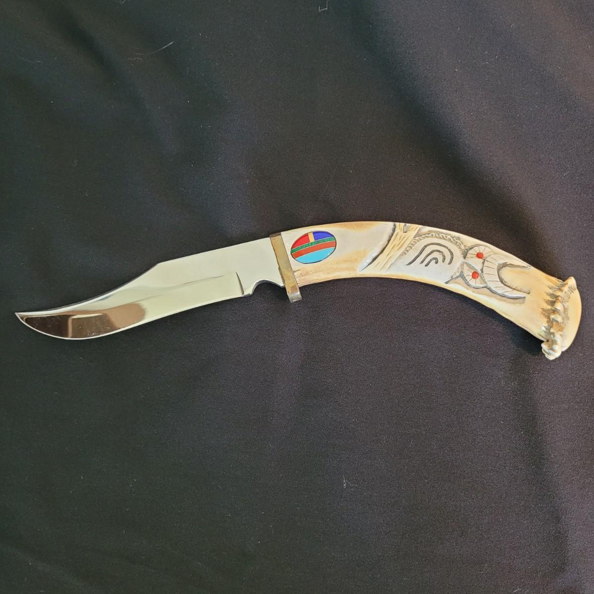 This lot includes what appears to be an original knife by Arizona artist Ted Miller. Ted Miller is a renowned Cherokee knife maker of Miami-Peoria-Cherokee heritage, which shows in his work. The knife is carved from natural materials and features inlays of what appears to be gemstones such as malachite, lapis lazuli, and coral. The carving depicts an owl with bright red eyes. The knife is mounted in a beautiful natural material mount and can be displayed nicely. This knife is razor sharp and appears to have been cared for very well.