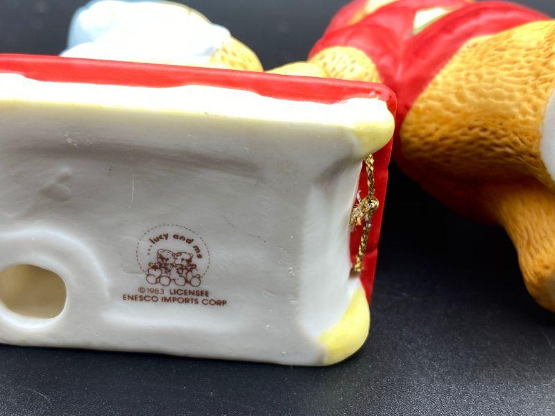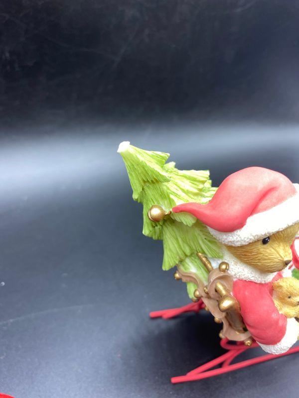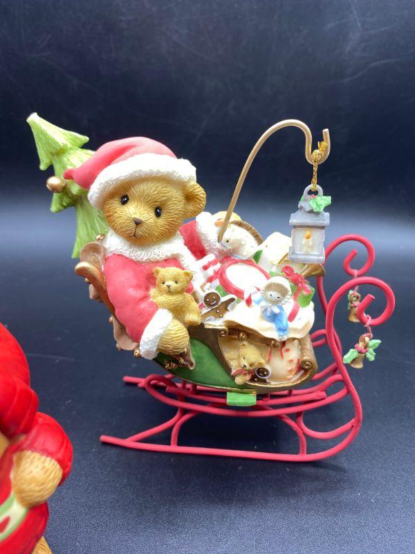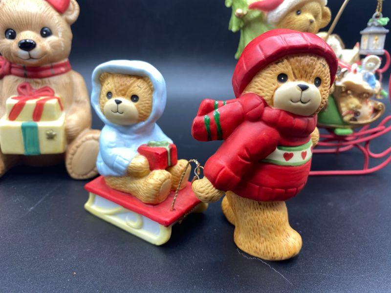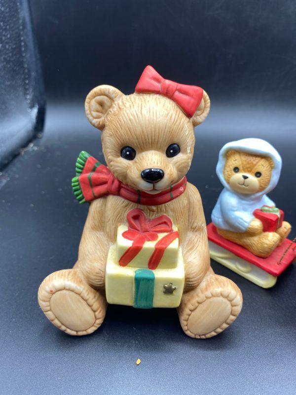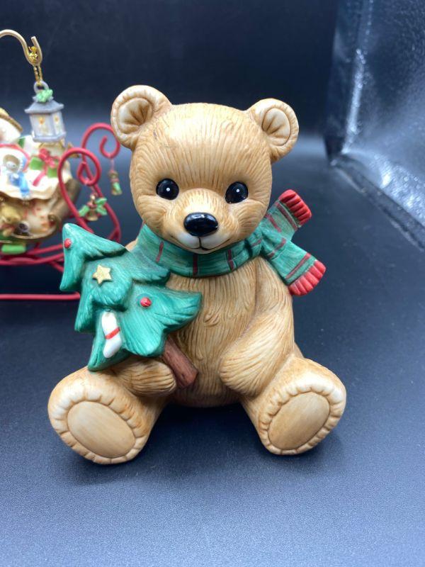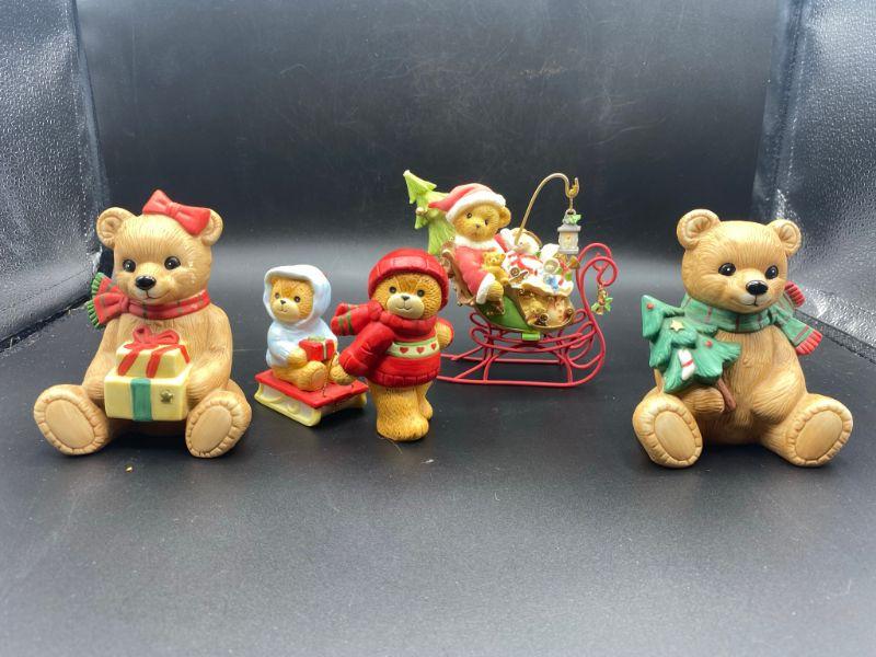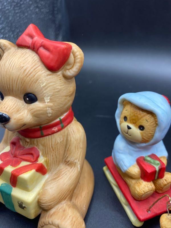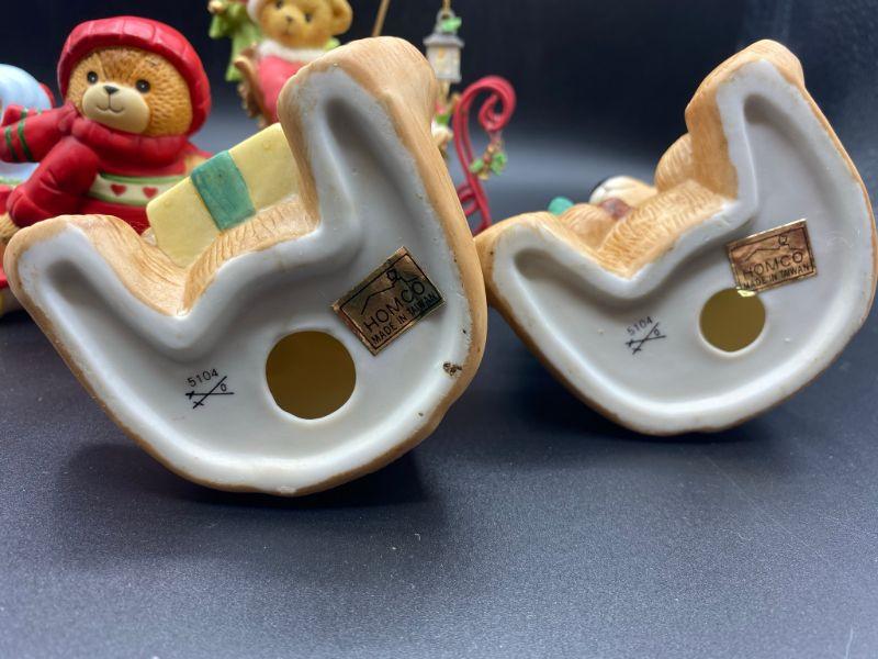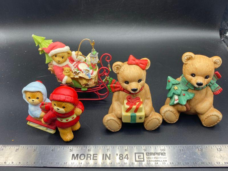 4 holiday teddy bear figurines. Cute addition to any decor. The tree tip is broken, unnoticeable at a glance.