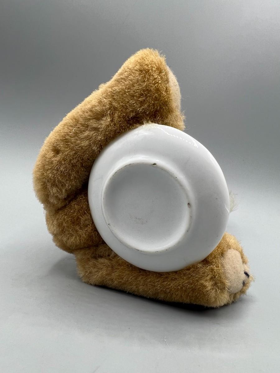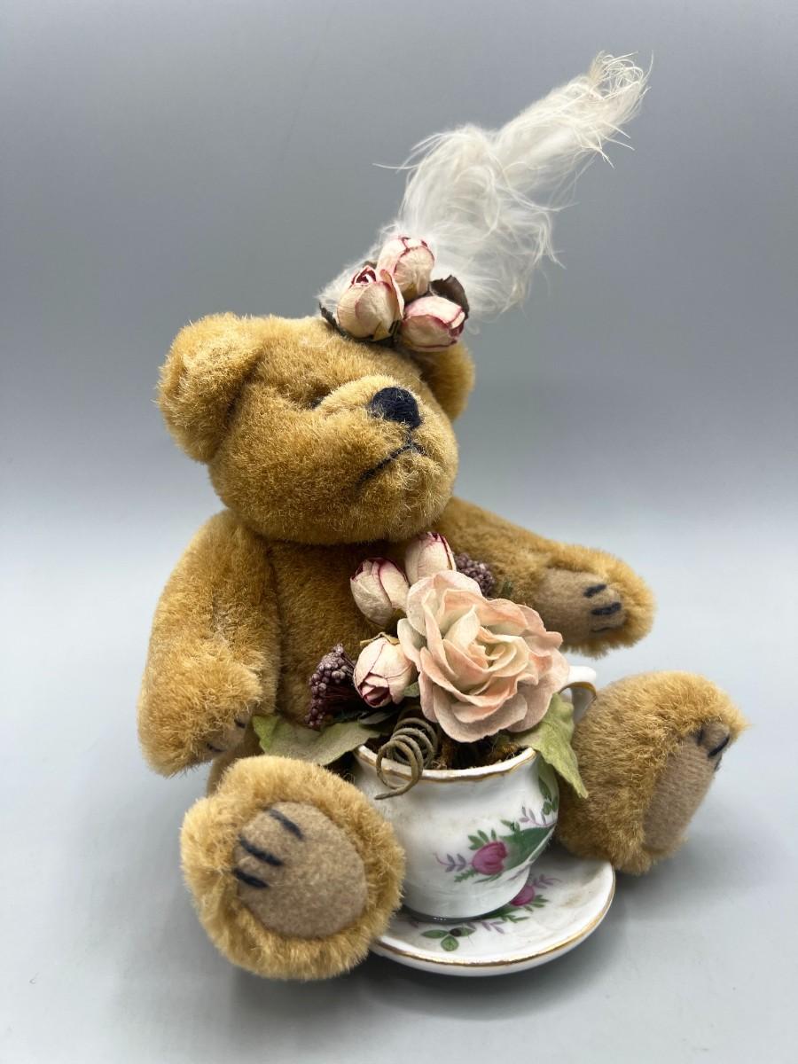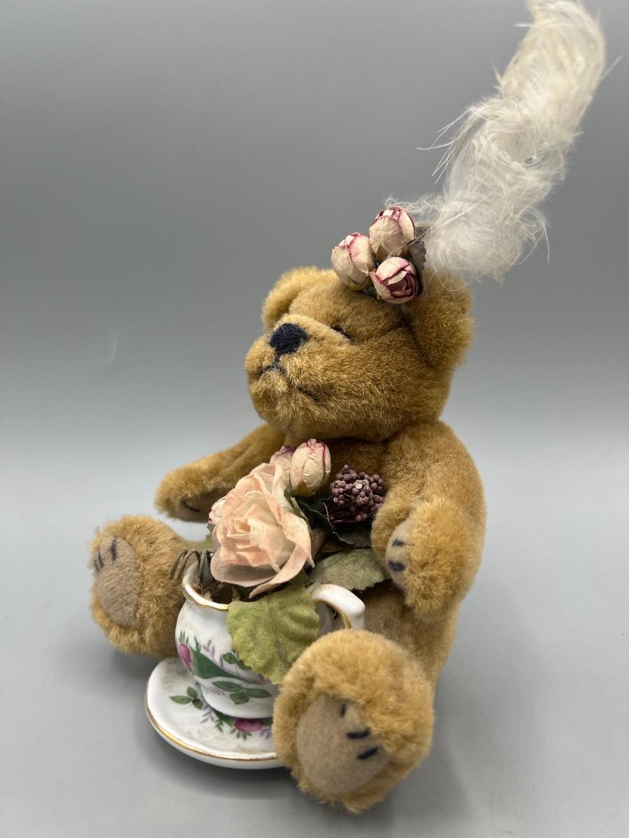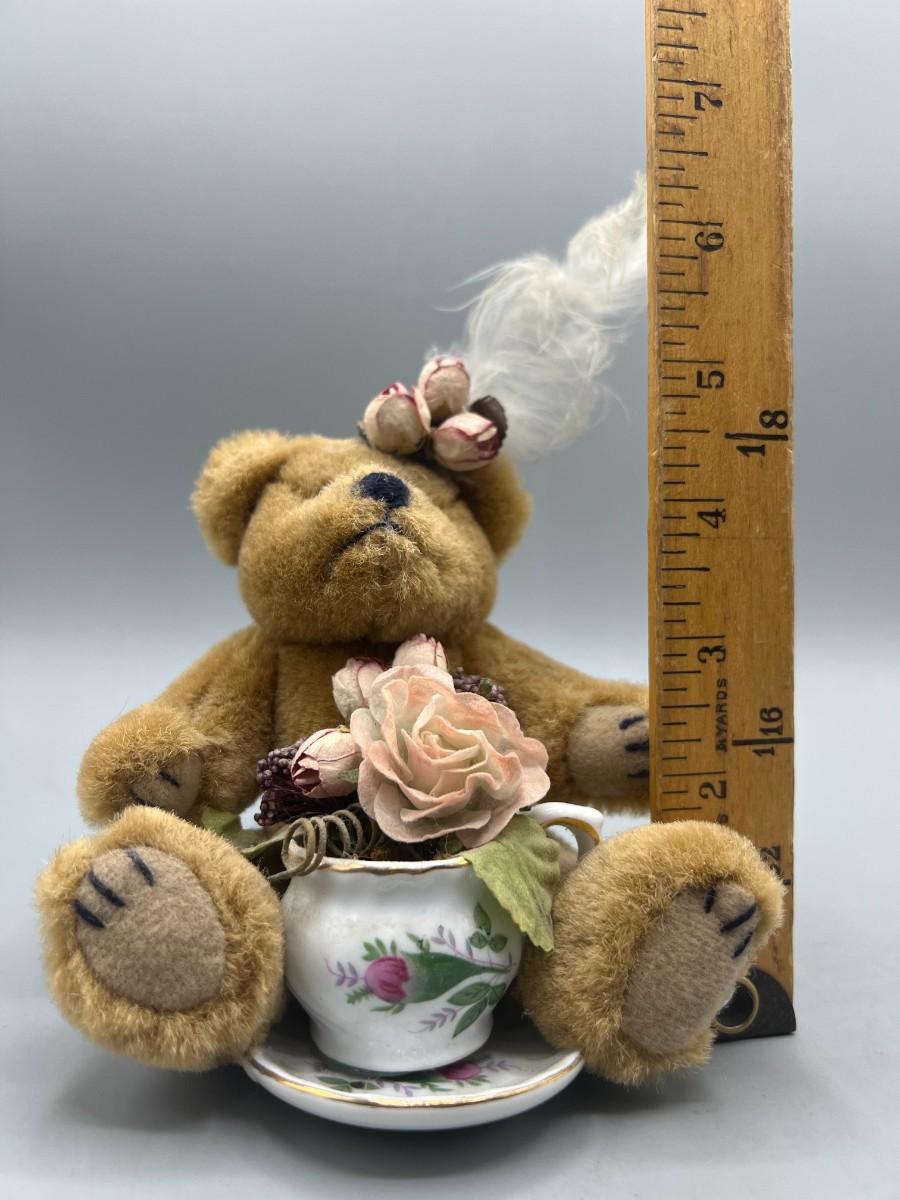 Teddy Bear Plush Animal Doll with Flowers and Teacup Figurine. Under 5" size. May be dusty from display.