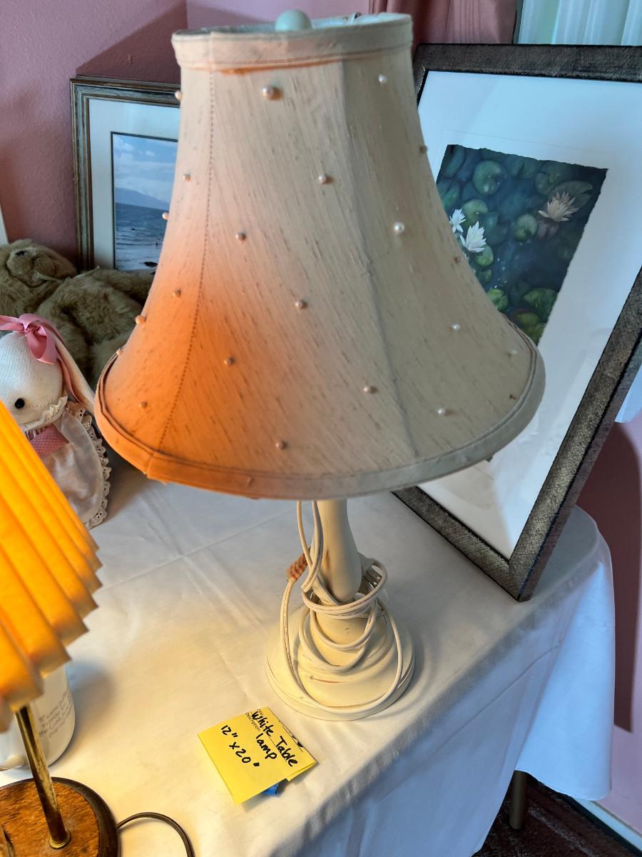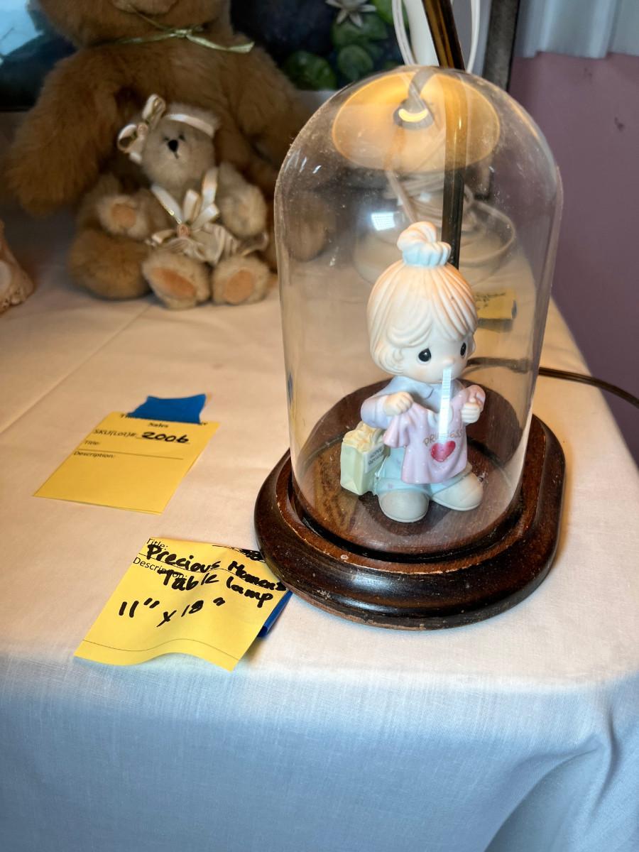 Teddy bears, Precious Moments lamp, Precious Moments mug, ceramic roses in an etched glass dish, Bamboo covered tac board, rattan pail, White table light, 2 framed and matted art works.